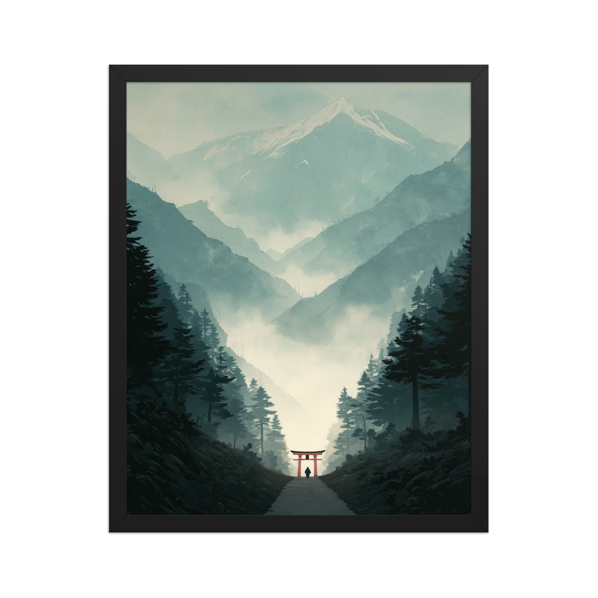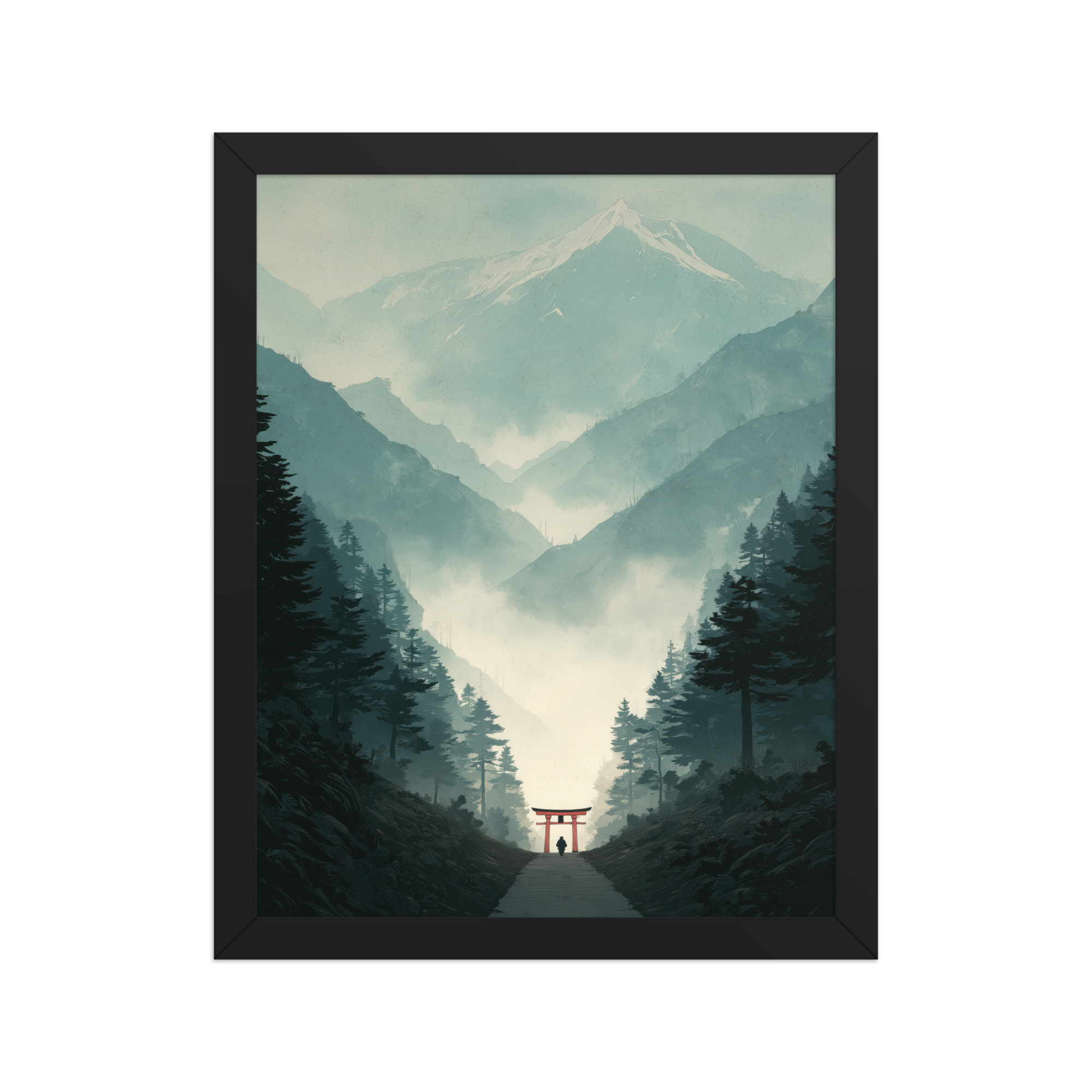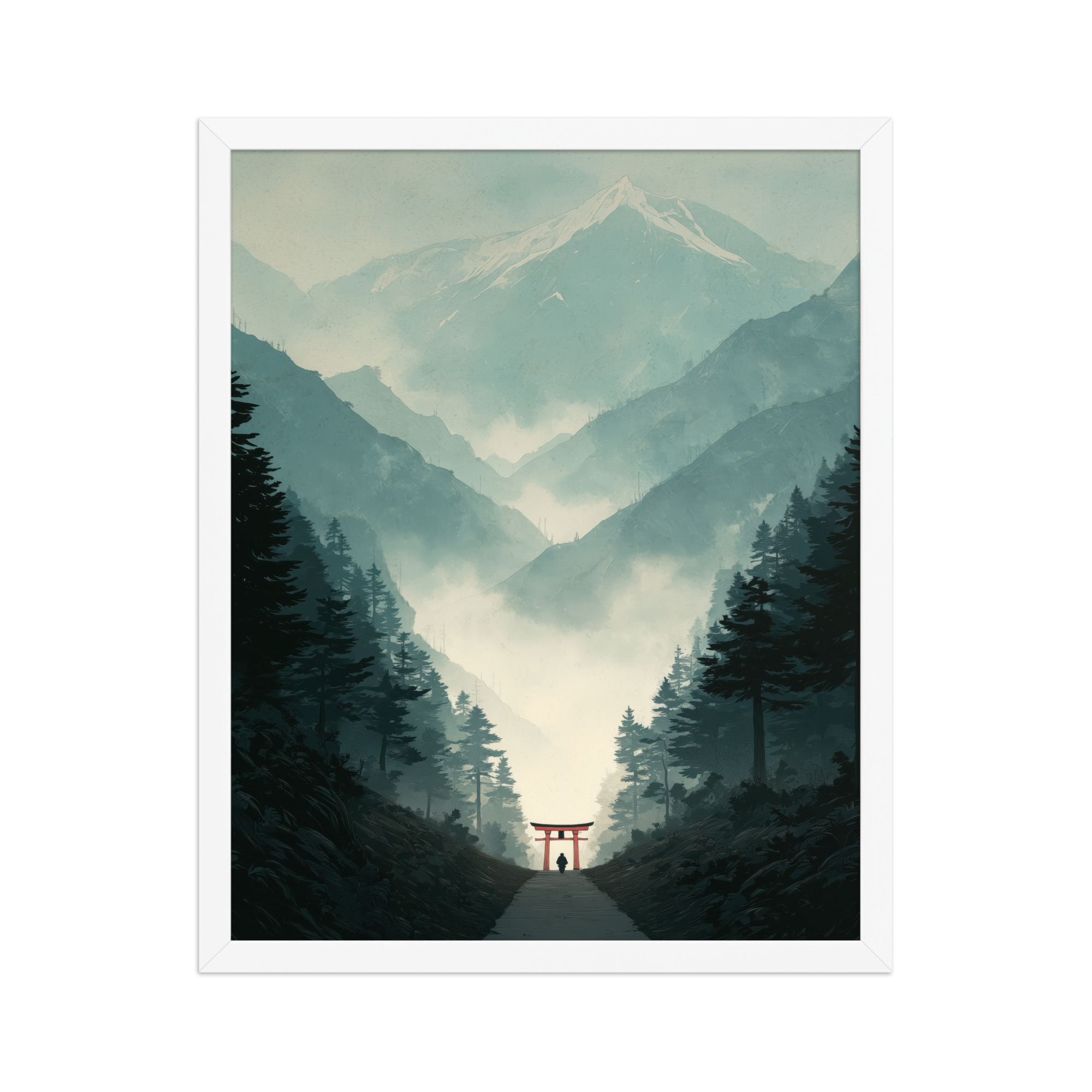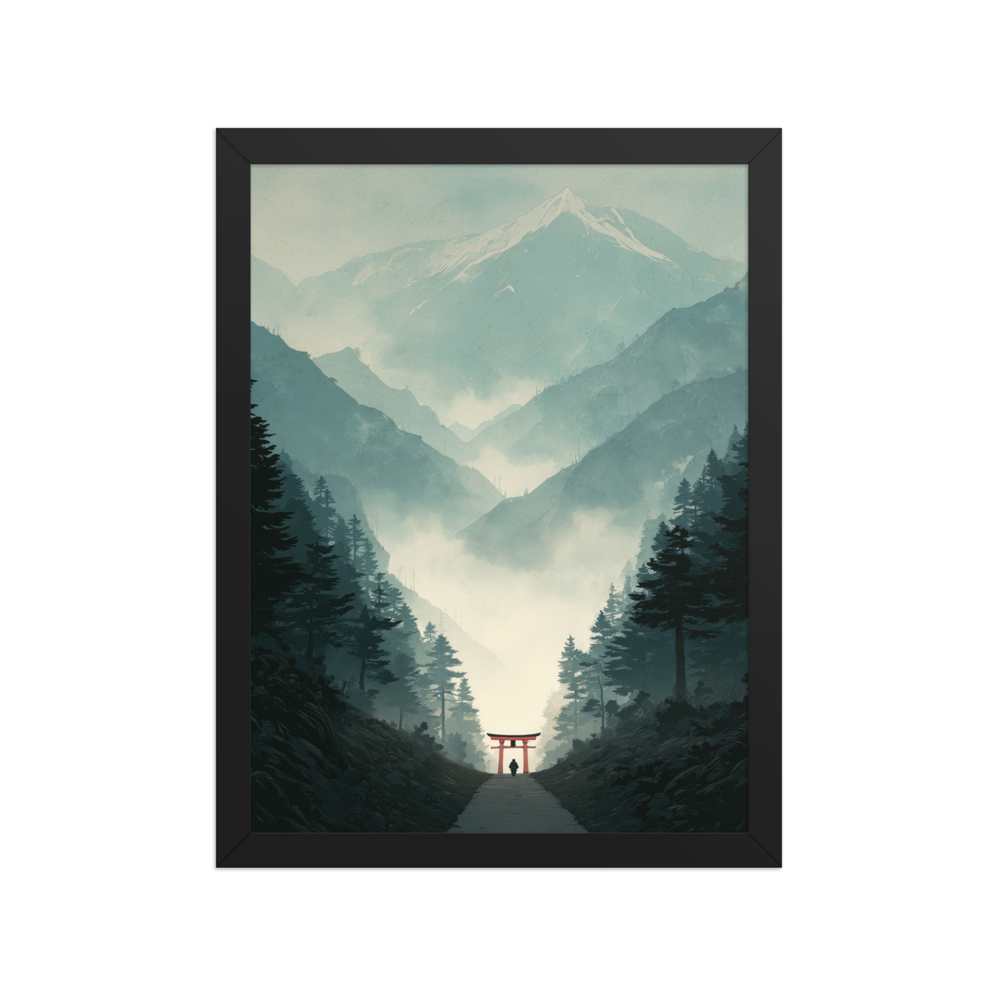A quiet mountain pass opens toward a lone torii gate, its vermilion silhouette glowing through layered mist. The soft gradients and woodblock-style textures evoke calm passage, reflection, and arrival.