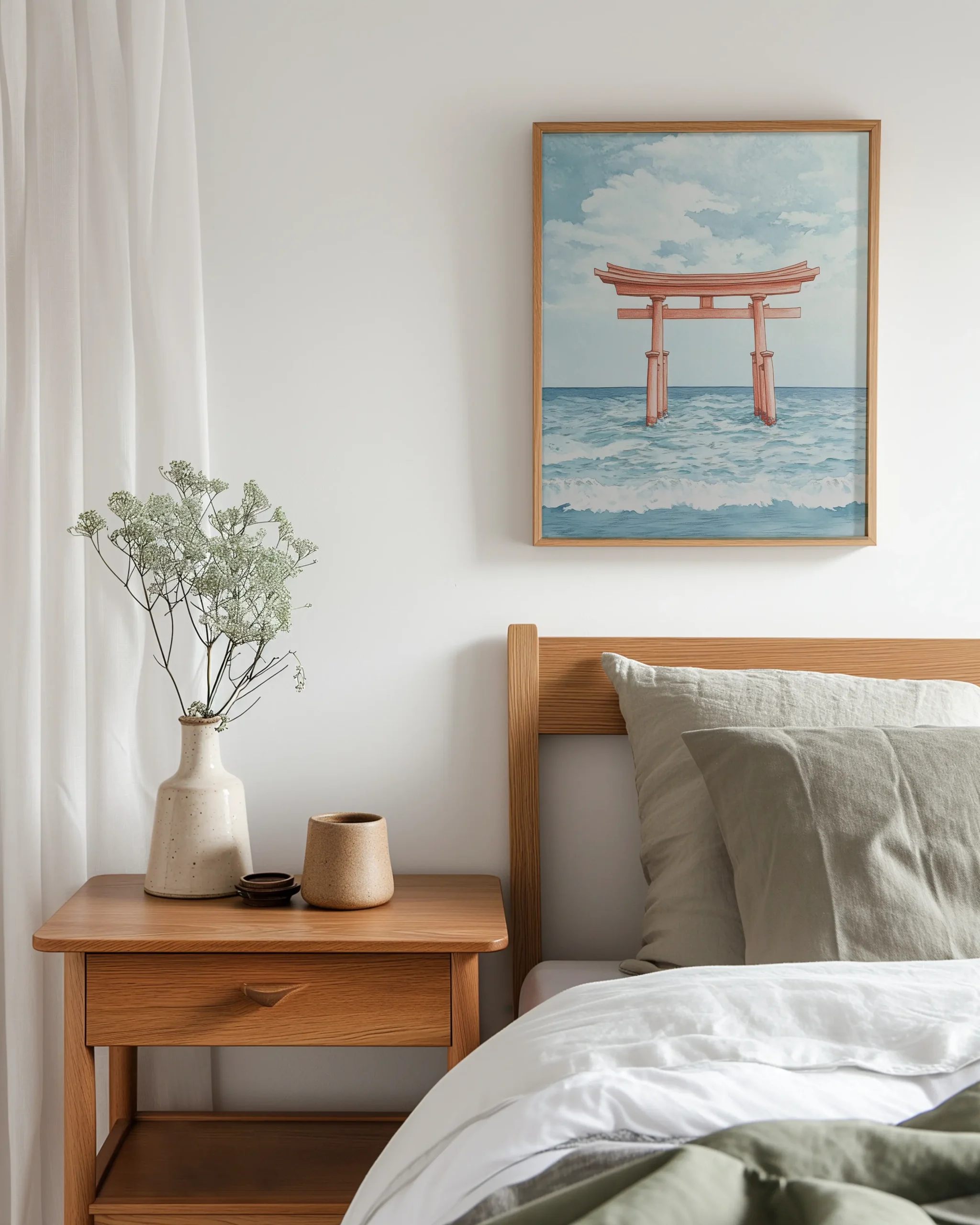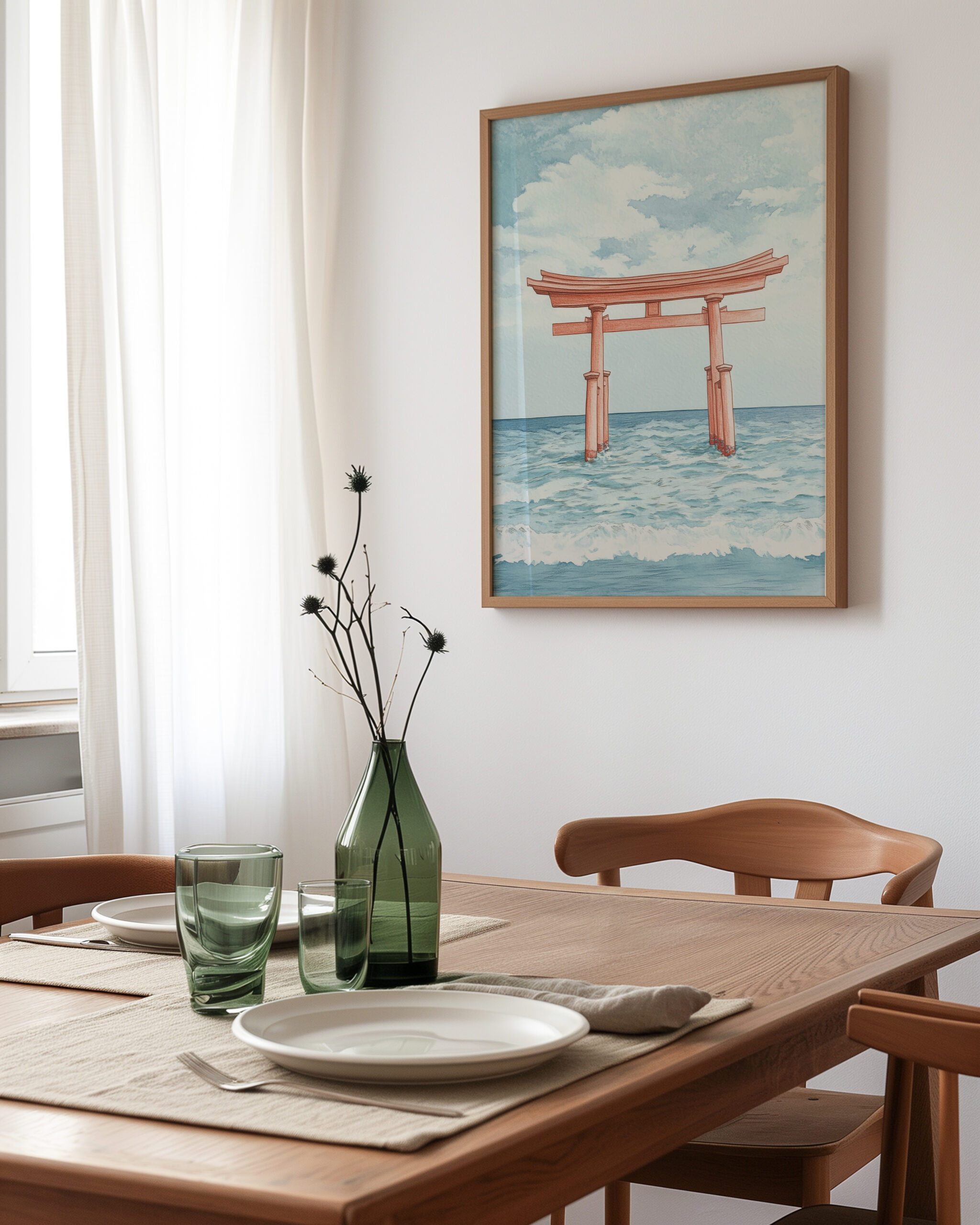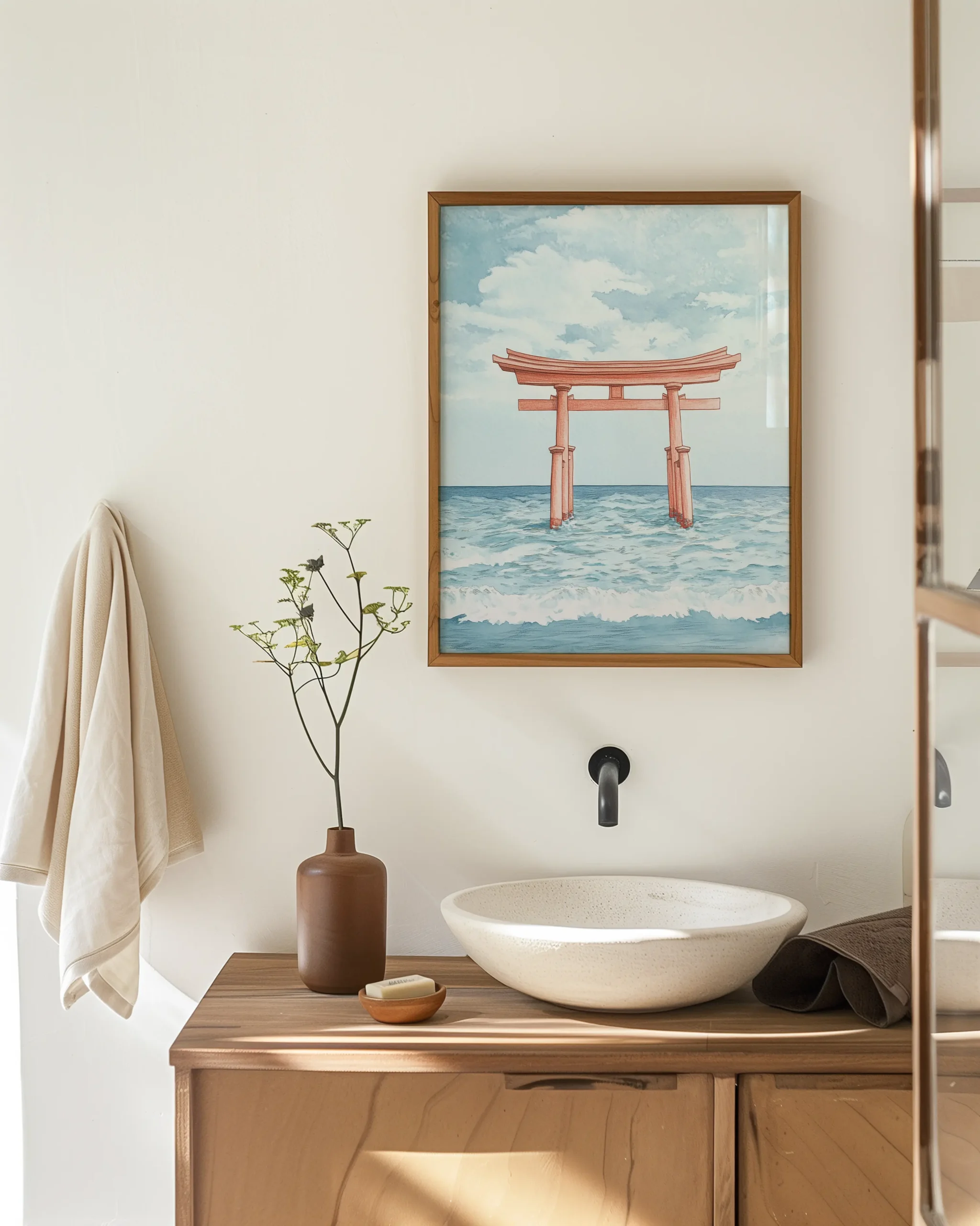 A coral-hued Torii Gate rises from rolling sea-blue waves for a calm coastal Japanese focal point—printed on museum-quality enhanced matte paper. Framed and ready to hang with your preferred frame (Black, White, or Red Oak).