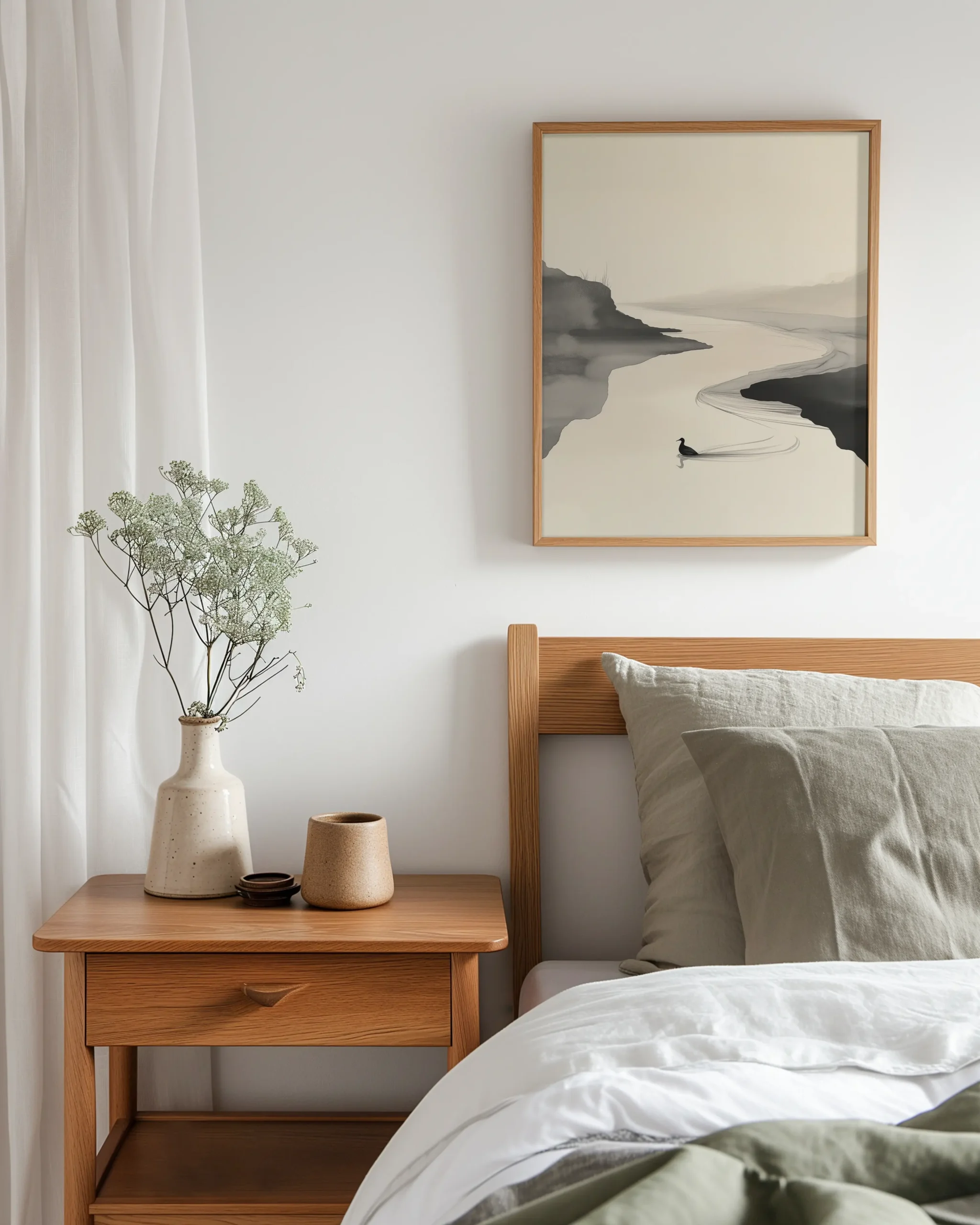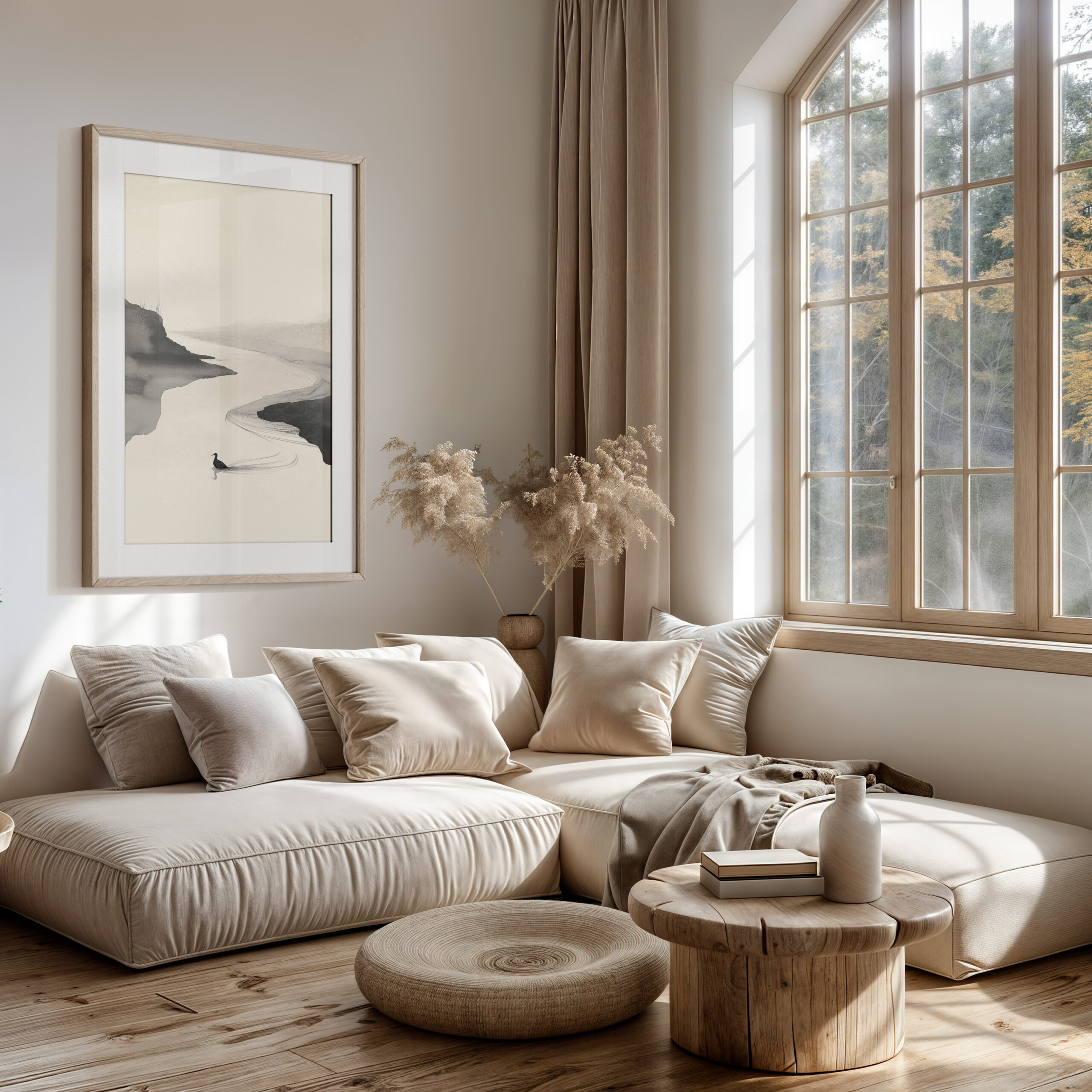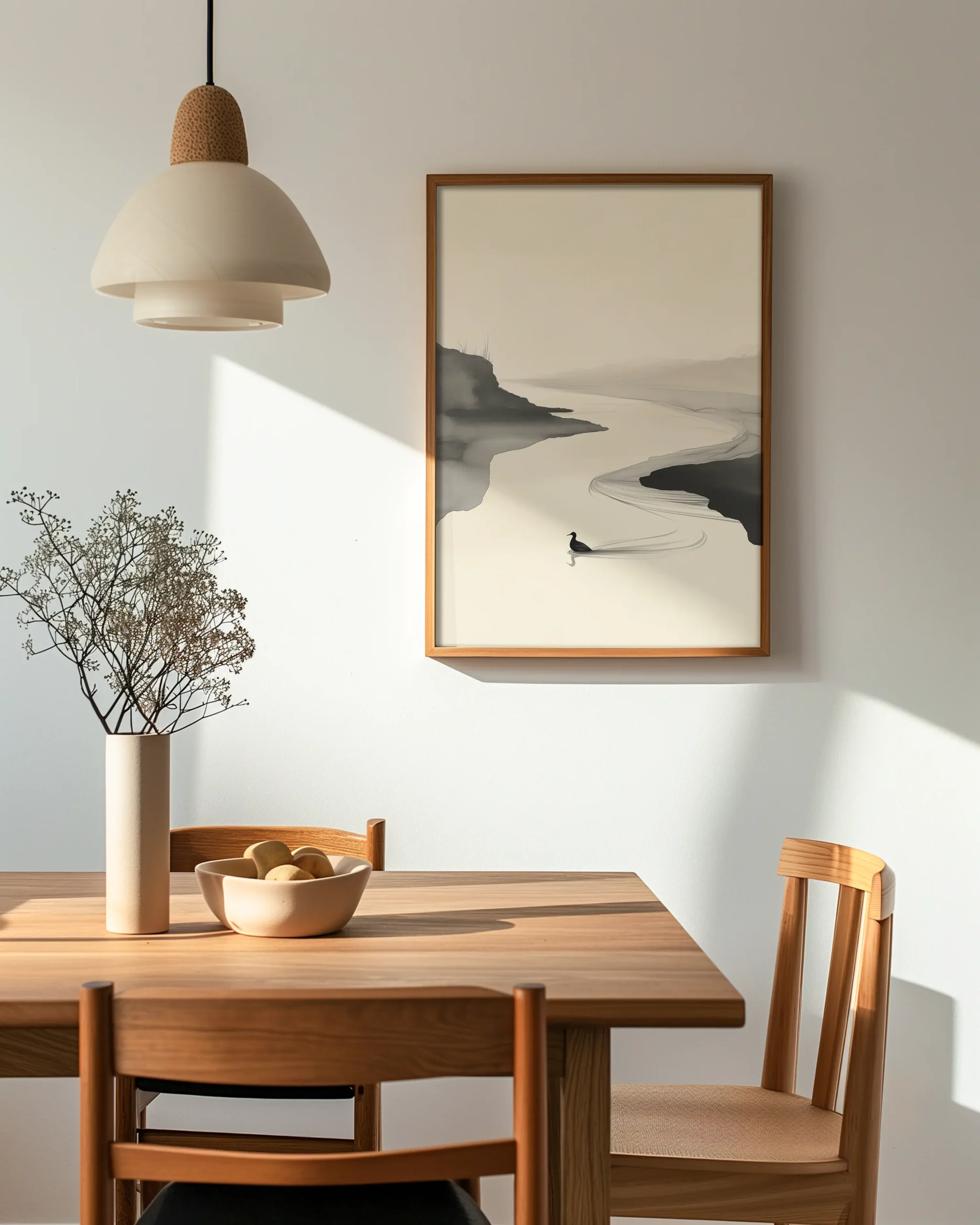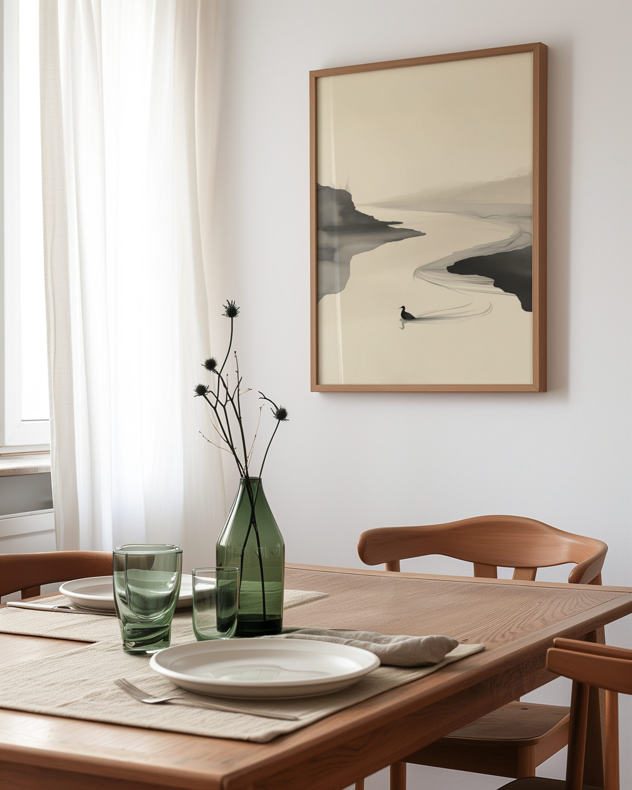 Tranquil River Flow captures a quiet bend in the water where mist meets shoreline and a single bird leaves a delicate wake. The composition leans into negative space and soft ink washes, evoking the calm rhythm of a slow current and the hush of early morning light. It’s a soothing statement piece for Japandi, minimalist, or zen-inspired rooms.