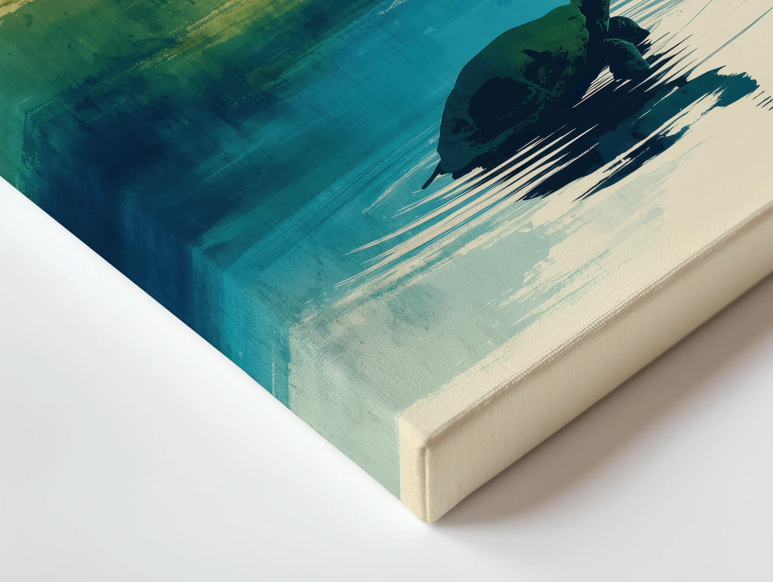 A lone turtle glides across still water, framed by layered teal and moss washes with subtle brush textures and calm ripple lines. The airy negative space and ink-style accents create a quiet Japandi mood that feels balanced and meditative.