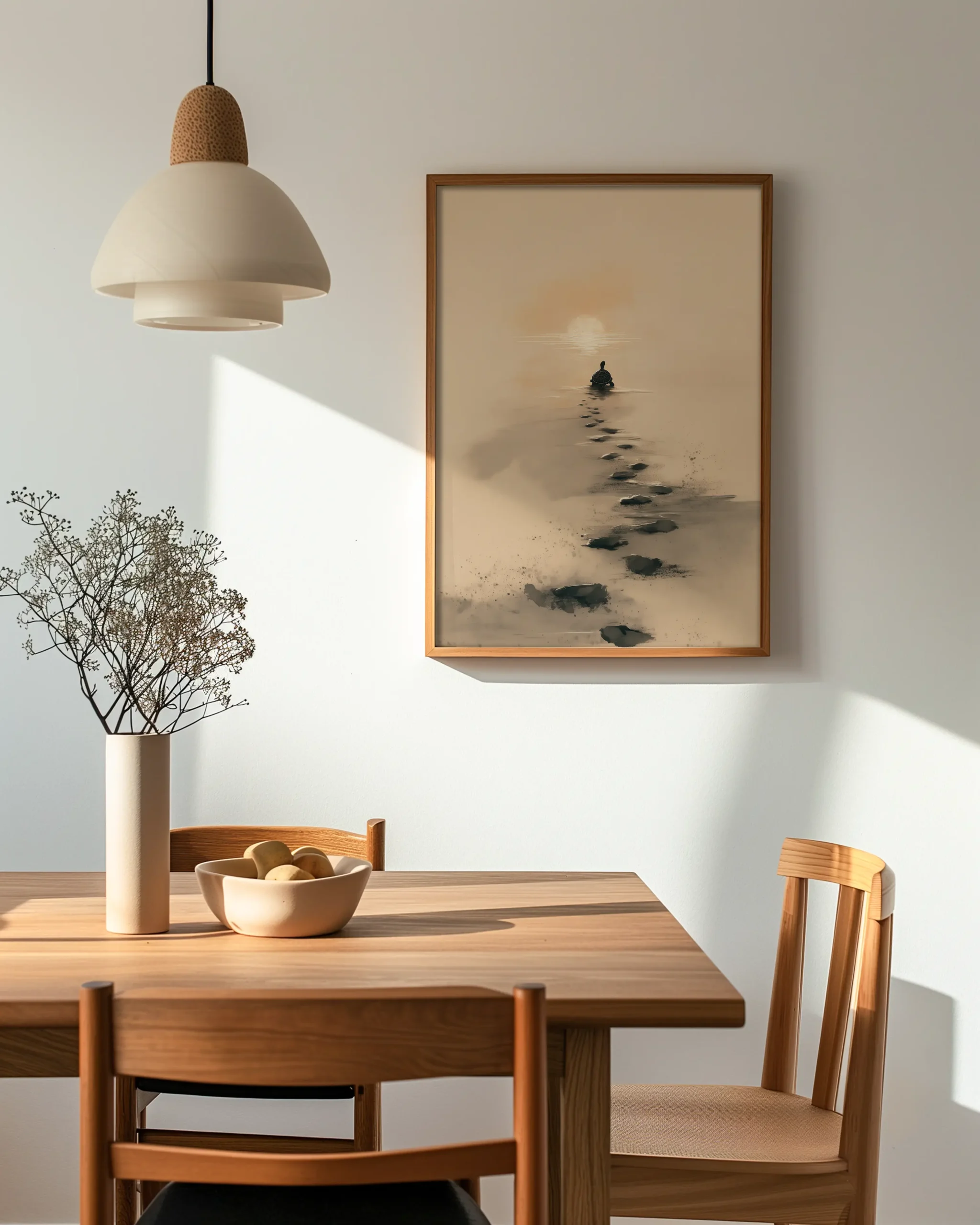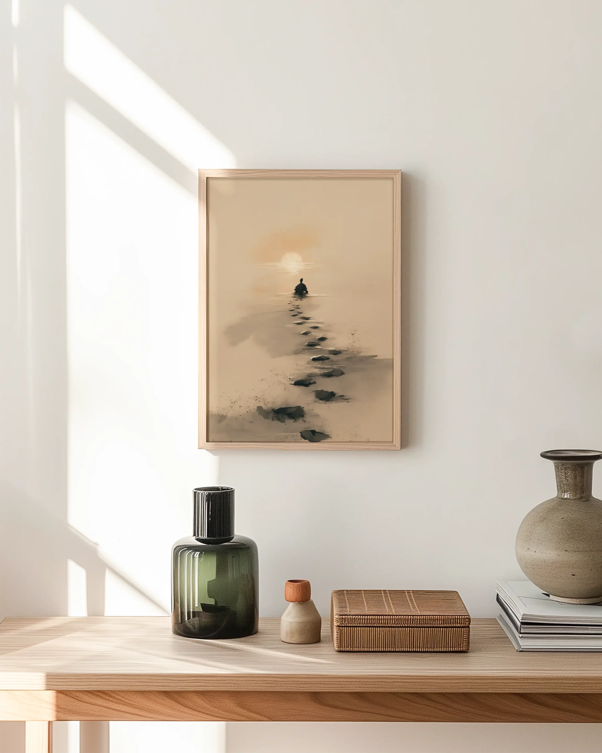 Rendered in soft washes of sand beige and charcoal ink, this minimalist scene follows a lone turtle leaving dark footprint path toward a sun. The gentle palette and open negative space evoke Japandi calm, perfect for bedrooms, nurseries, and quiet reading nooks.