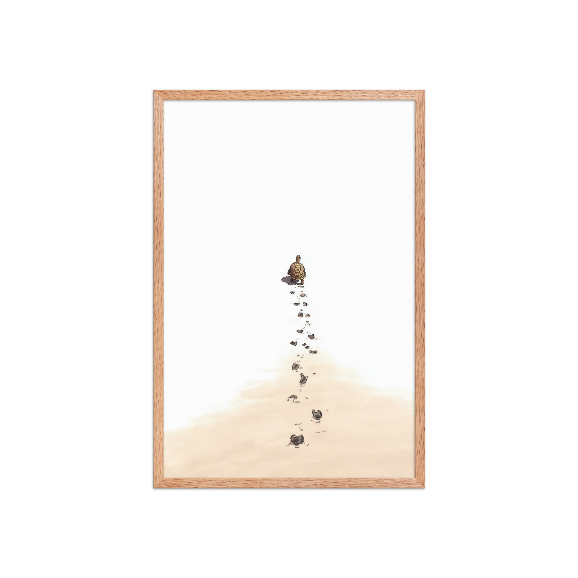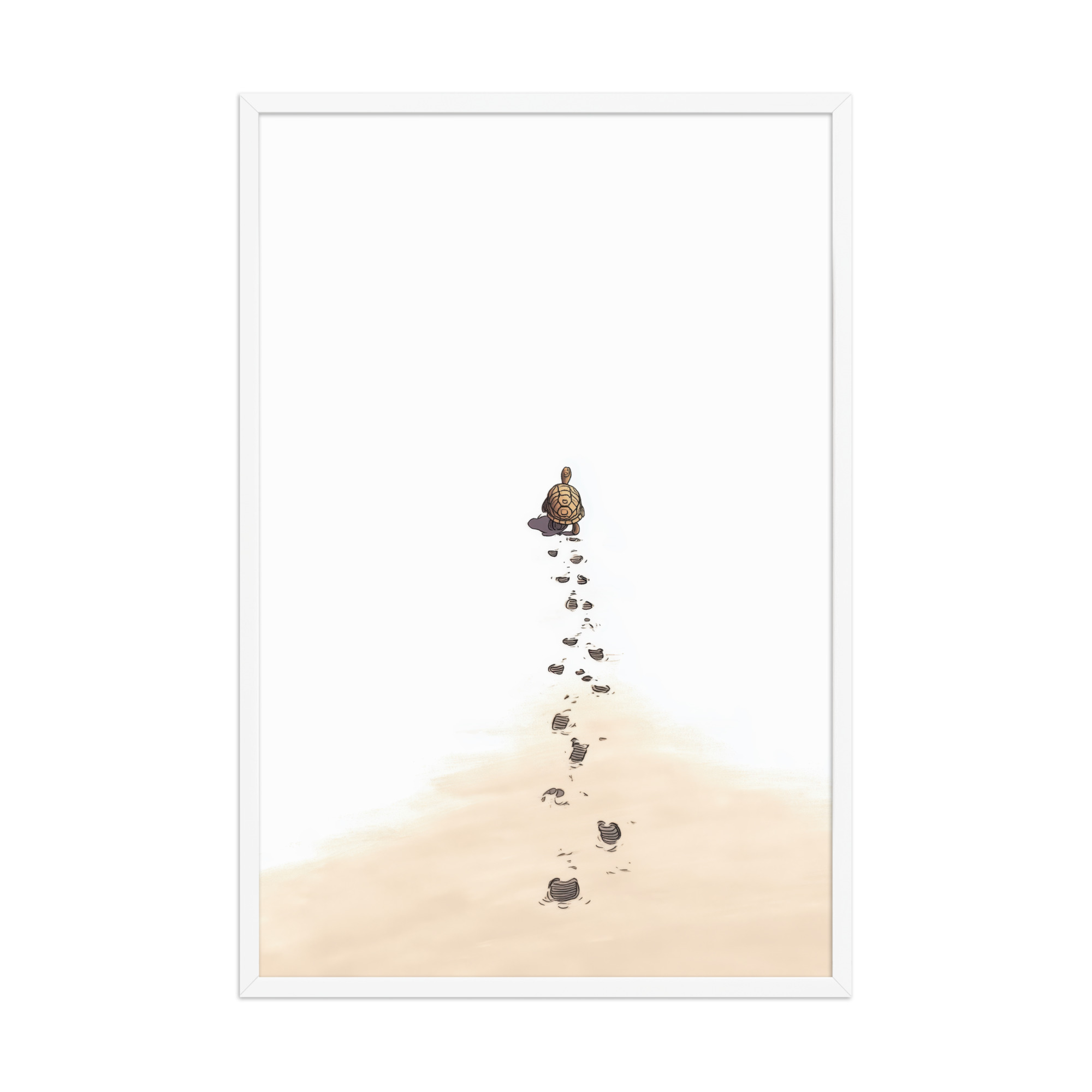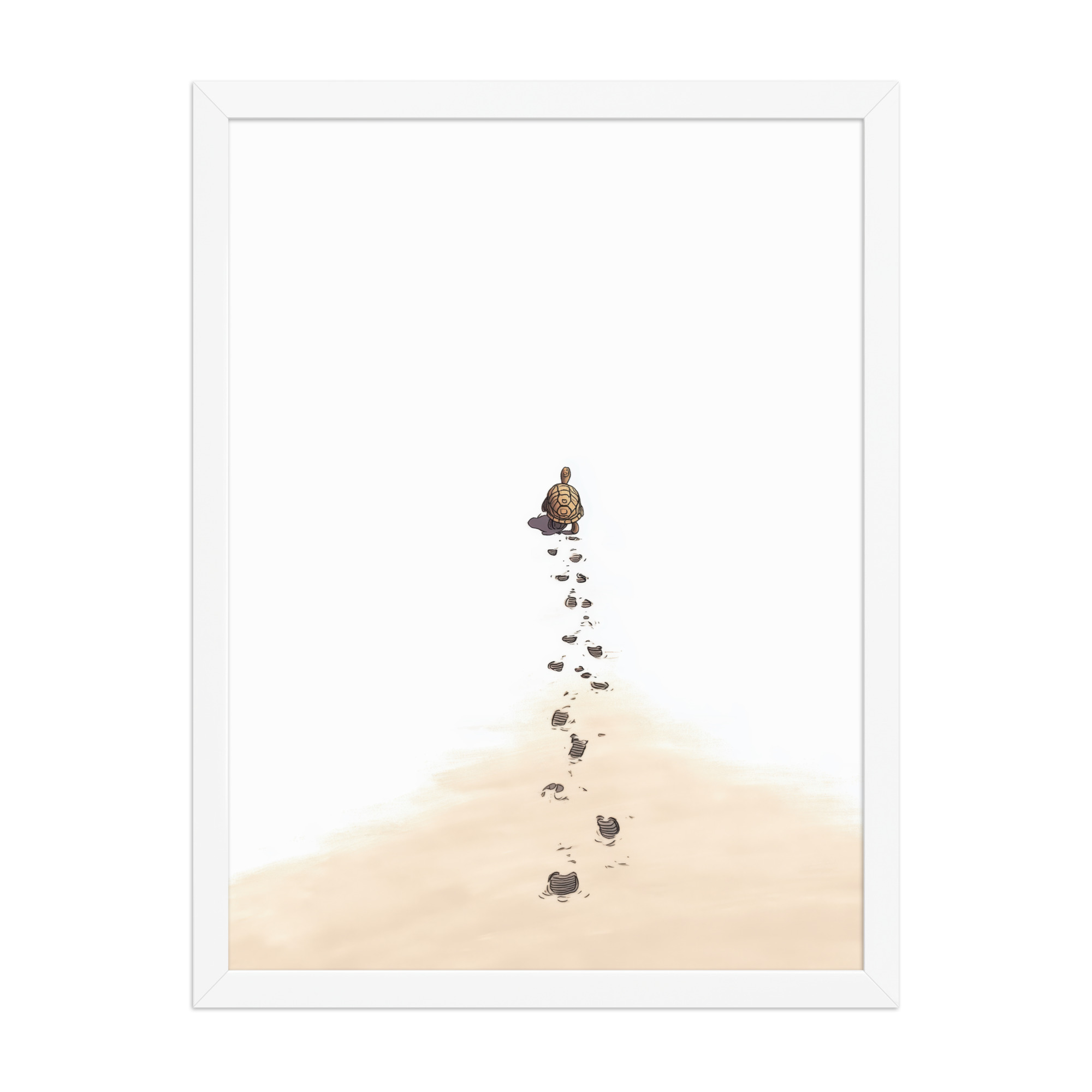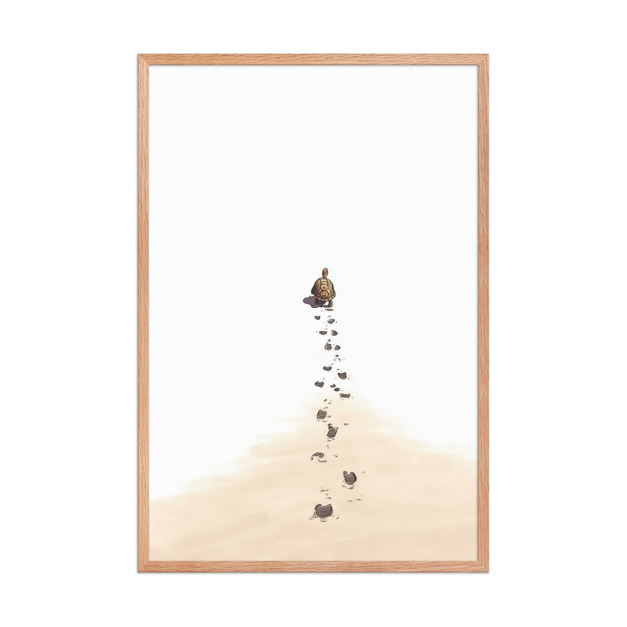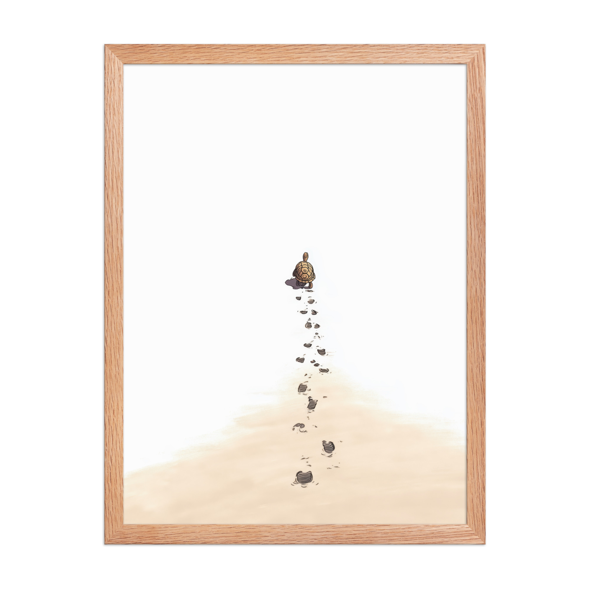 This minimalist composition captures a small turtle at the horizon with a quiet procession of footprints fading through soft, sandy tones. The spacious negative space and gentle palette bring Japandi calm to nurseries, hallways, and reading corners.