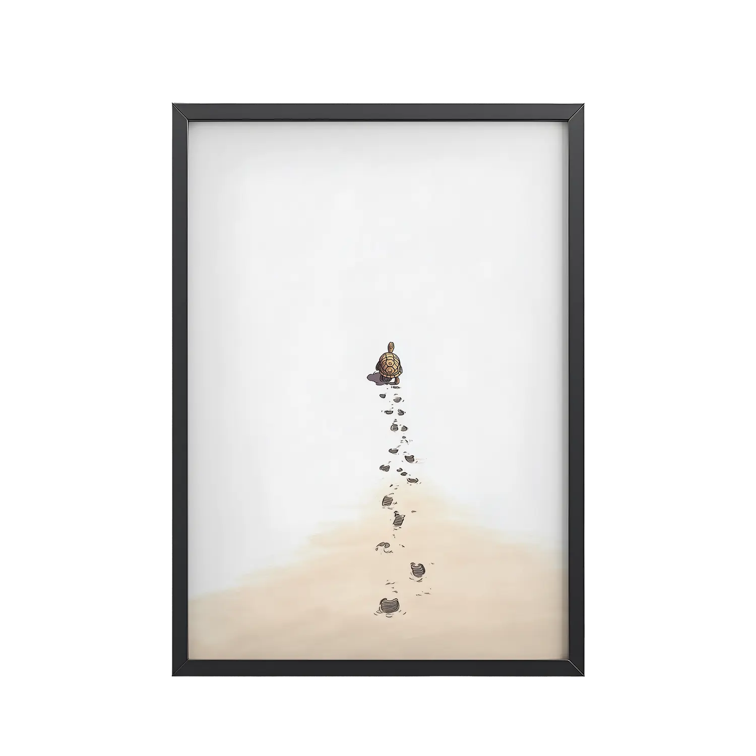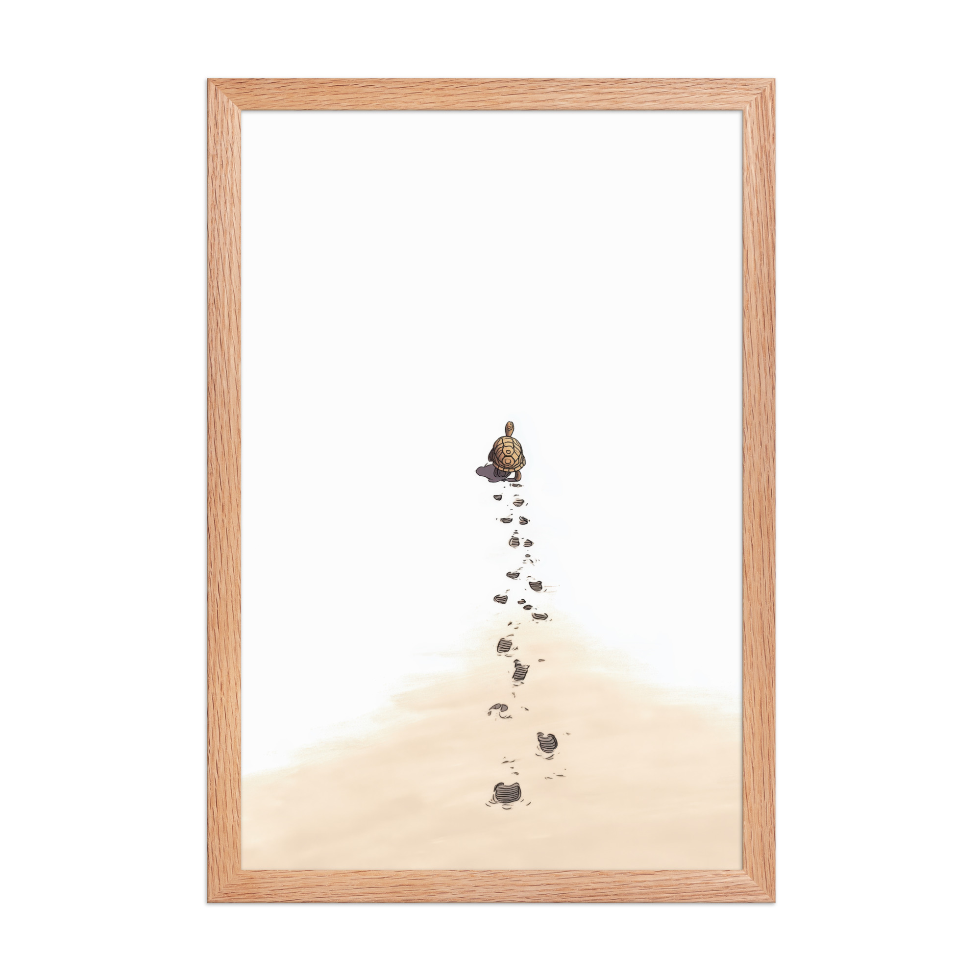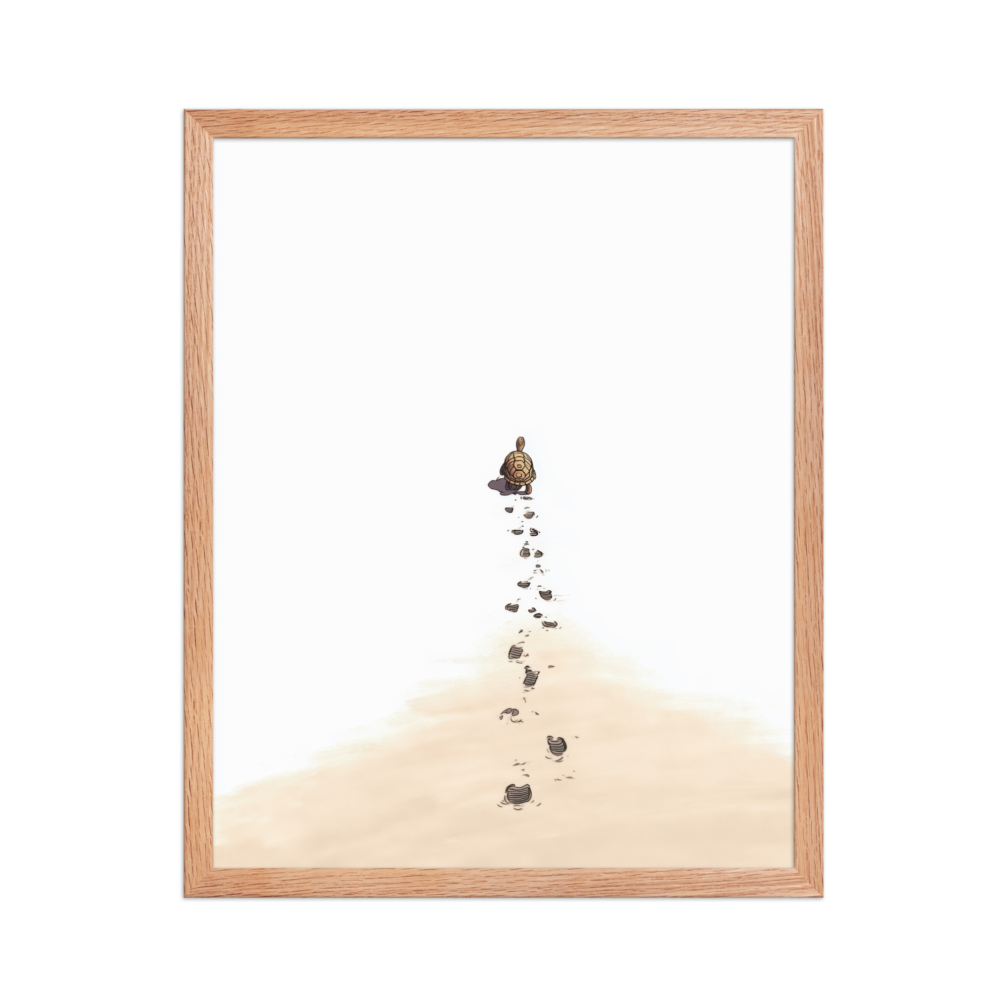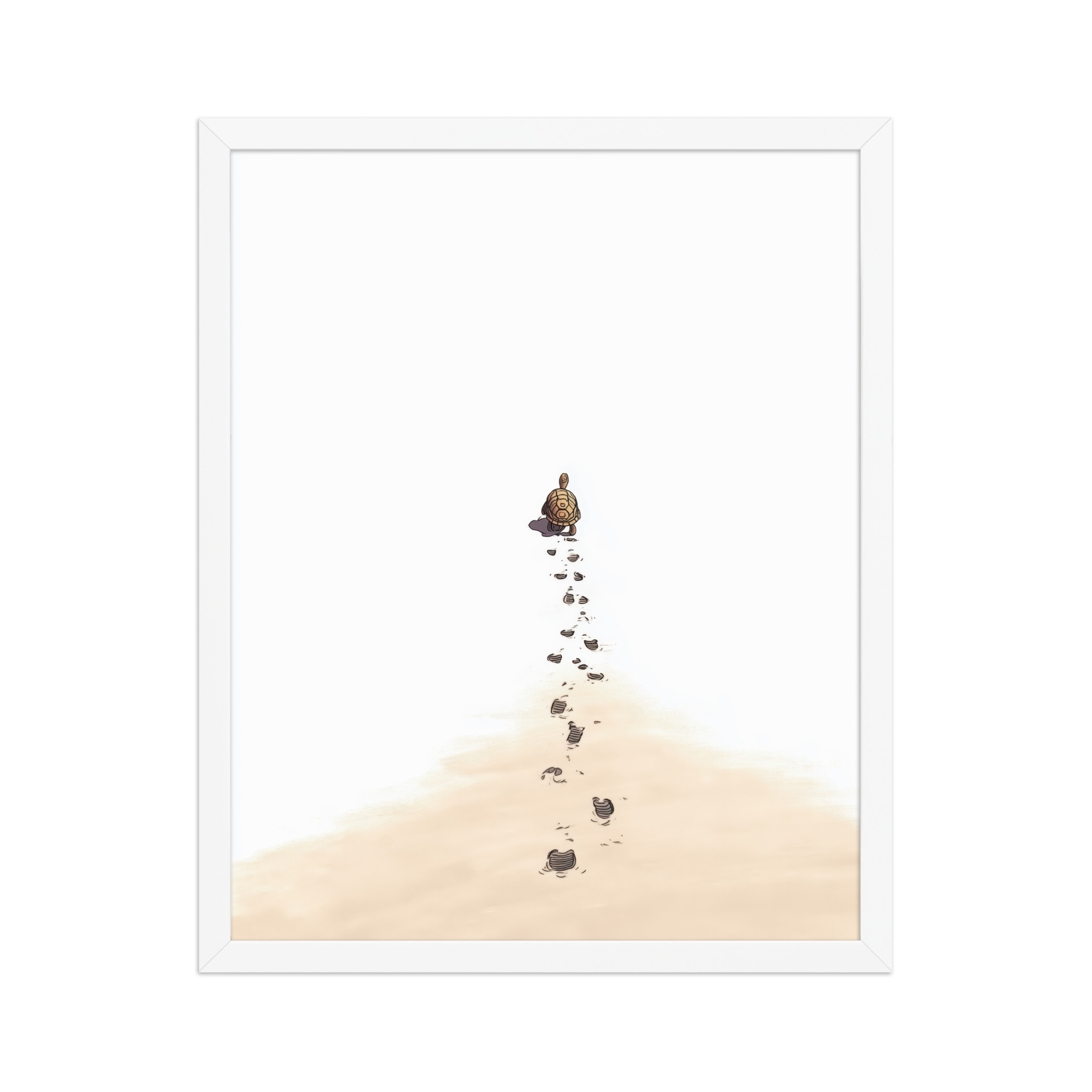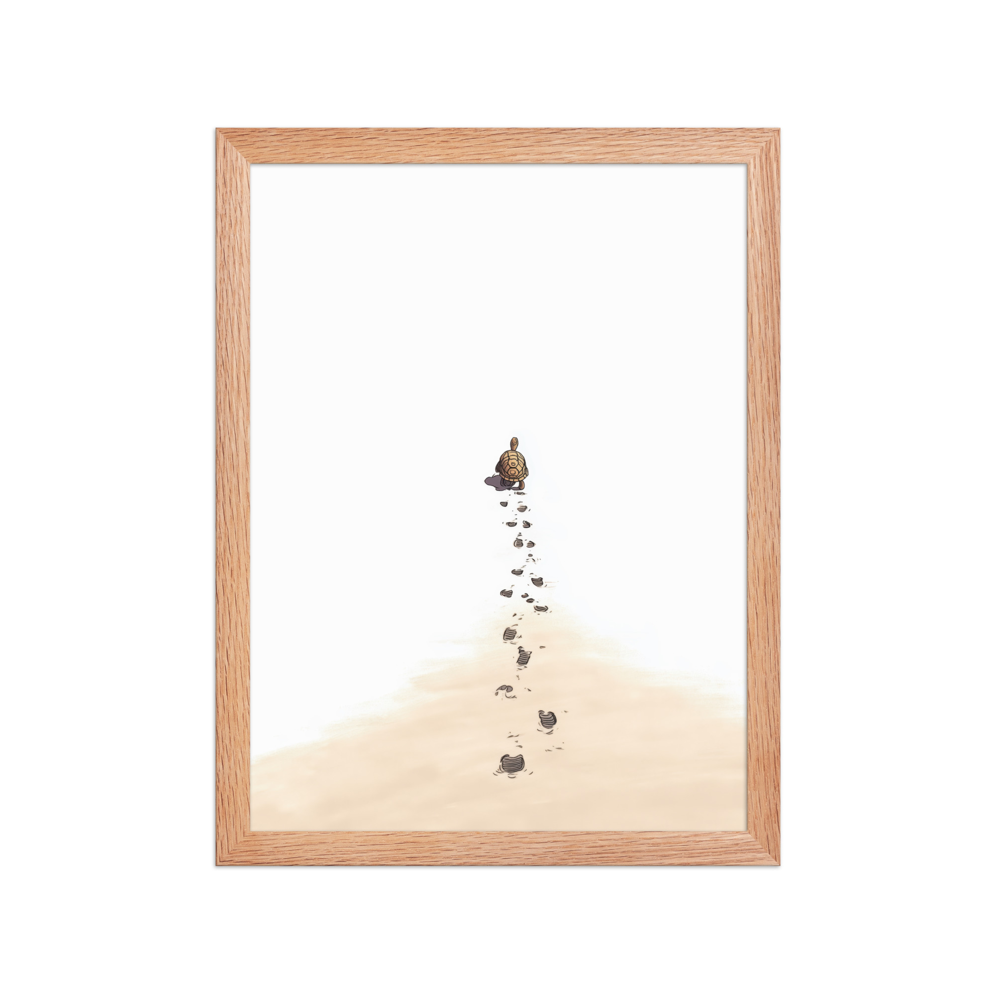 This minimalist composition captures a small turtle at the horizon with a quiet procession of footprints fading through soft, sandy tones. The spacious negative space and gentle palette bring Japandi calm to nurseries, hallways, and reading corners.