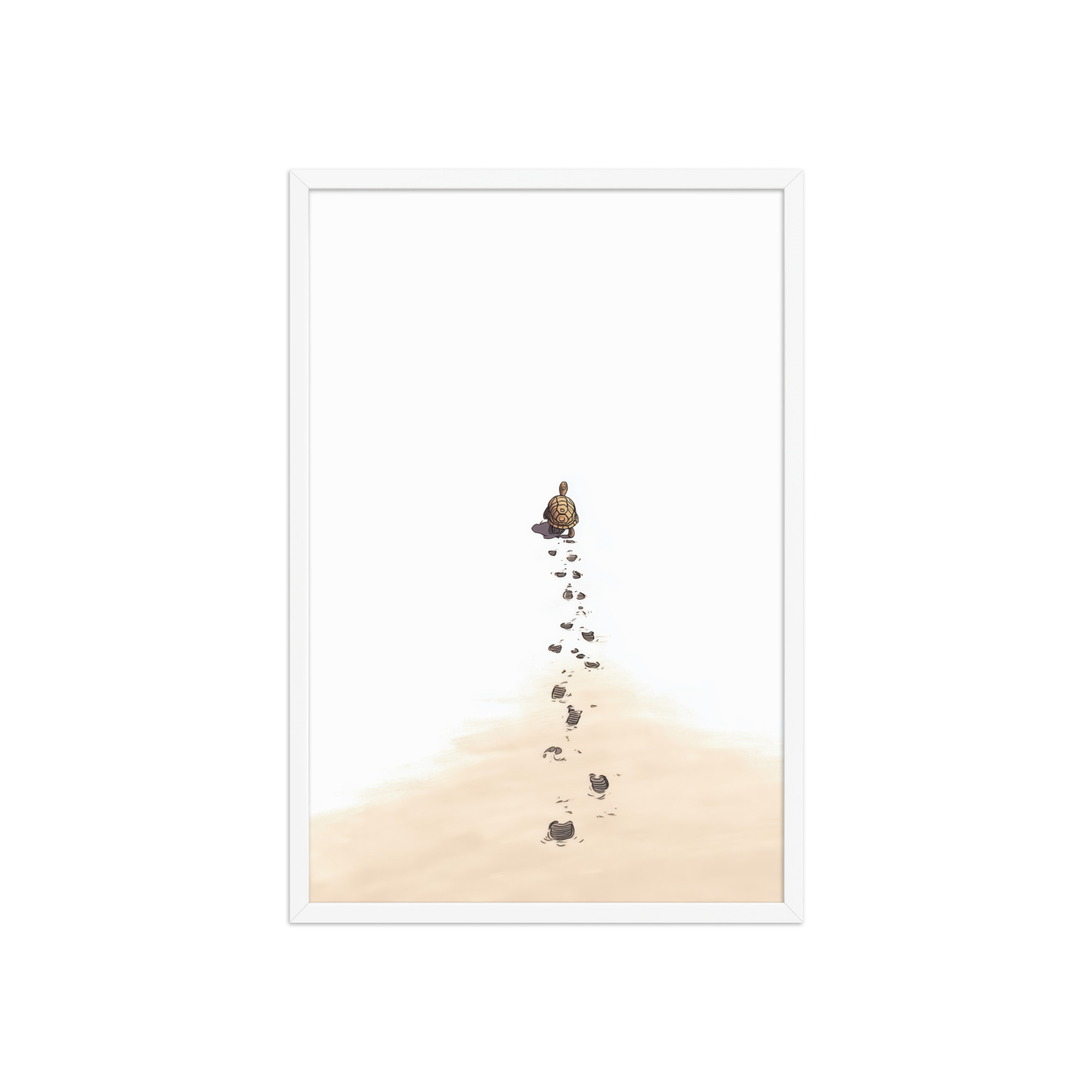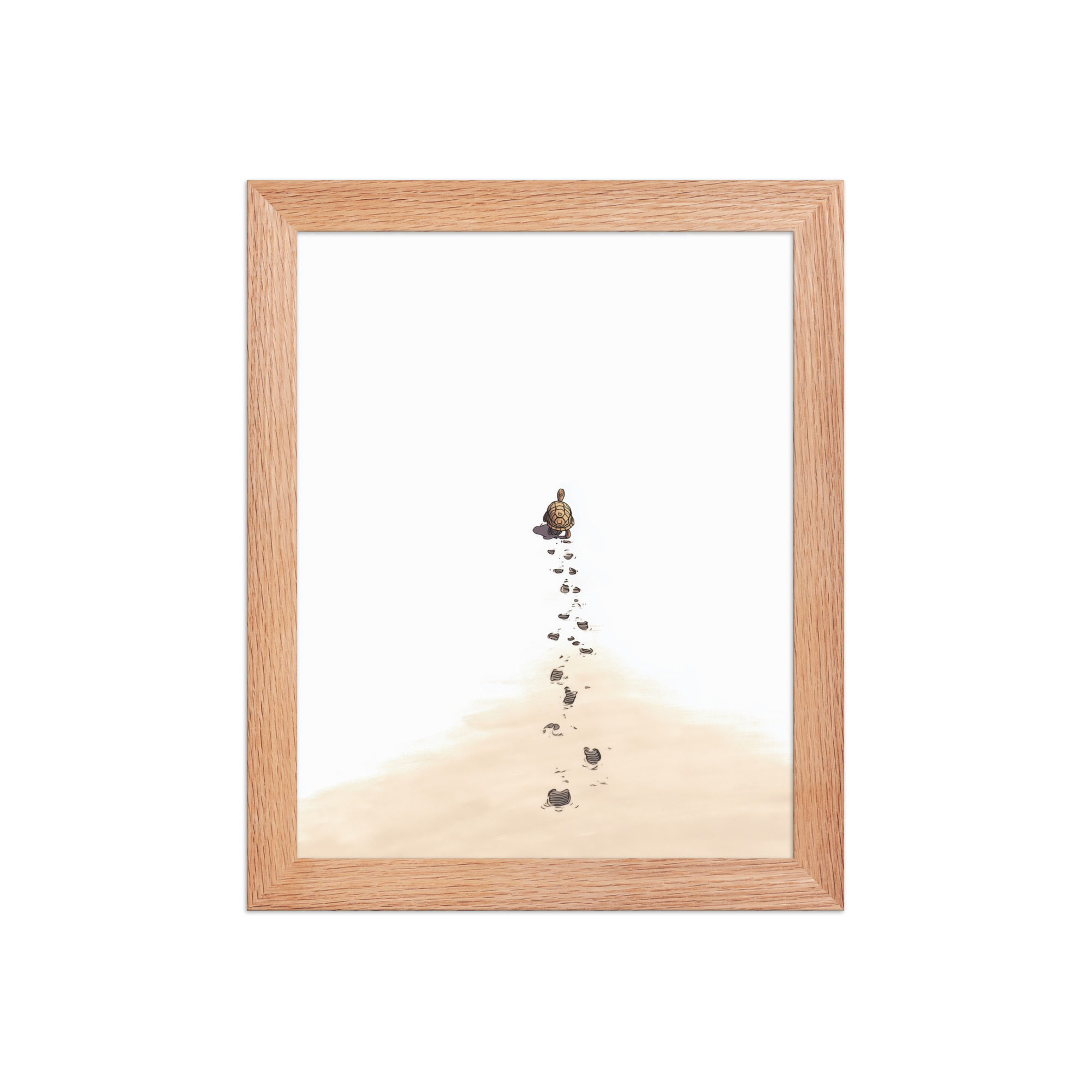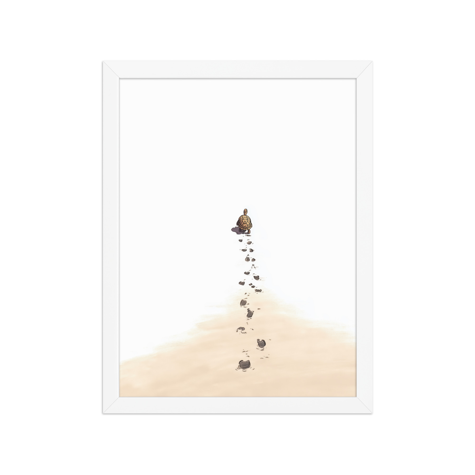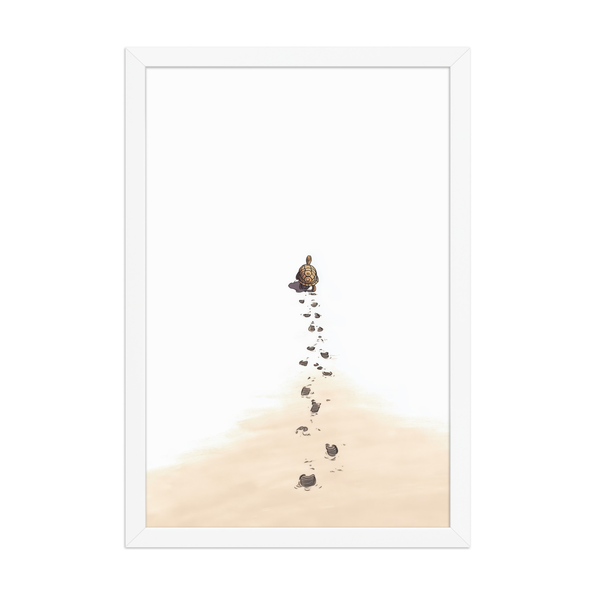 This minimalist composition captures a small turtle at the horizon with a quiet procession of footprints fading through soft, sandy tones. The spacious negative space and gentle palette bring Japandi calm to nurseries, hallways, and reading corners.