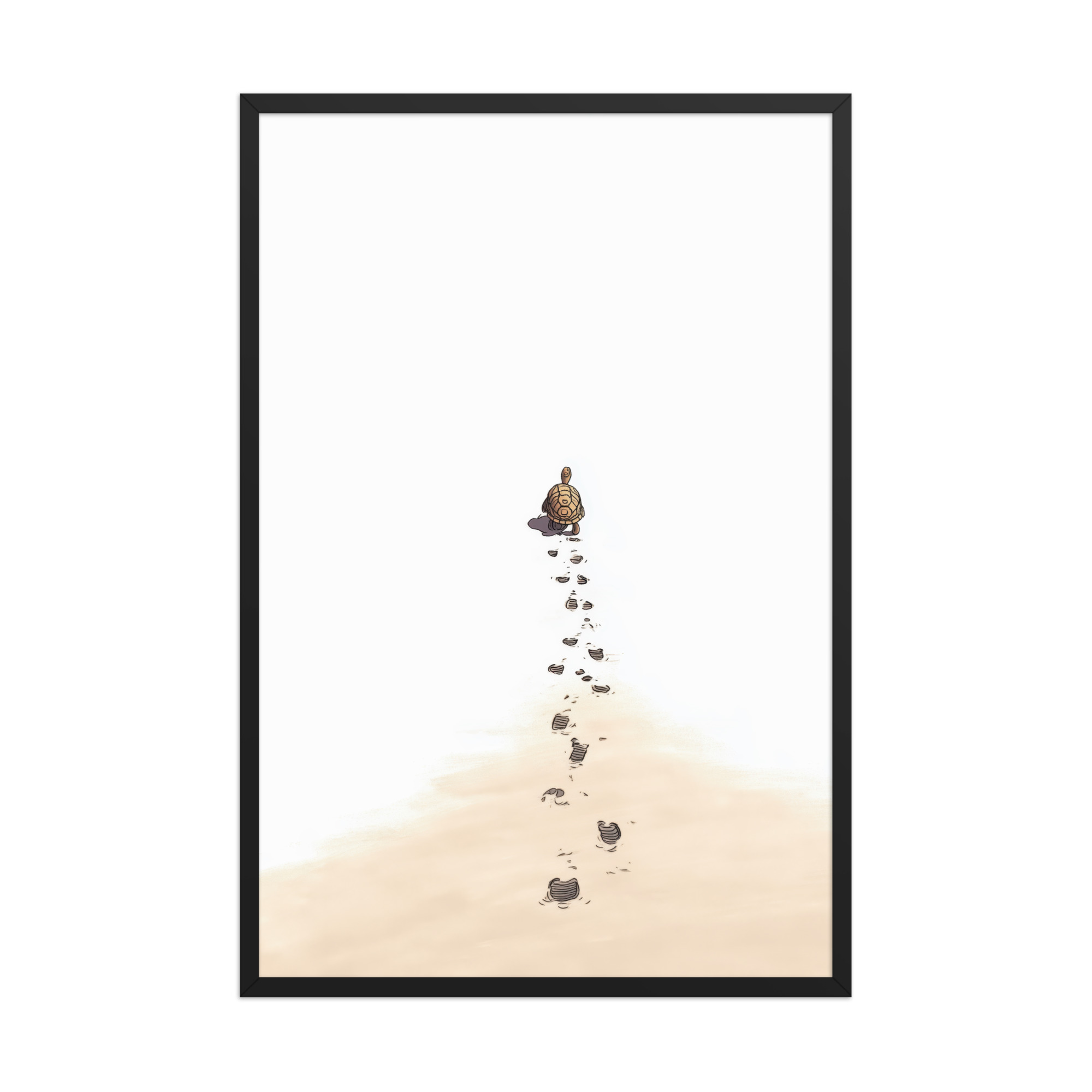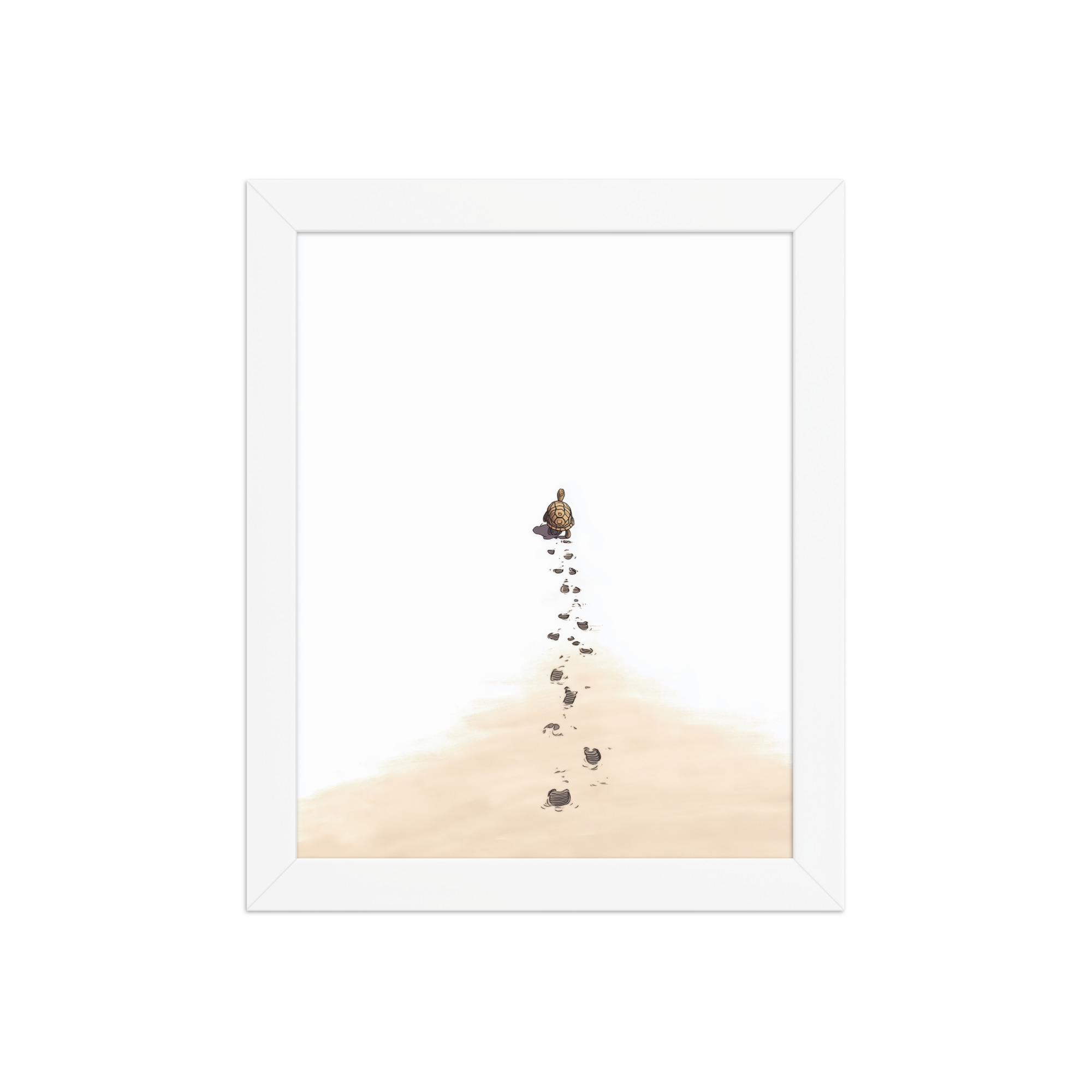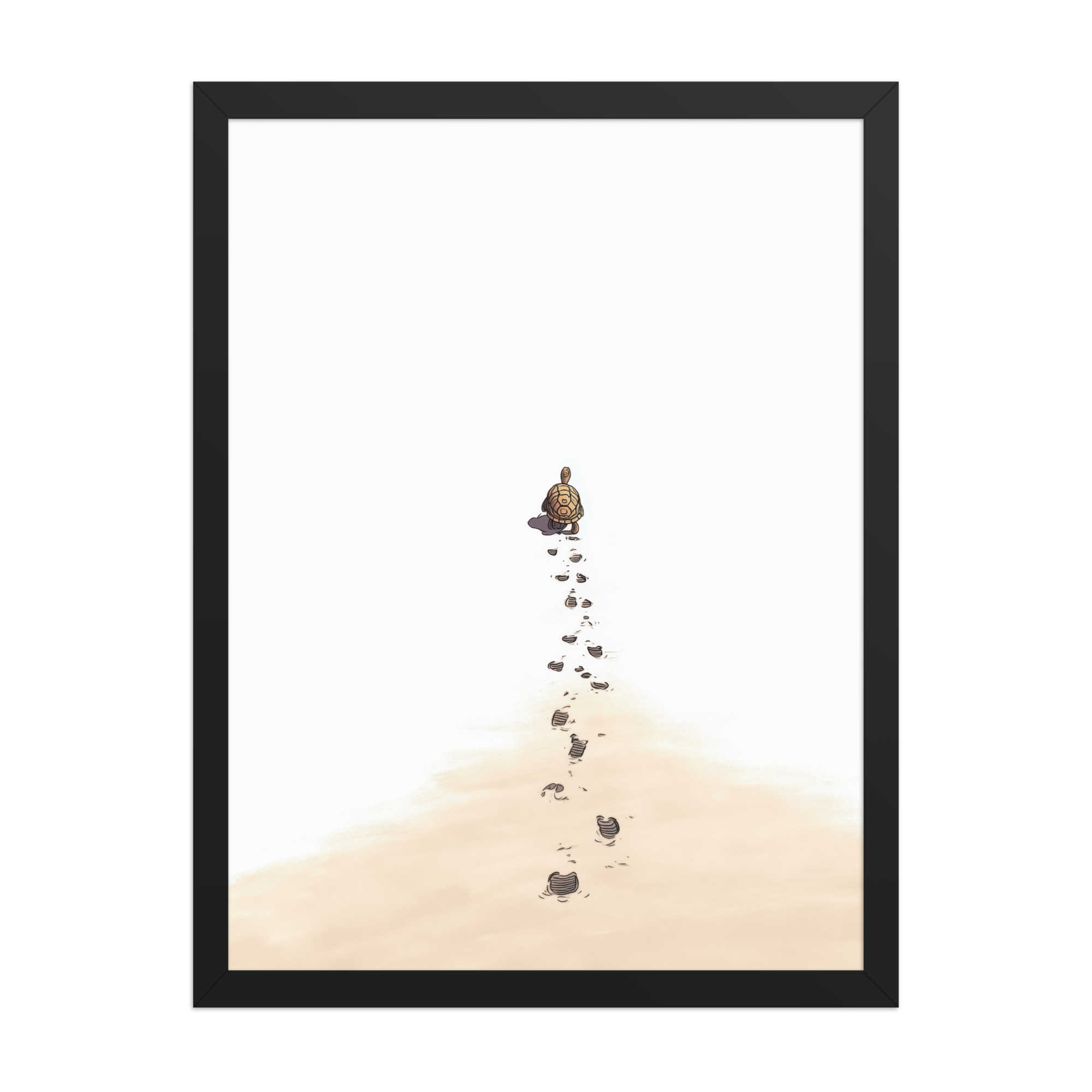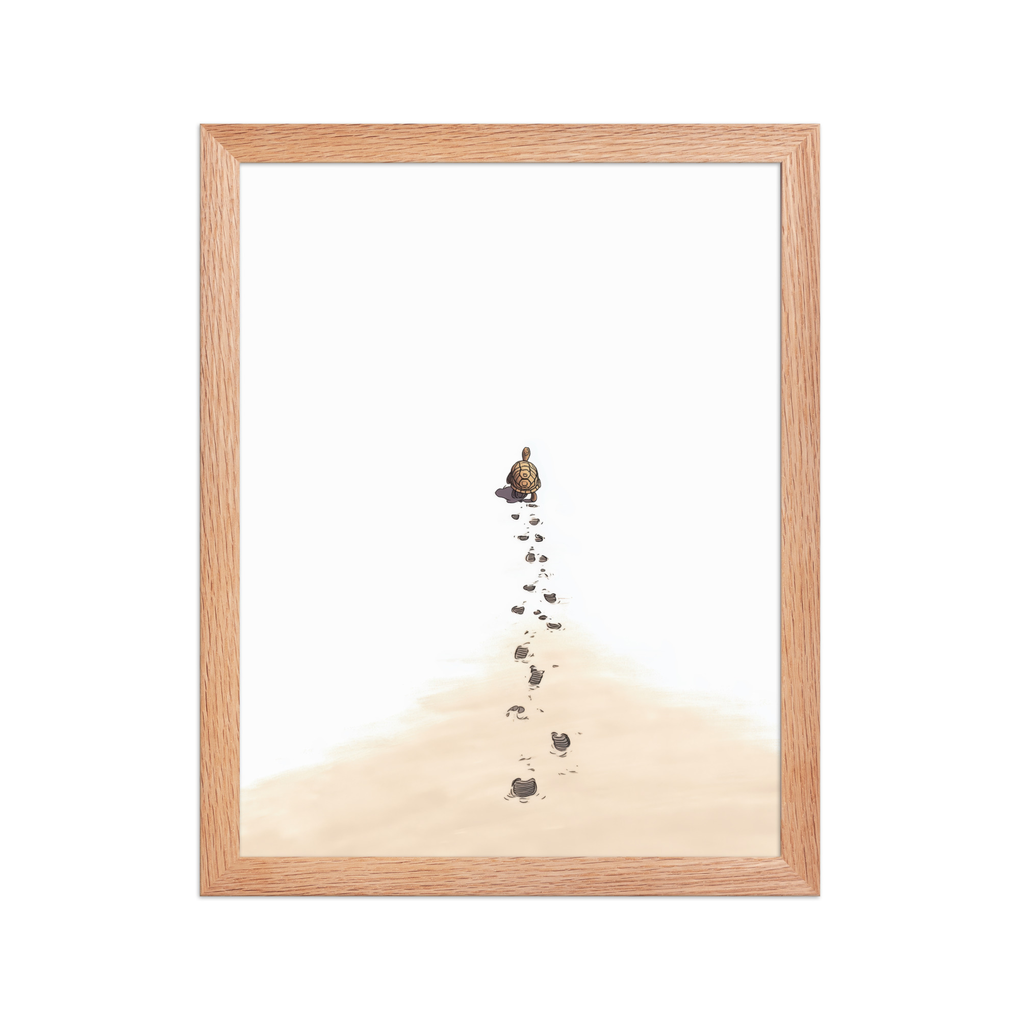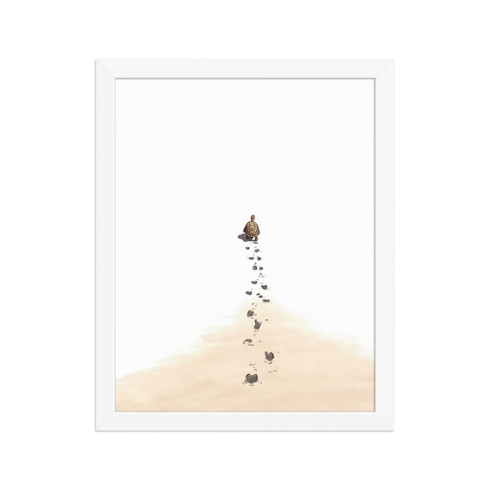 This minimalist composition captures a small turtle at the horizon with a quiet procession of footprints fading through soft, sandy tones. The spacious negative space and gentle palette bring Japandi calm to nurseries, hallways, and reading corners.