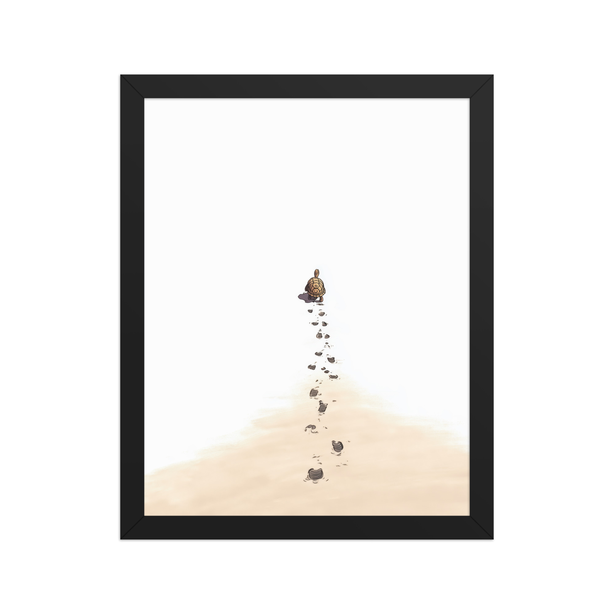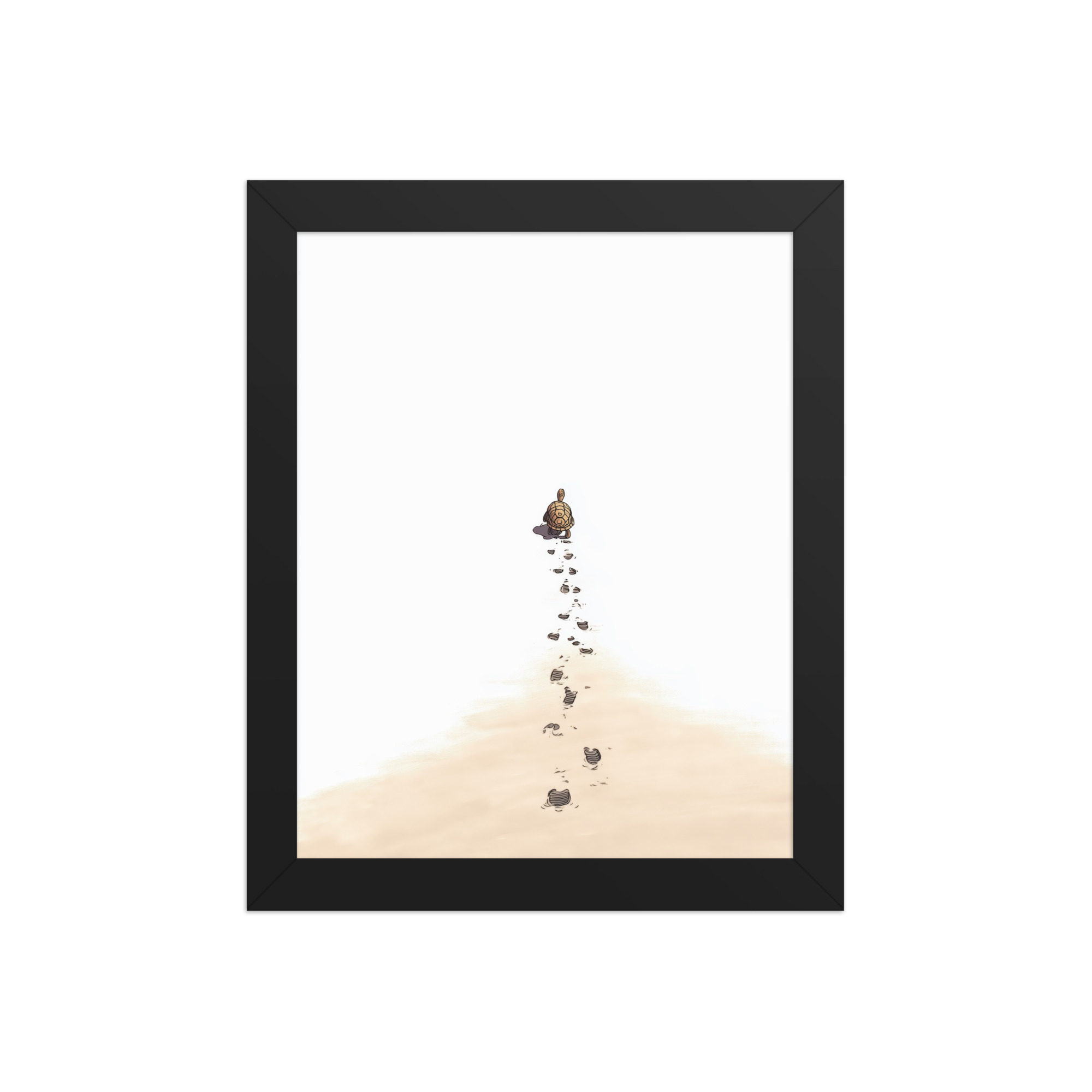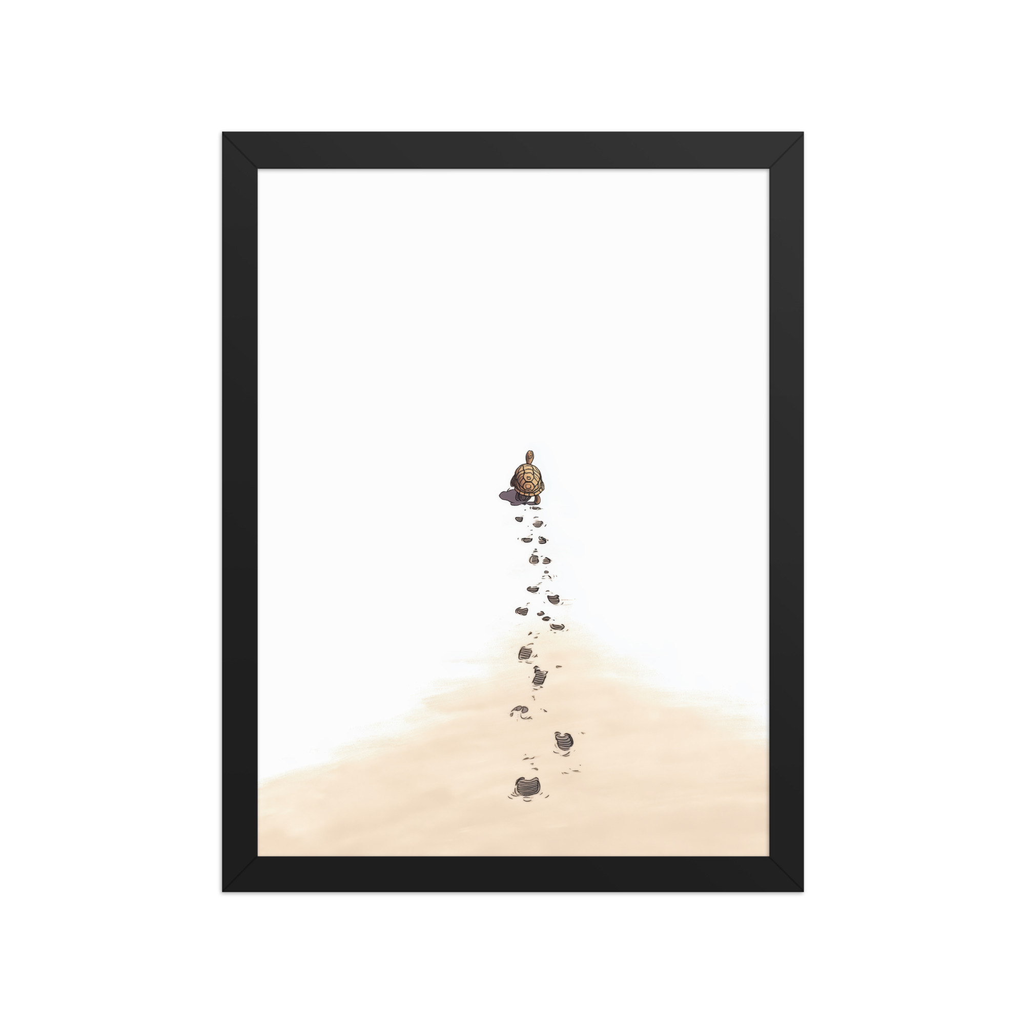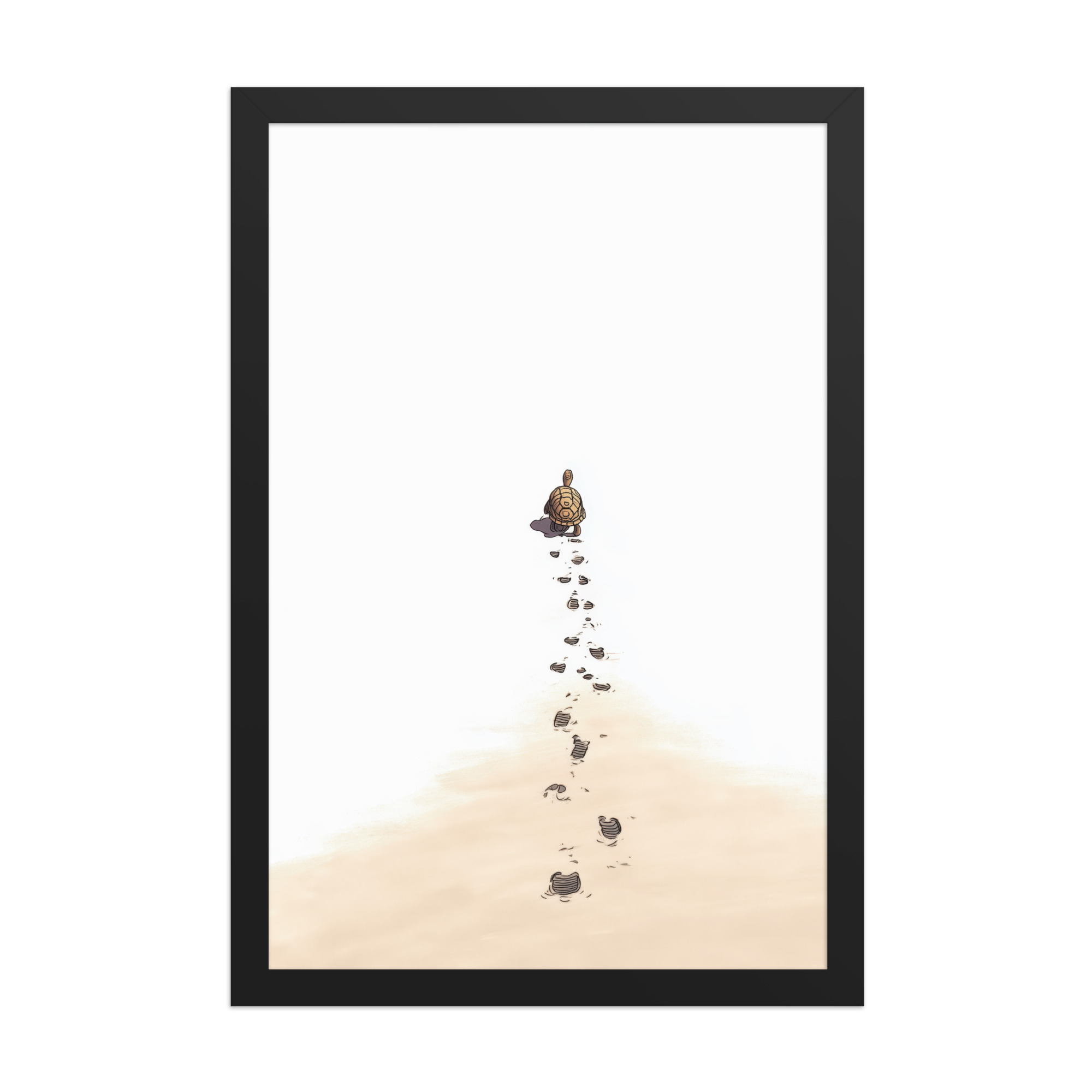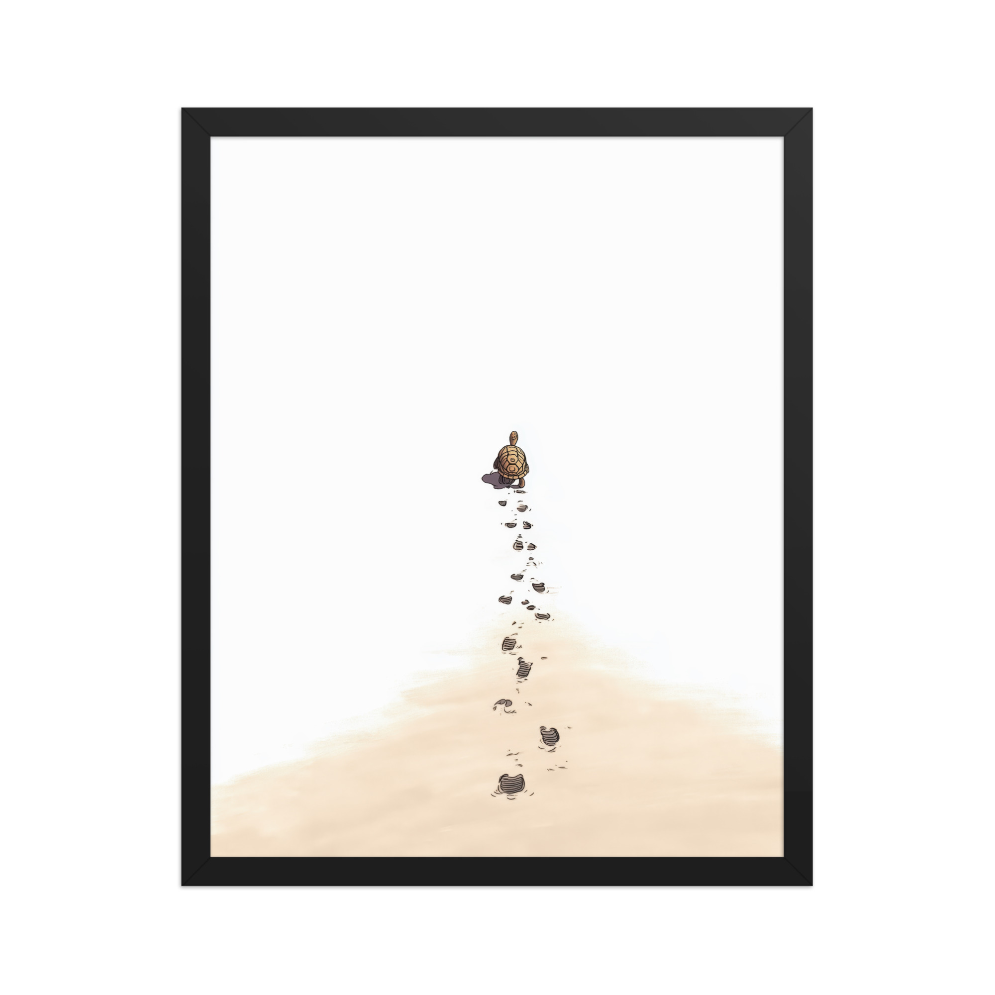 This minimalist composition captures a small turtle at the horizon with a quiet procession of footprints fading through soft, sandy tones. The spacious negative space and gentle palette bring Japandi calm to nurseries, hallways, and reading corners.