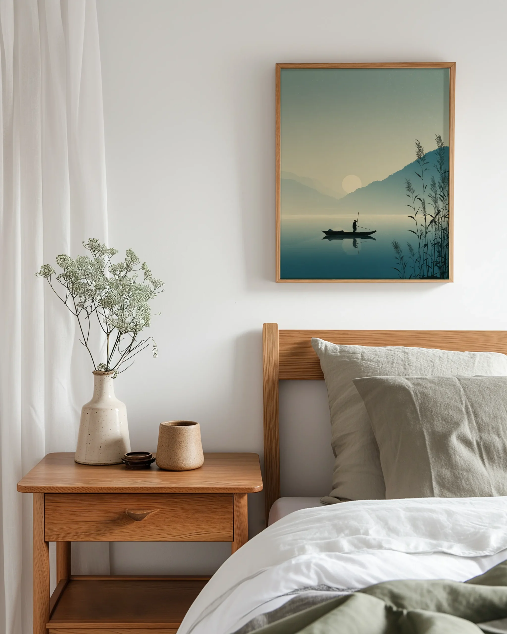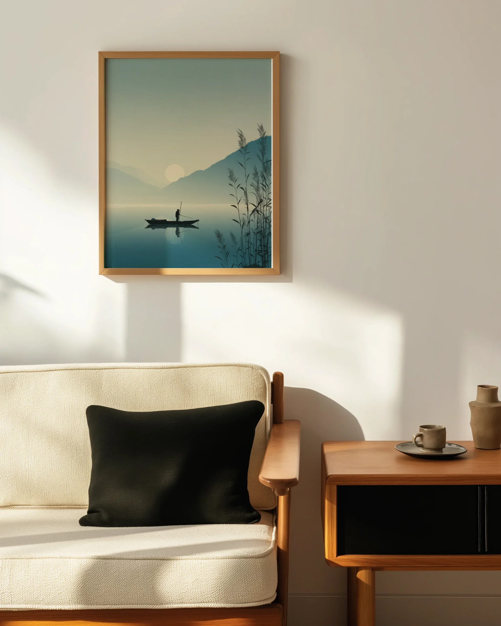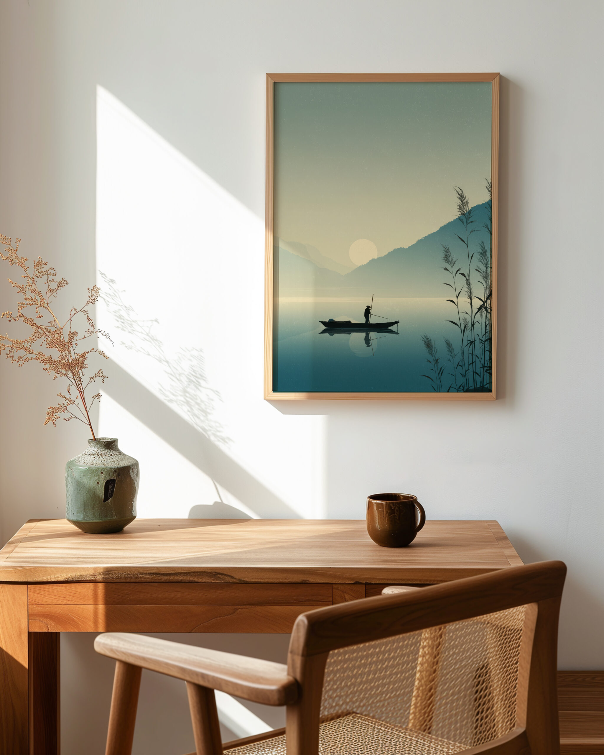 Calm dusk scene of a lone fisherman gliding across a glassy lake with soft mountains and reeds—printed on museum-quality enhanced matte paper. Framed and ready to hang with your preferred frame (Black, White, or Red Oak).