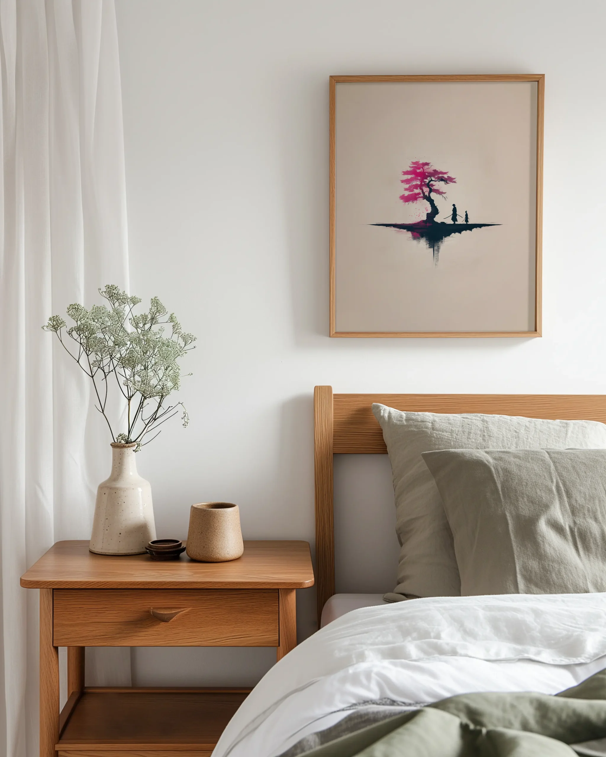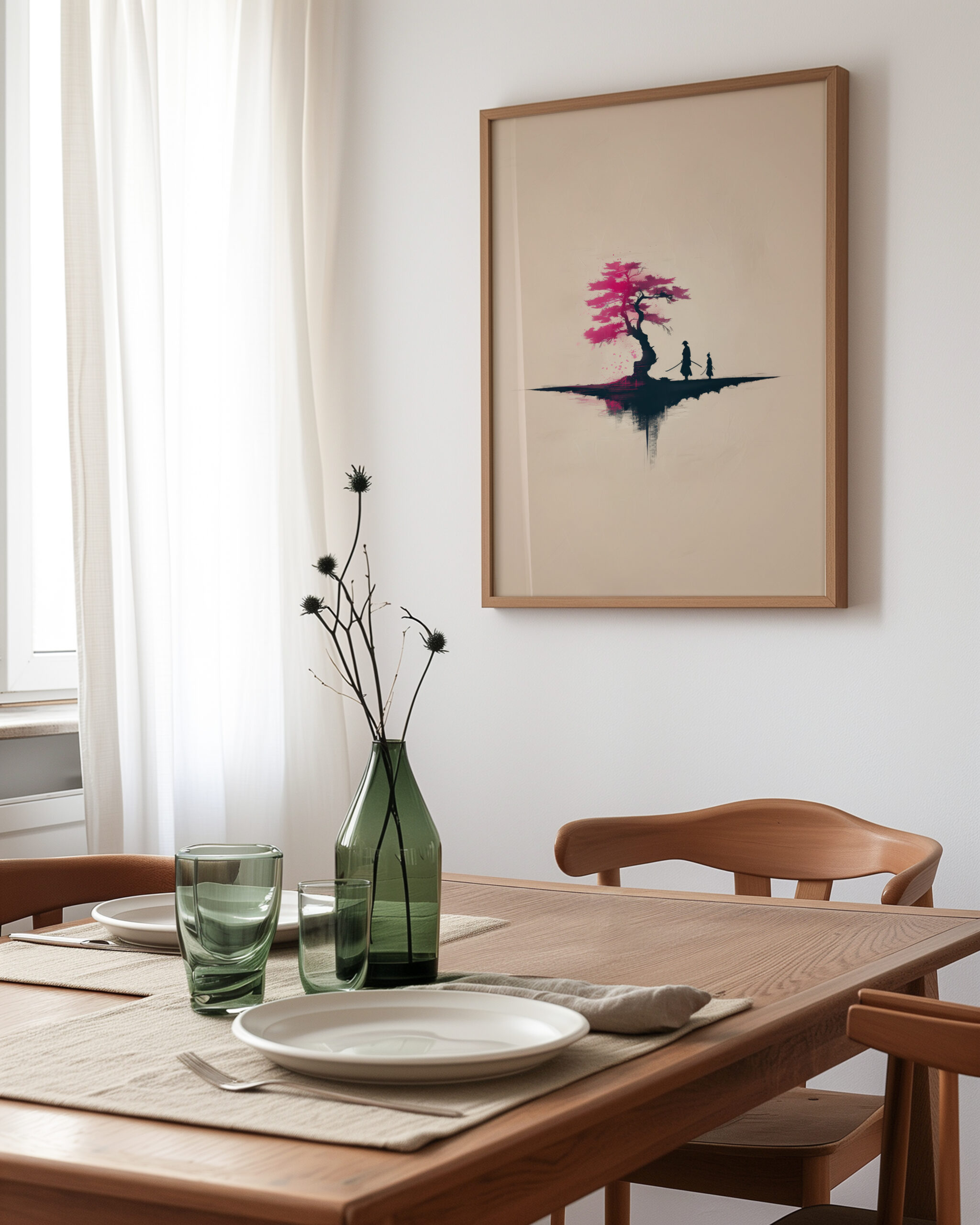 A serene duel unfolds under a blooming sakura, its fuchsia petals balancing the calm negative space and soft neutrals. The minimalist composition and mirror-like reflection make a striking, meditative focal point for modern interiors.