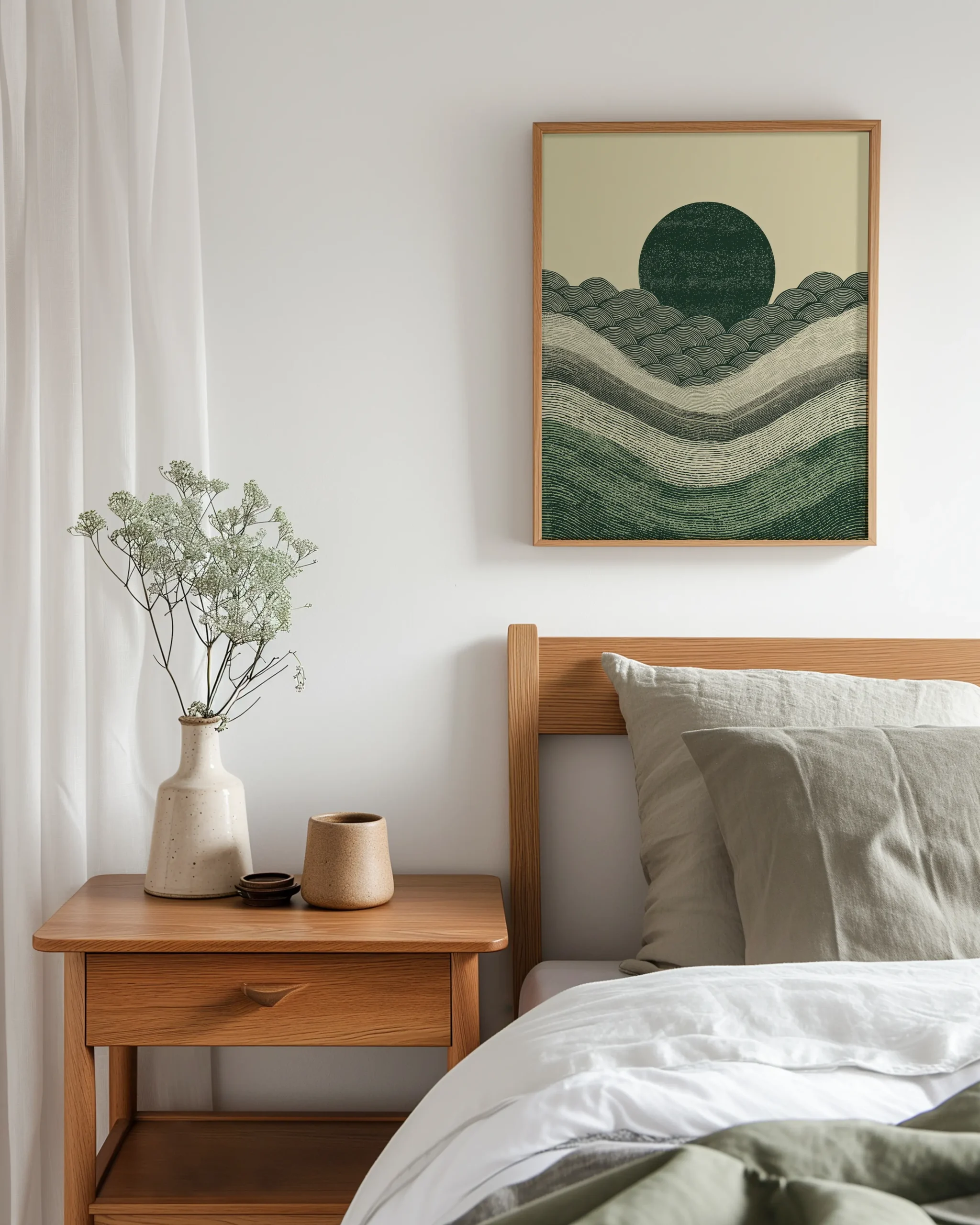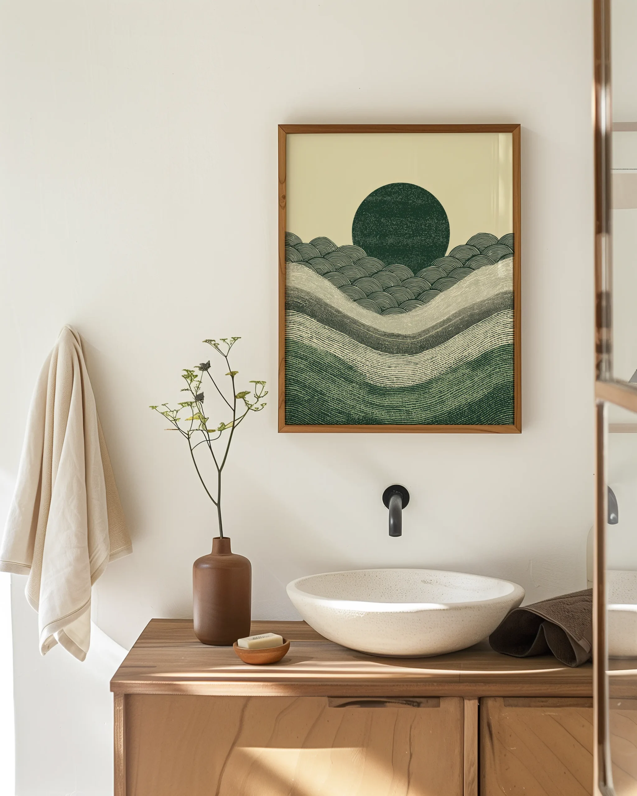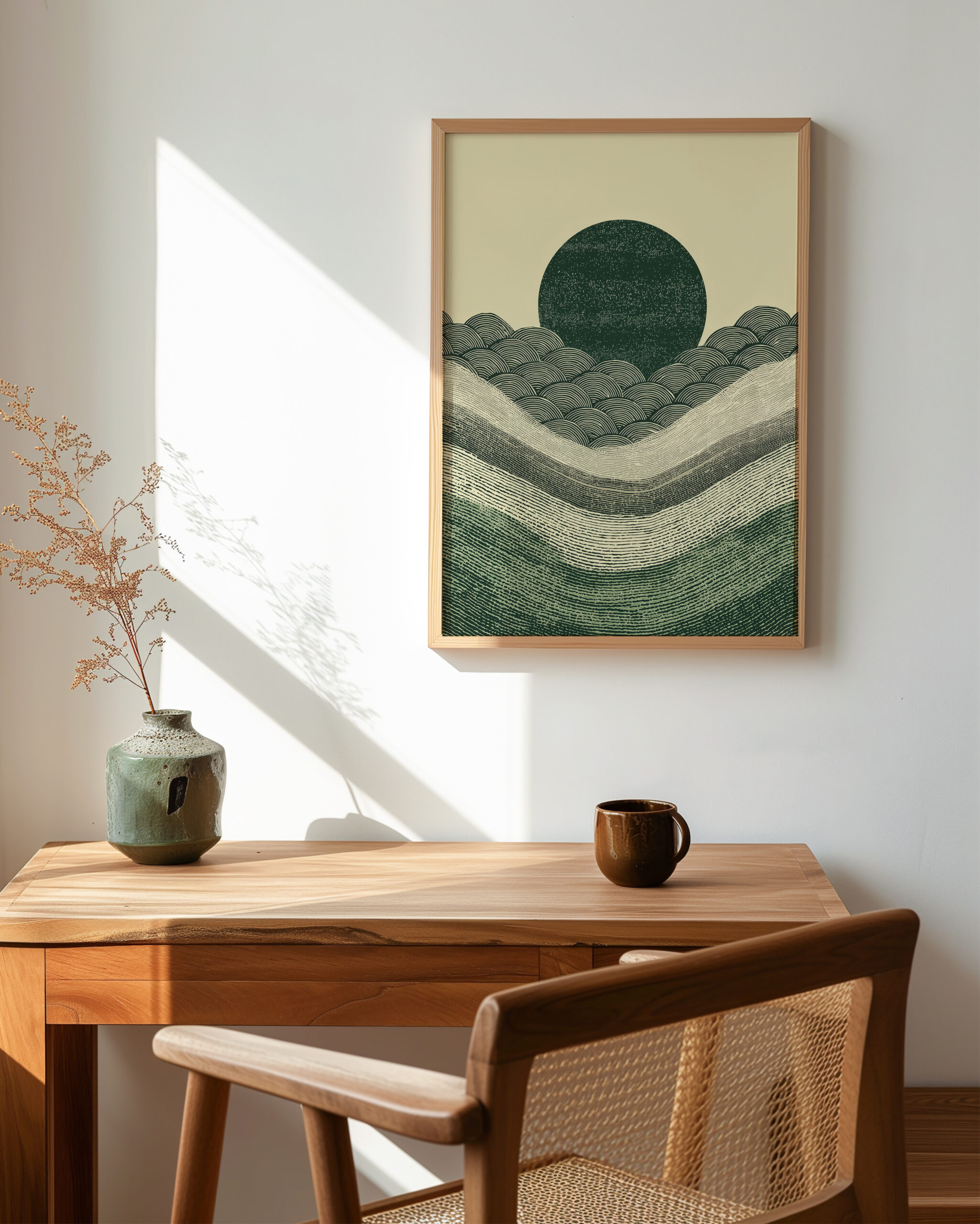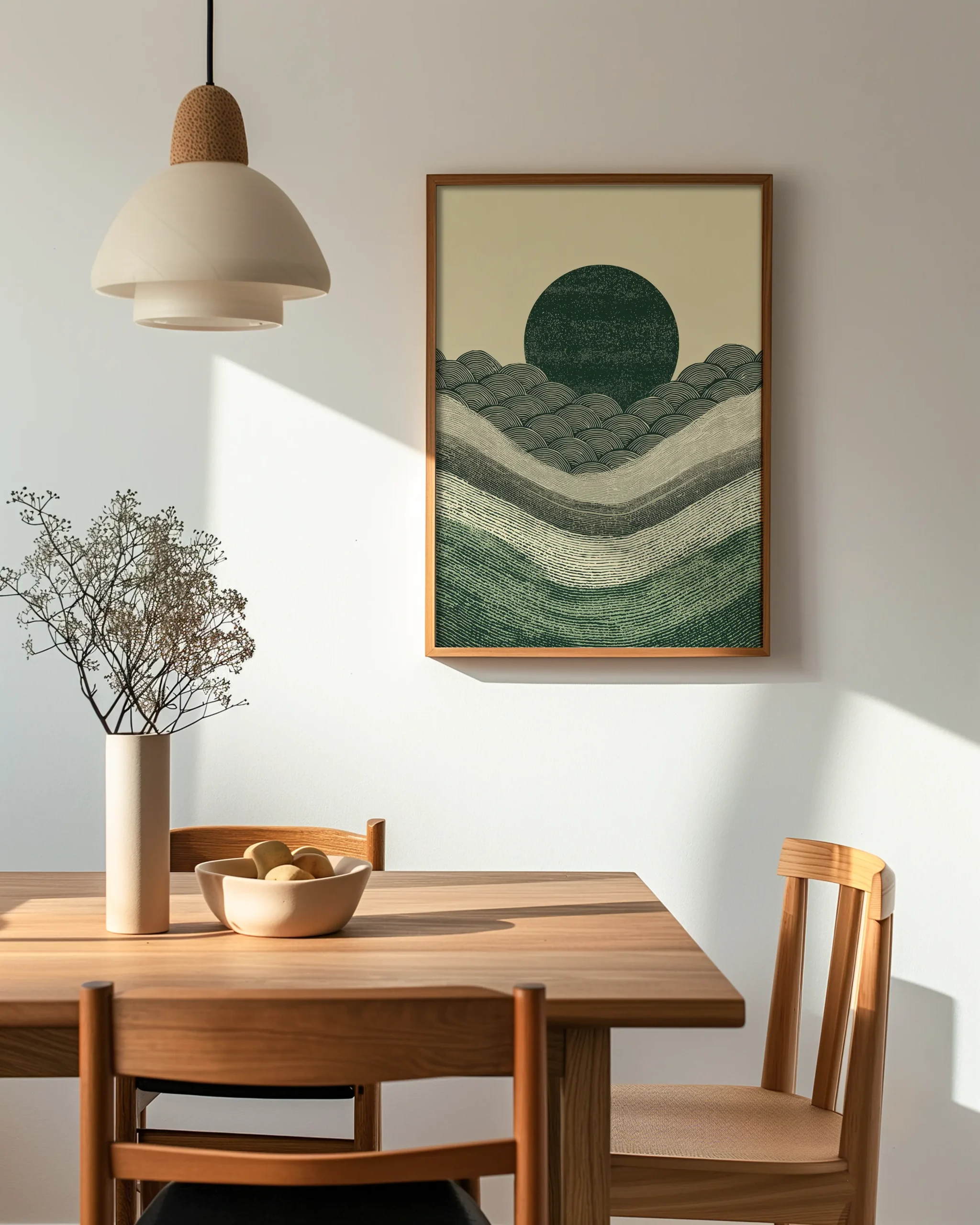 Layered, hand-drawn lines form rolling green hills beneath a bold rising sun. The textured print nods to traditional Japanese motifs while the clean composition and muted palette bring a calm, contemporary Japandi mood to modern spaces.