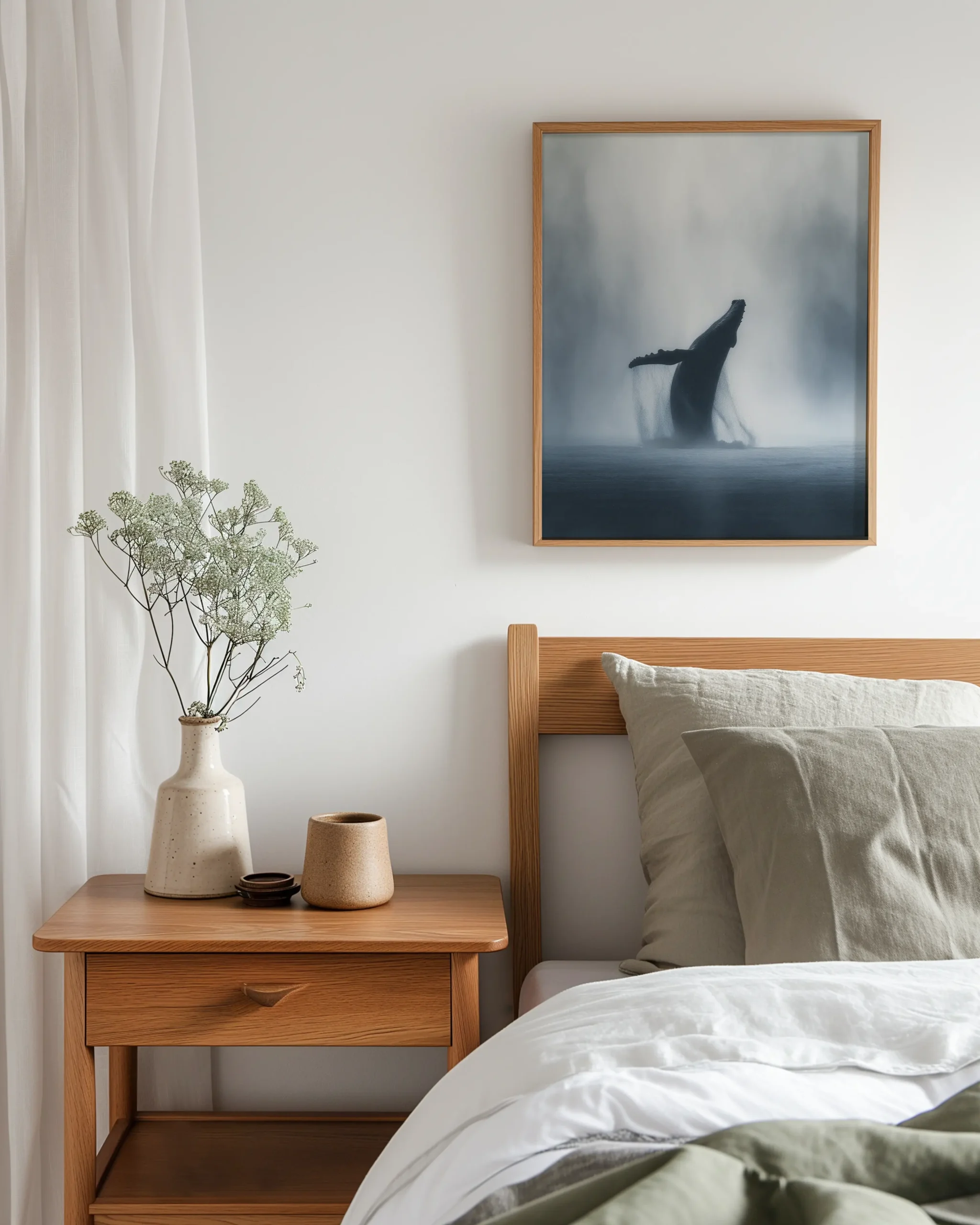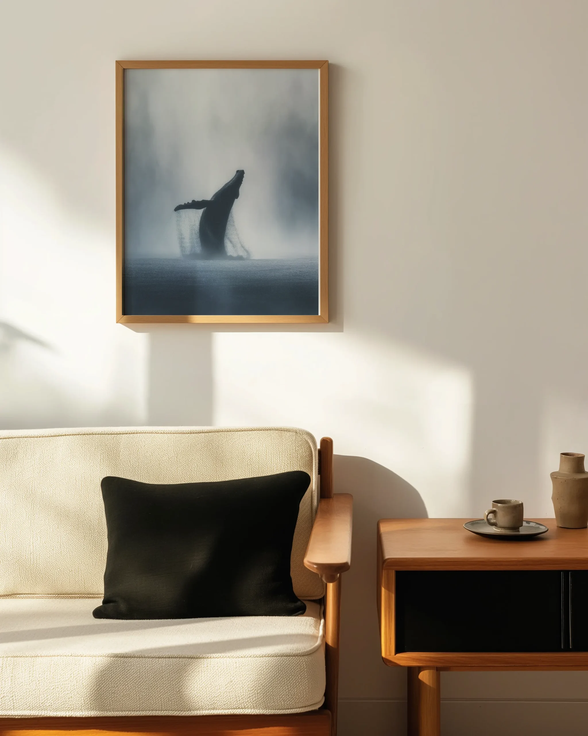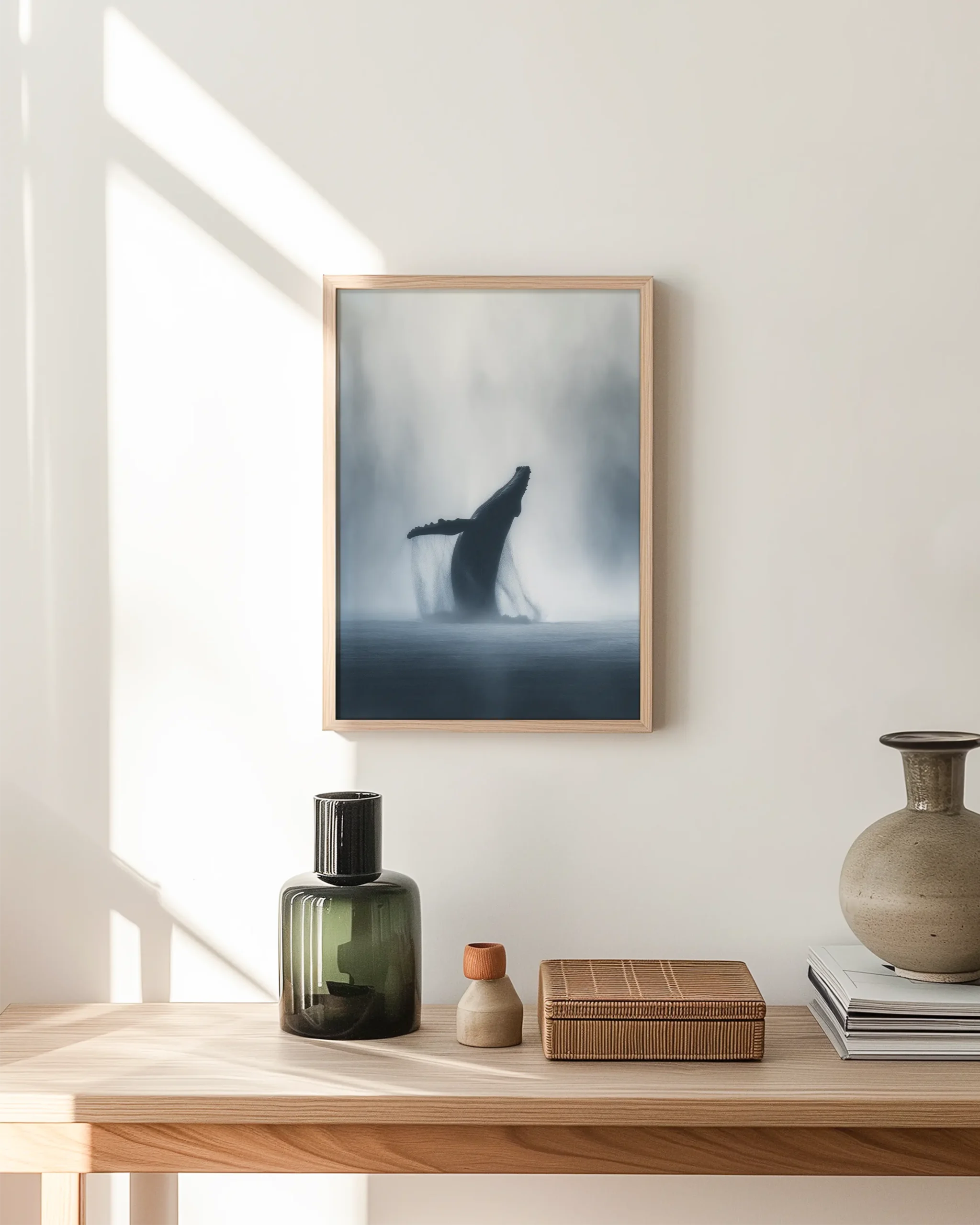 Veils of fog open as a humpback whale breaches, its silhouette suspended above a calm horizon. Soft gradients of blue-grey and clouded white create a contemplative seascape that brings quiet drama to Japandi-inspired interiors.