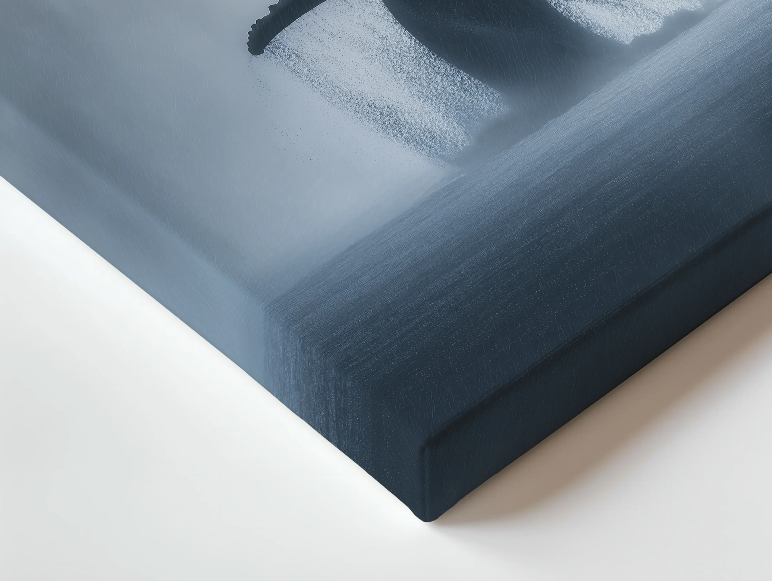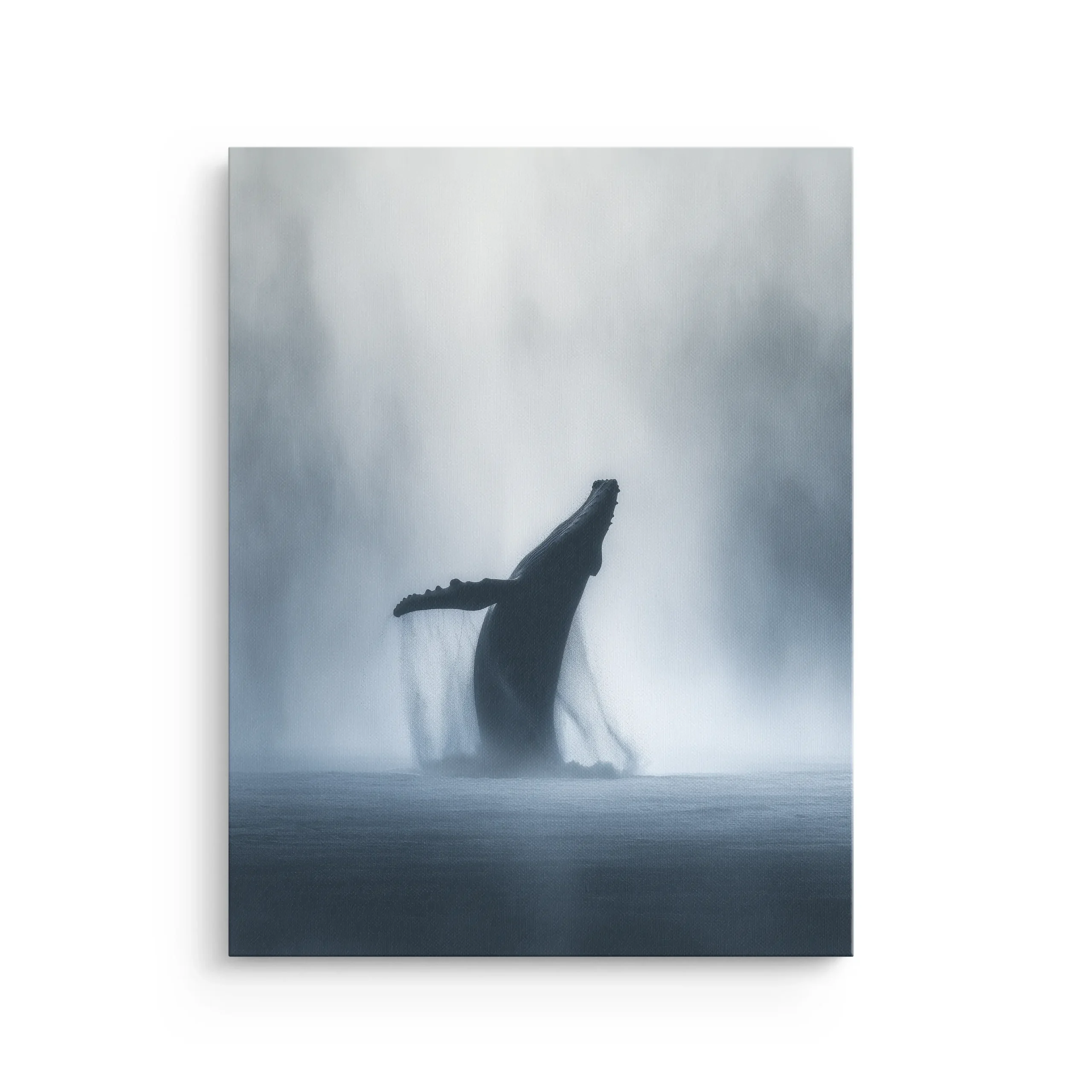 A solitary humpback whale breaks the surface through a veil of fog, capturing quiet power in a calm, minimalist seascape. Cool blue-gray gradients create a Japandi mood that feels still, spacious, and grounding.