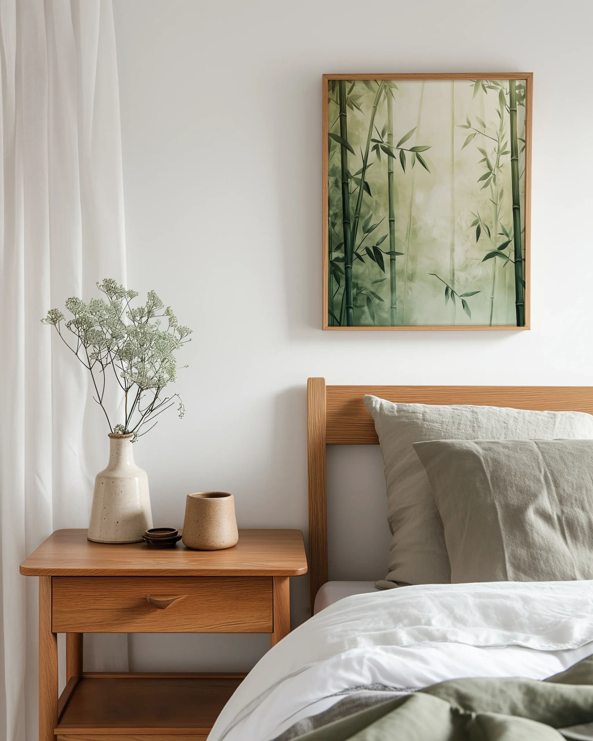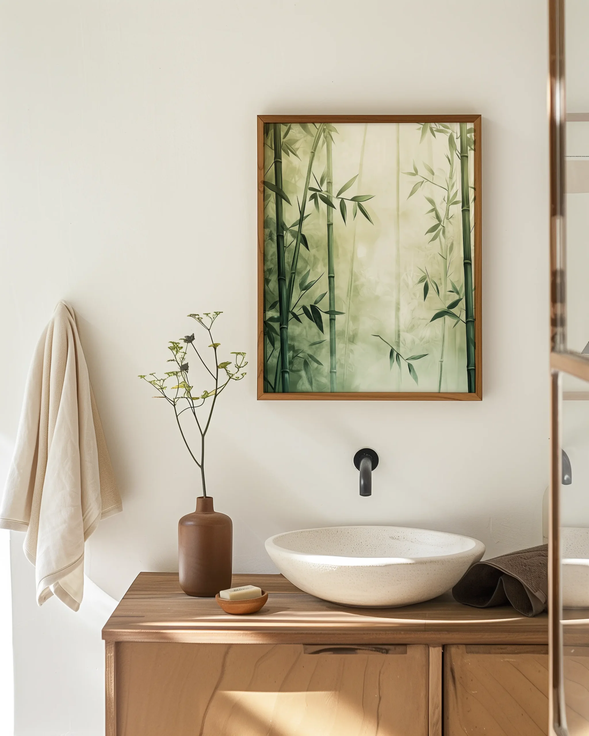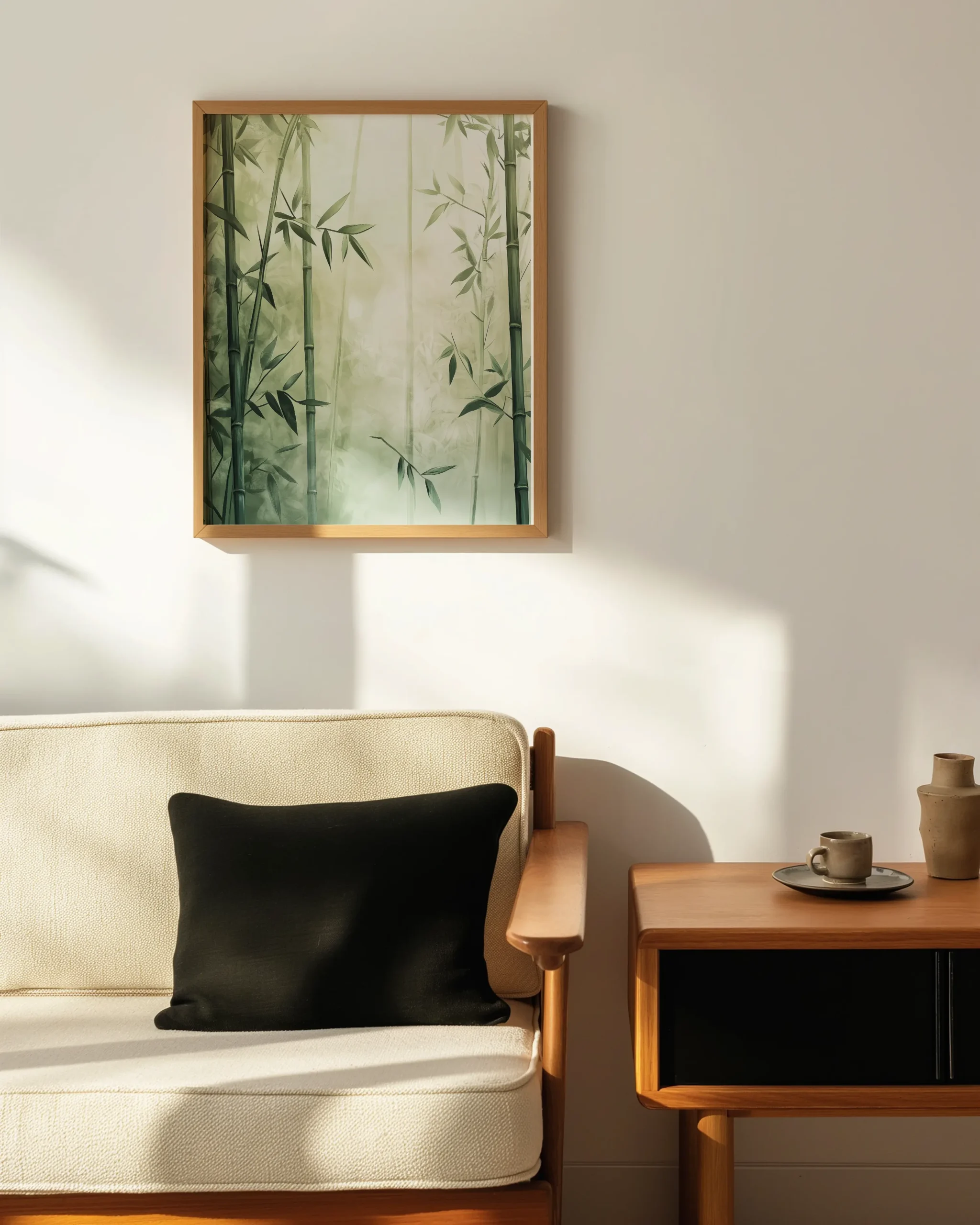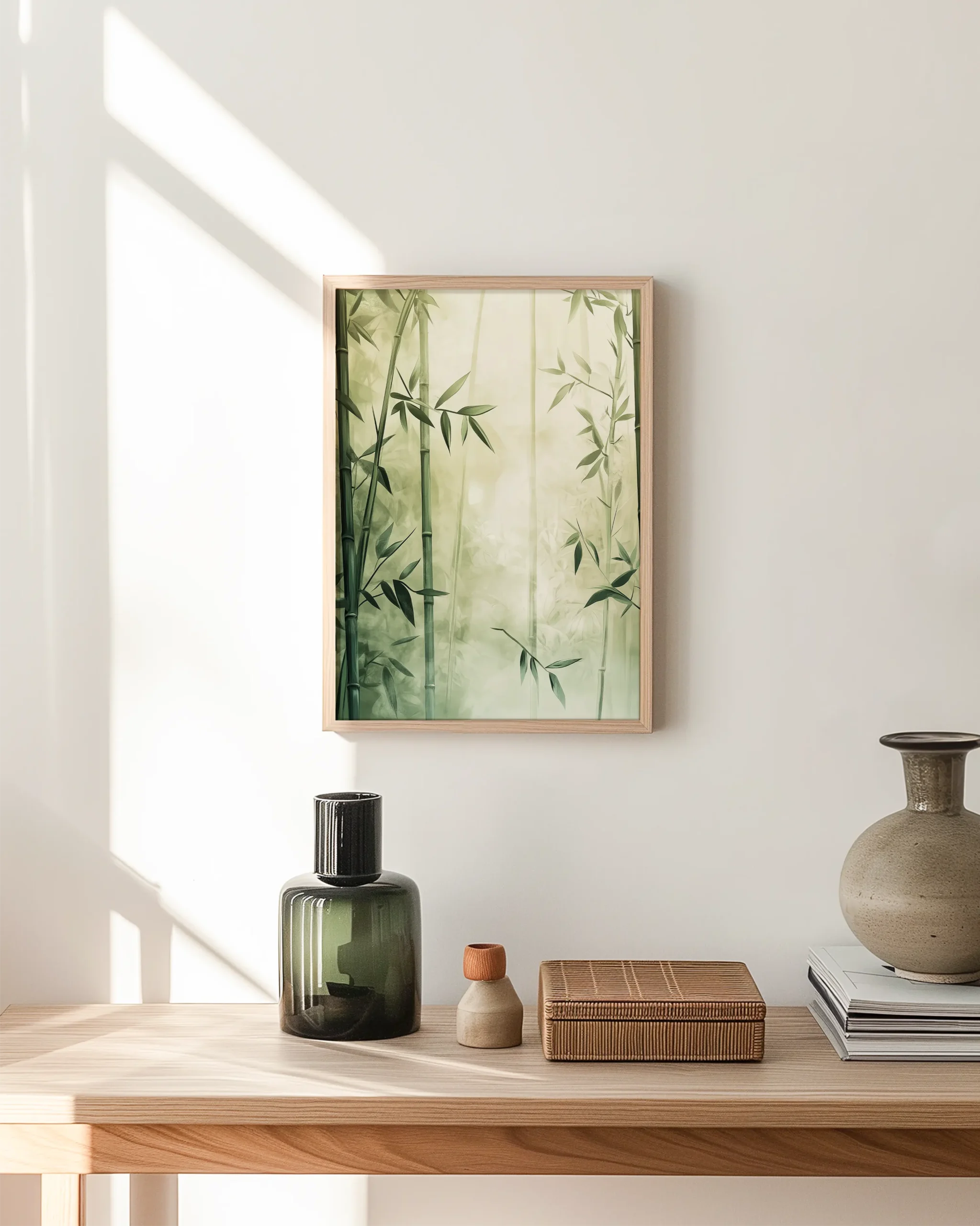 A serene bamboo grove bathed in soft morning mist — a calming Japandi statement for living rooms, bedrooms, or entryways — printed on museum-quality enhanced matte paper. Framed and ready to hang with your preferred frame (Black, White, or Red Oak).