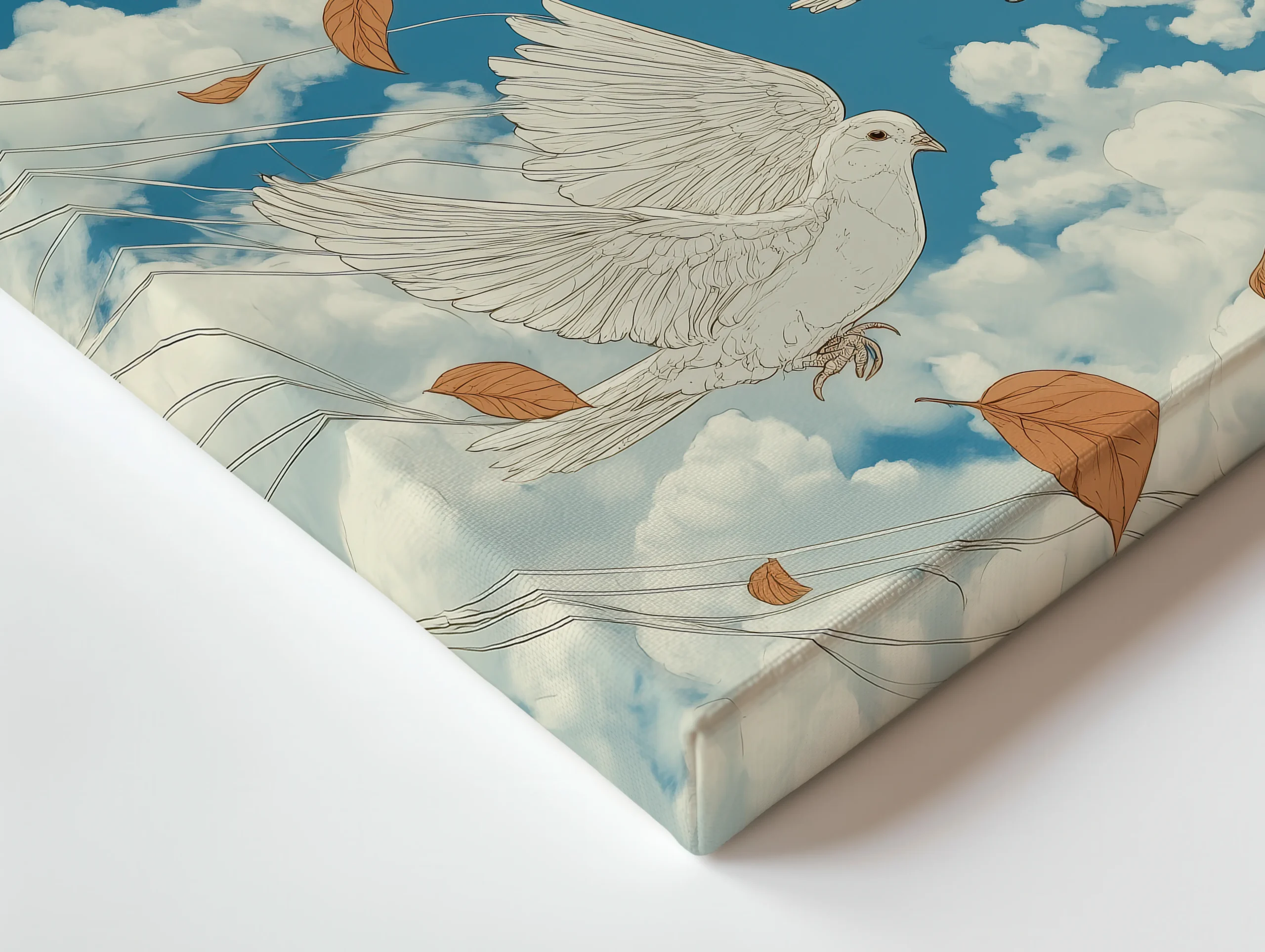 Ukiyo-e inspired sky artwork featuring white doves riding the wind through soft clouds with drifting autumn leaves, printed on a premium thin canvas and ready to hang.