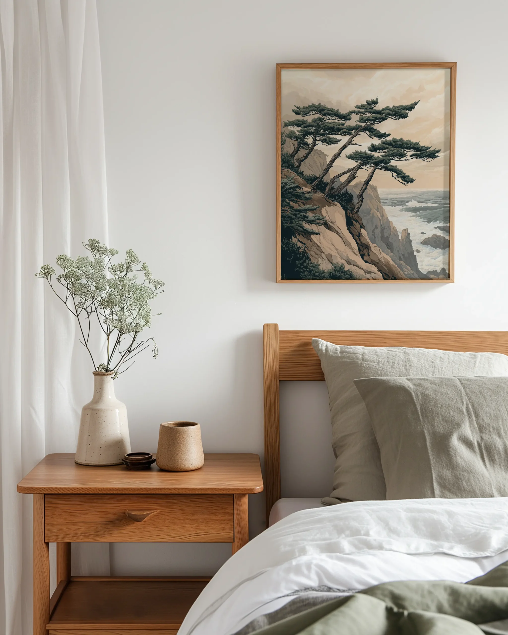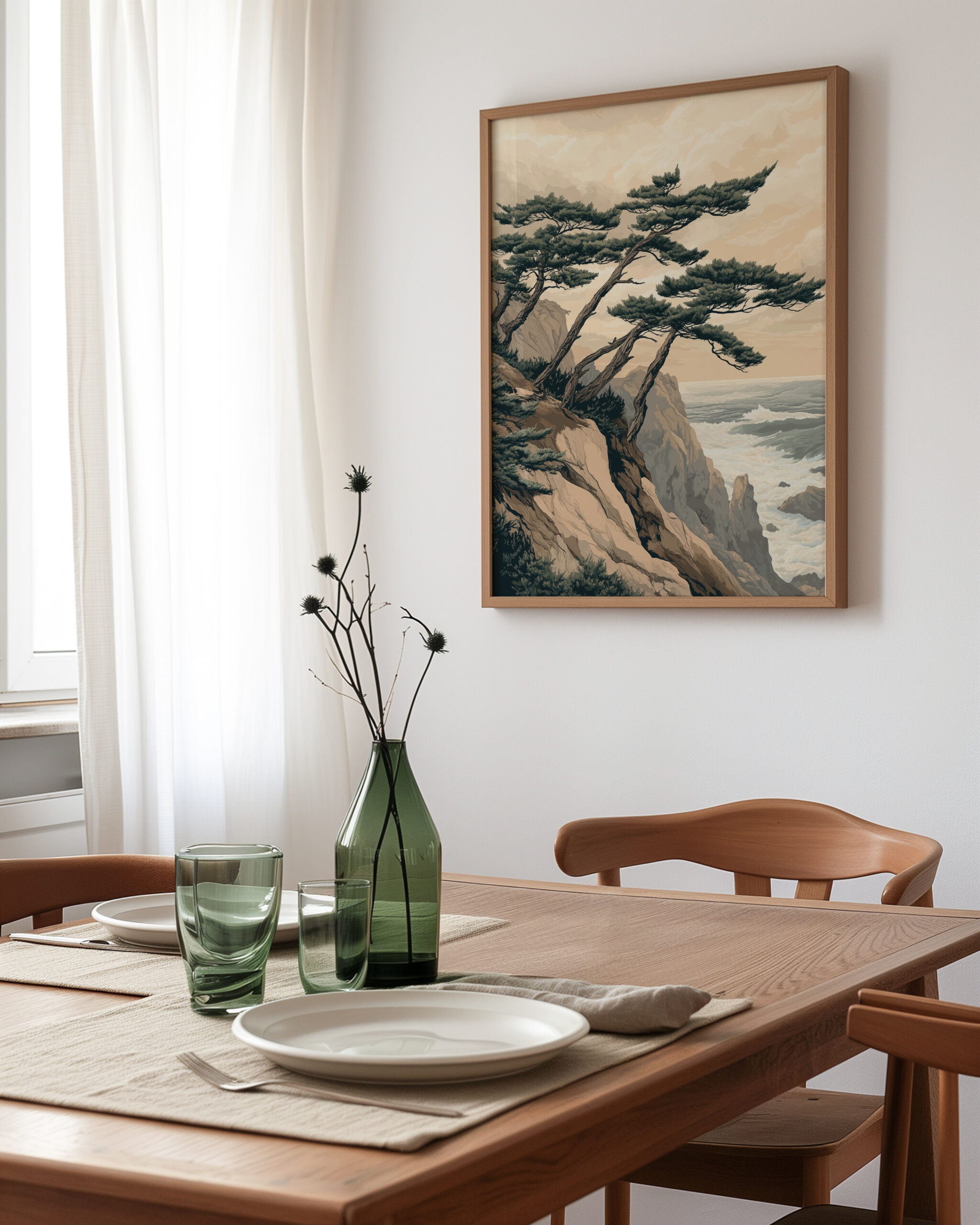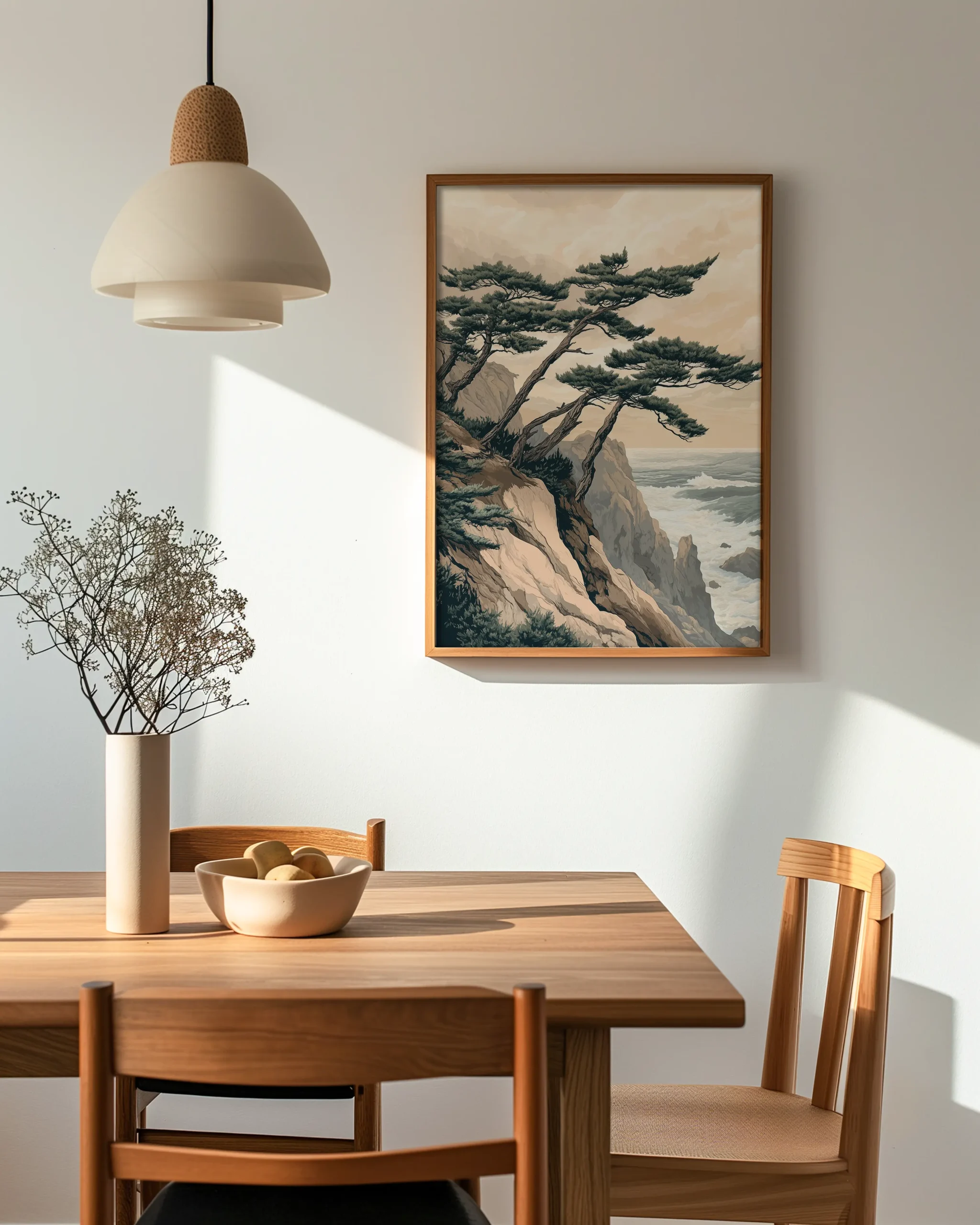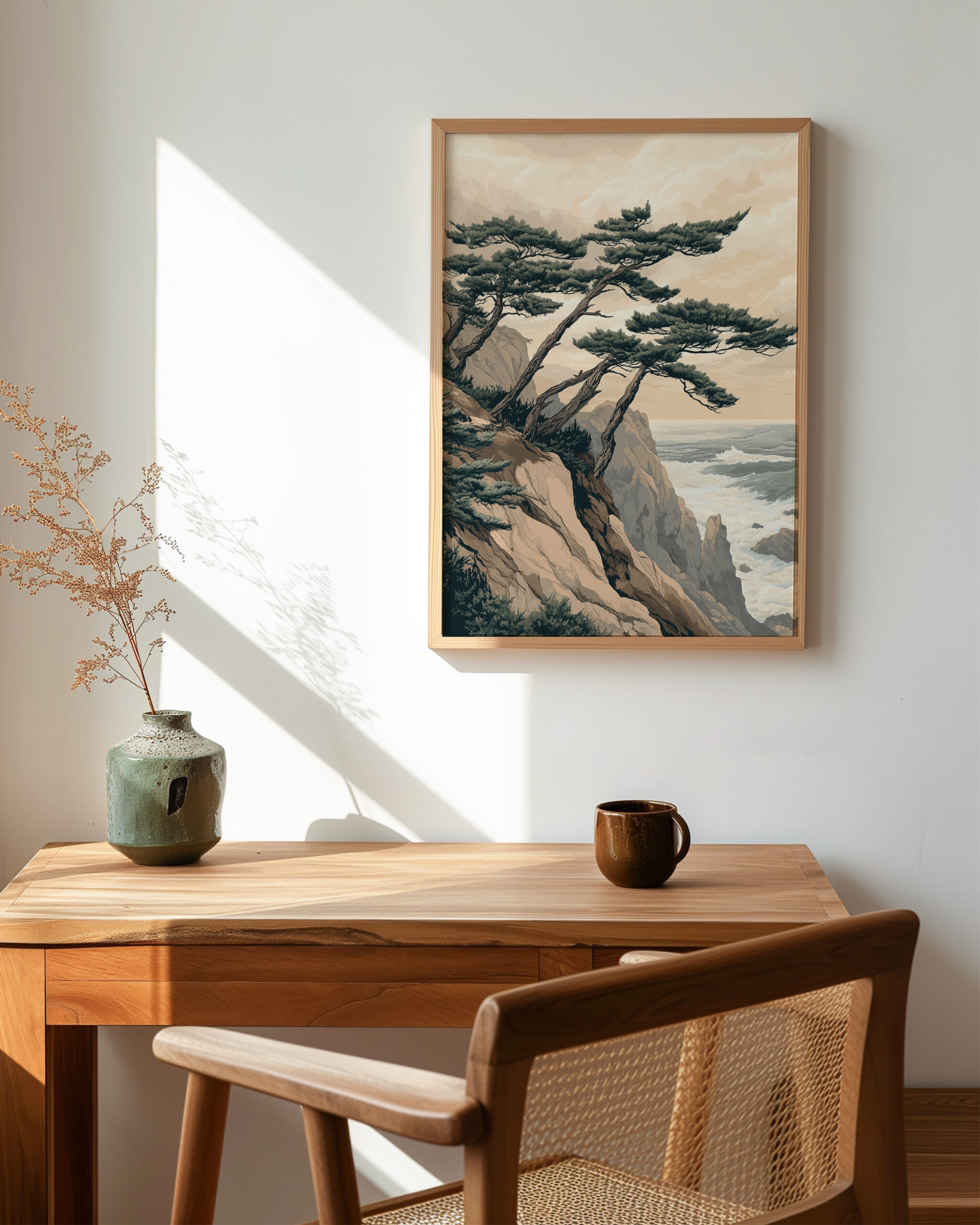 Windswept Pines by the Coast captures the quiet resolve of shore pines shaped by years of ocean wind. Ink-inspired linework and layered neutrals meet sea-washed blues, setting a contemplative scene of cliffs, surf, and sky. The balanced composition brings Japandi calm to living rooms, bedrooms, or entryways that favor natural textures and serene palettes.