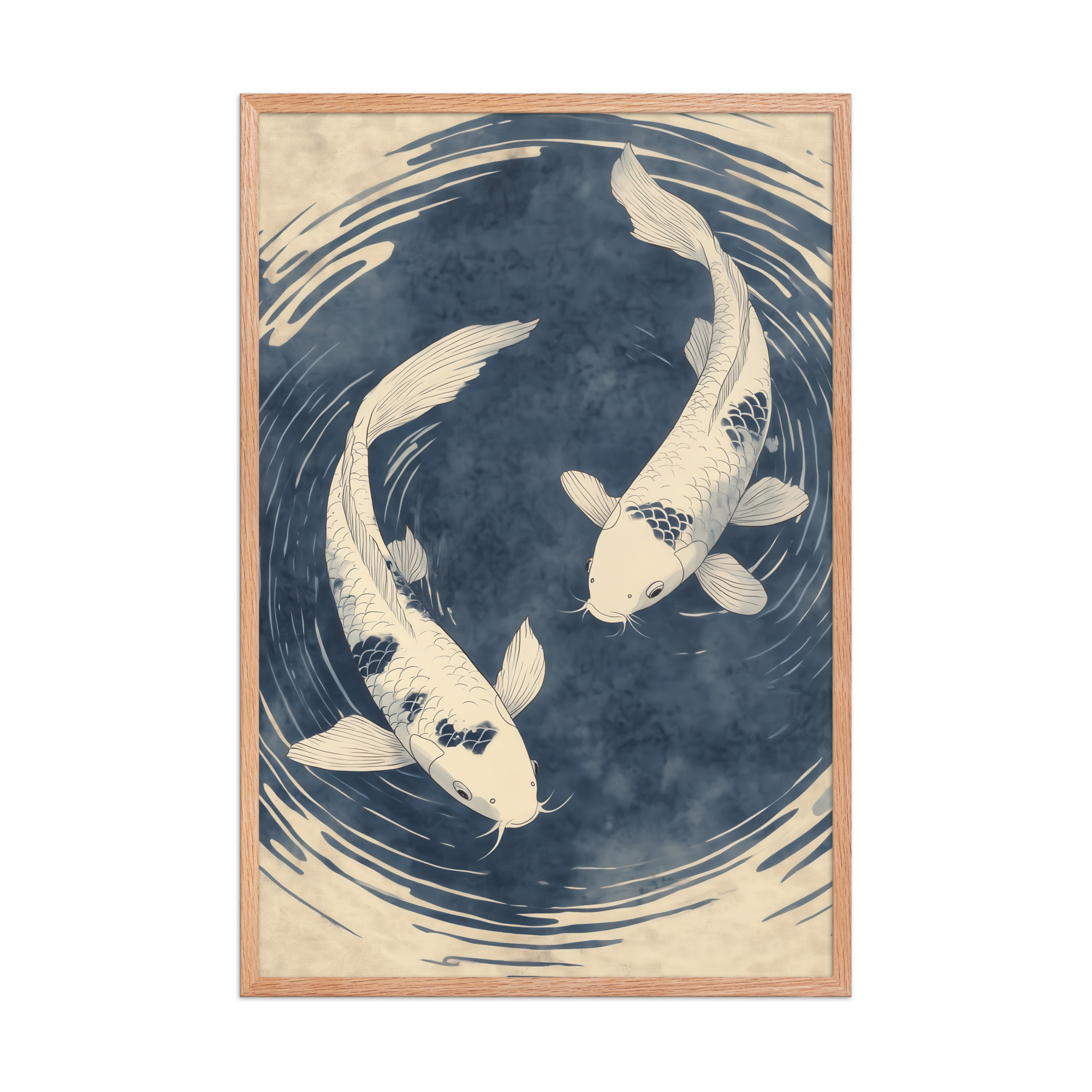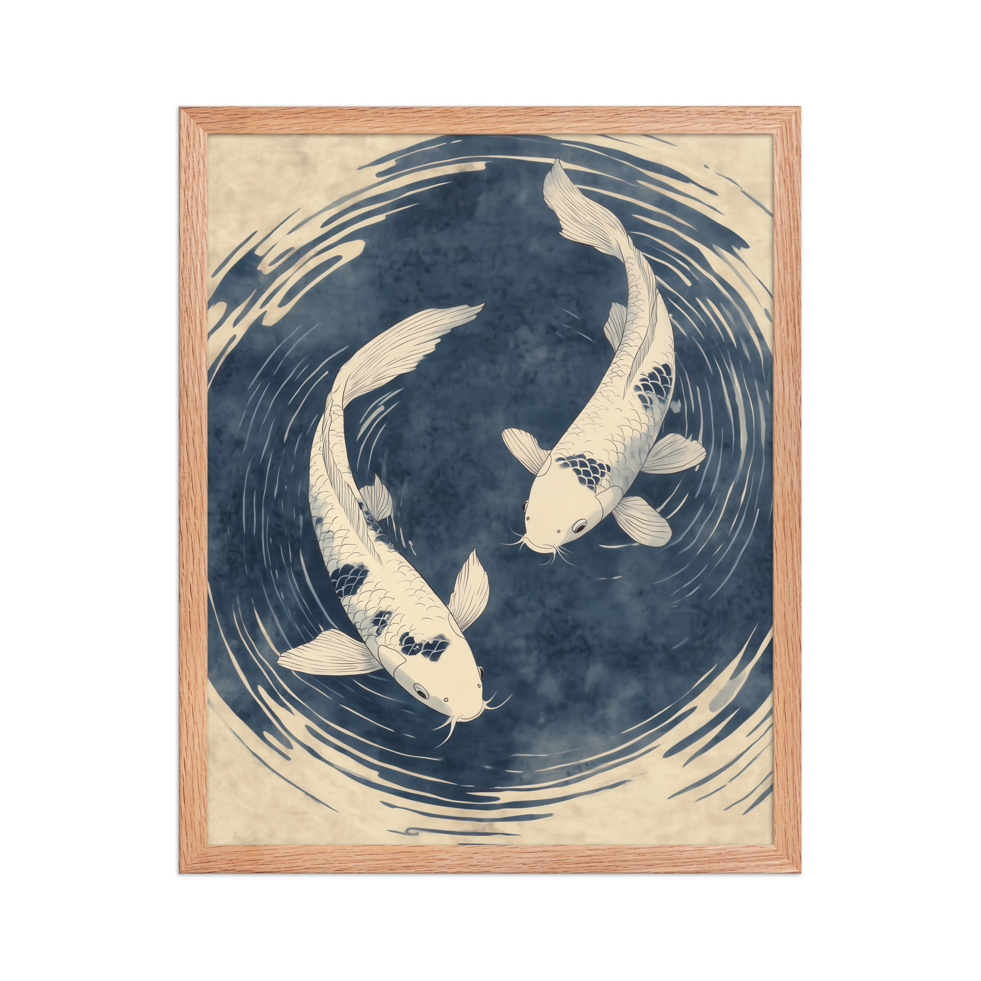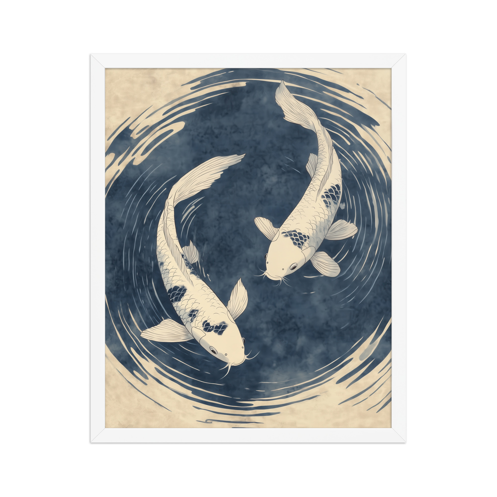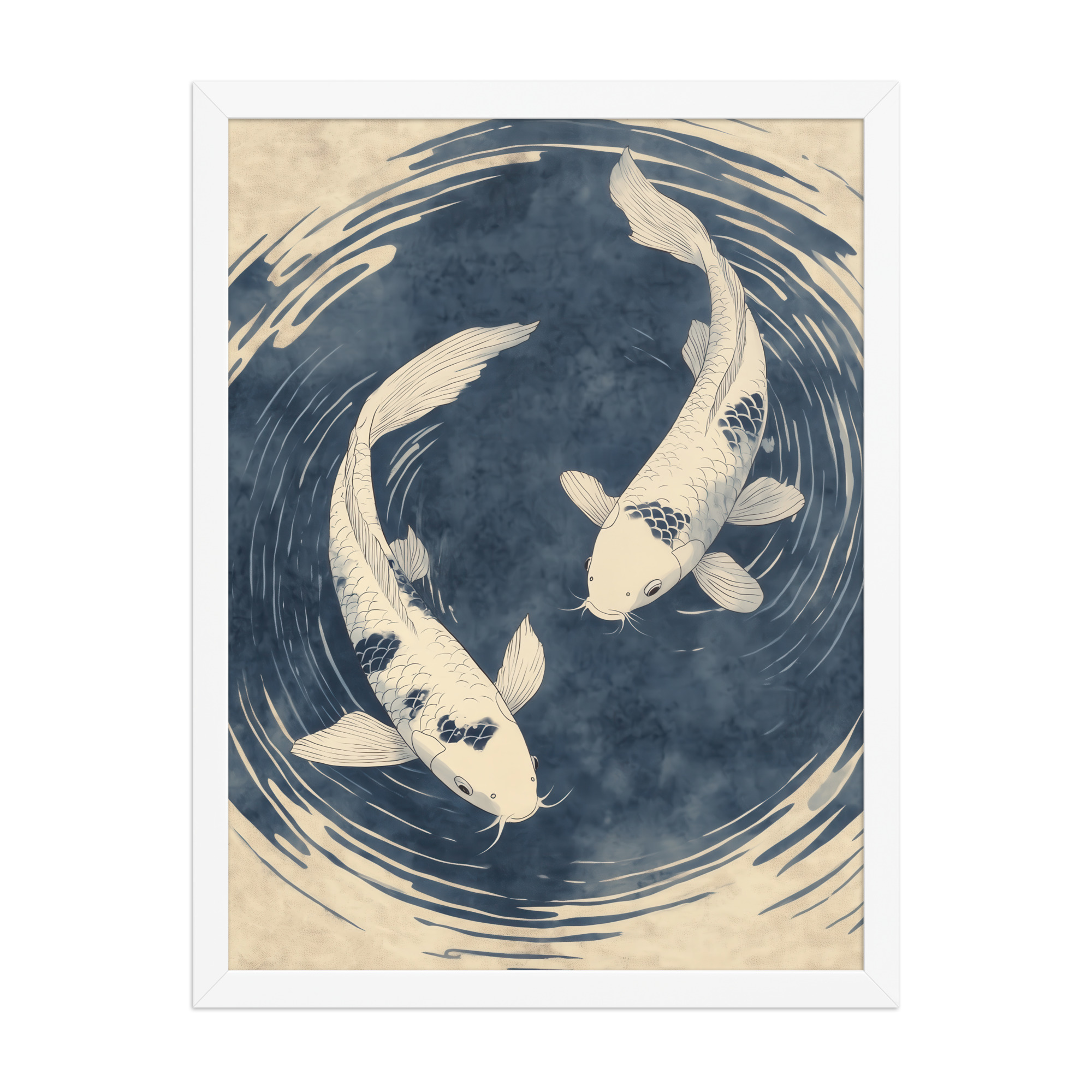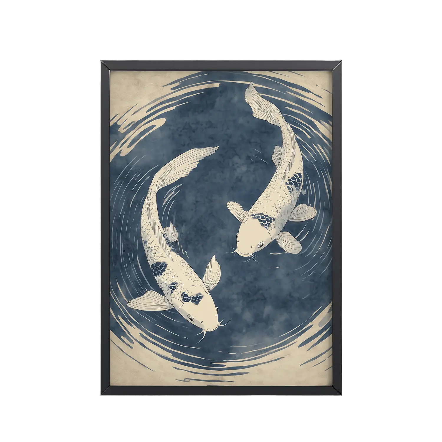 A paired koi duet drifts in a quiet circle, echoing yin–yang balance and renewal. Indigo washes over warm parchment tones for a refined, Japanese-inspired statement that fits effortlessly with Japandi interiors.