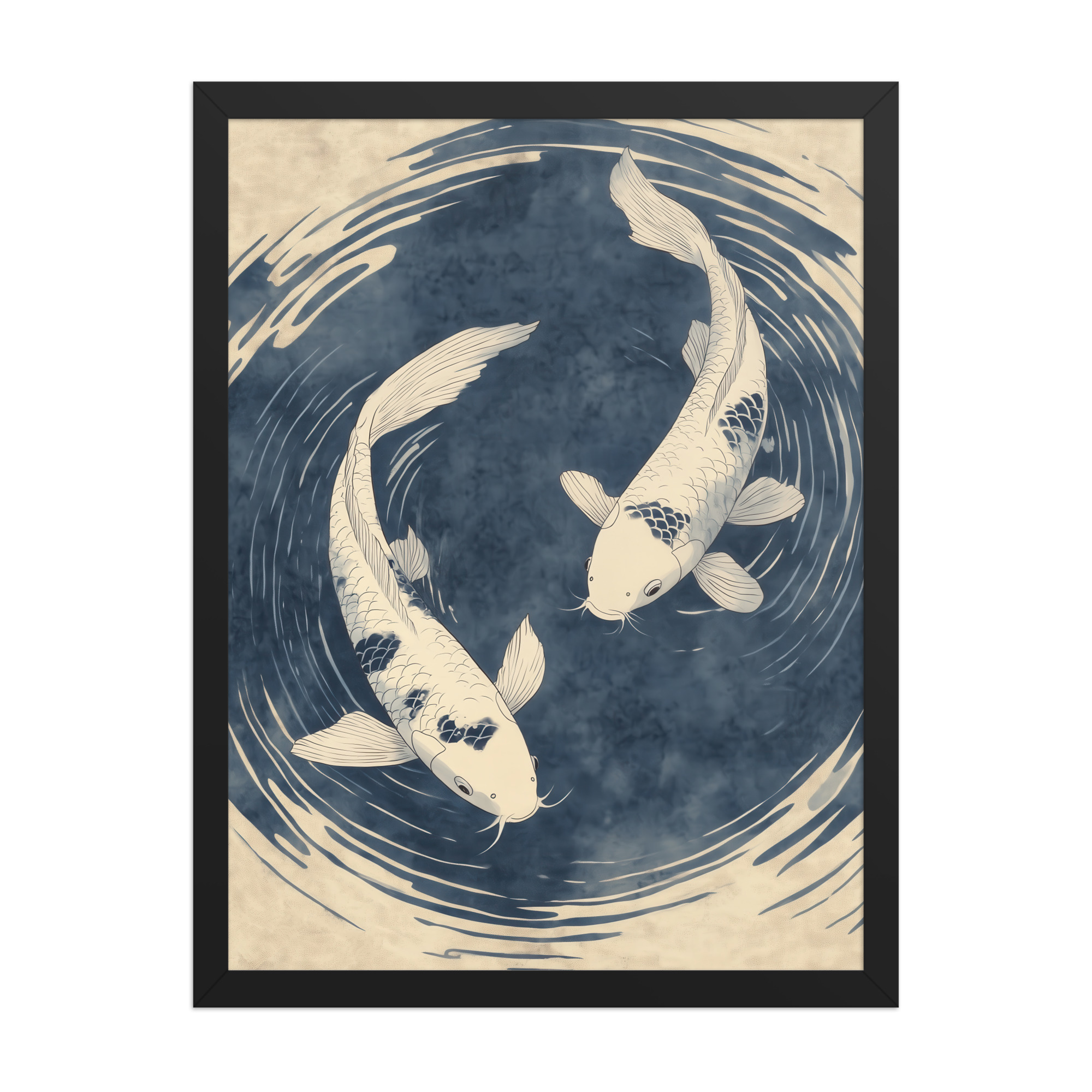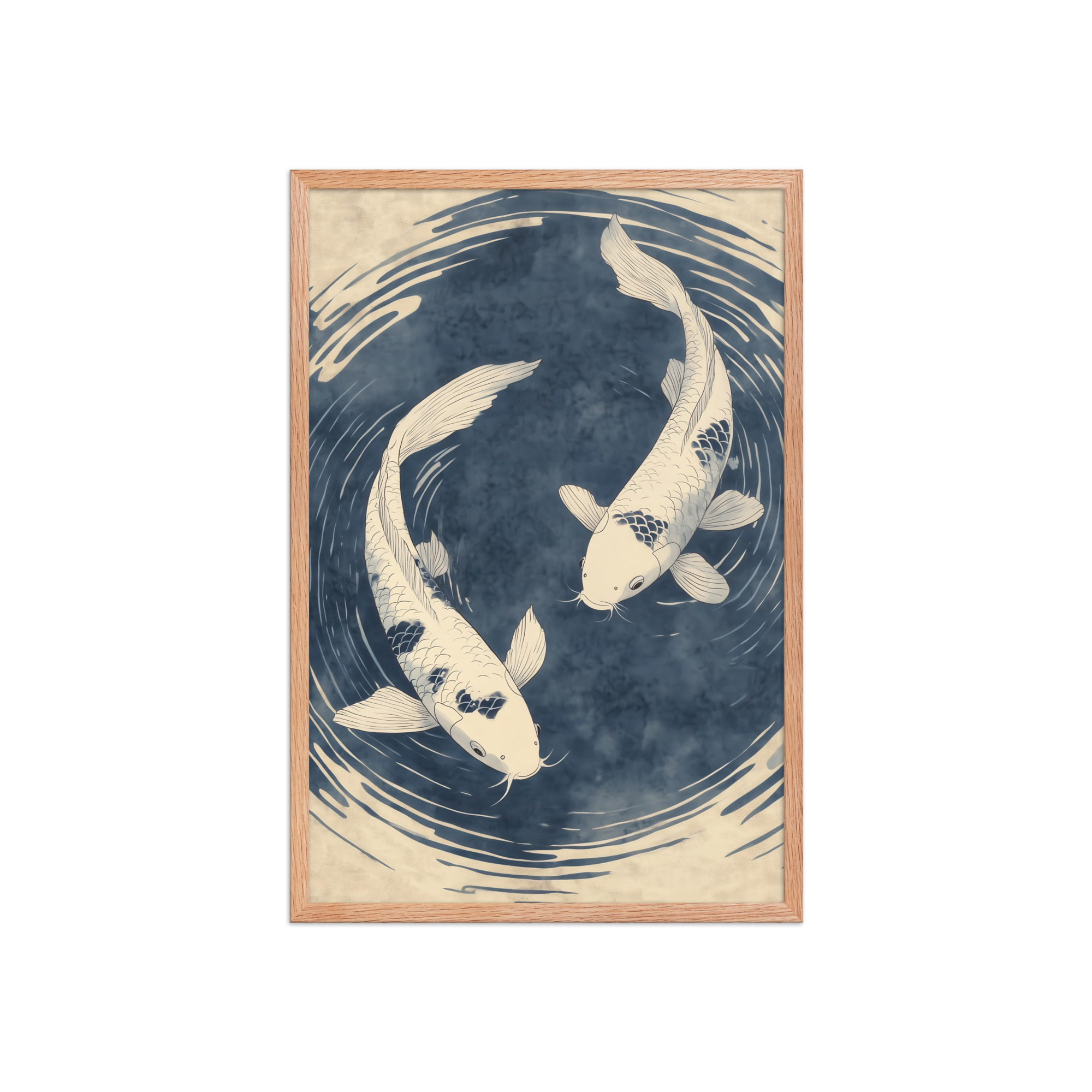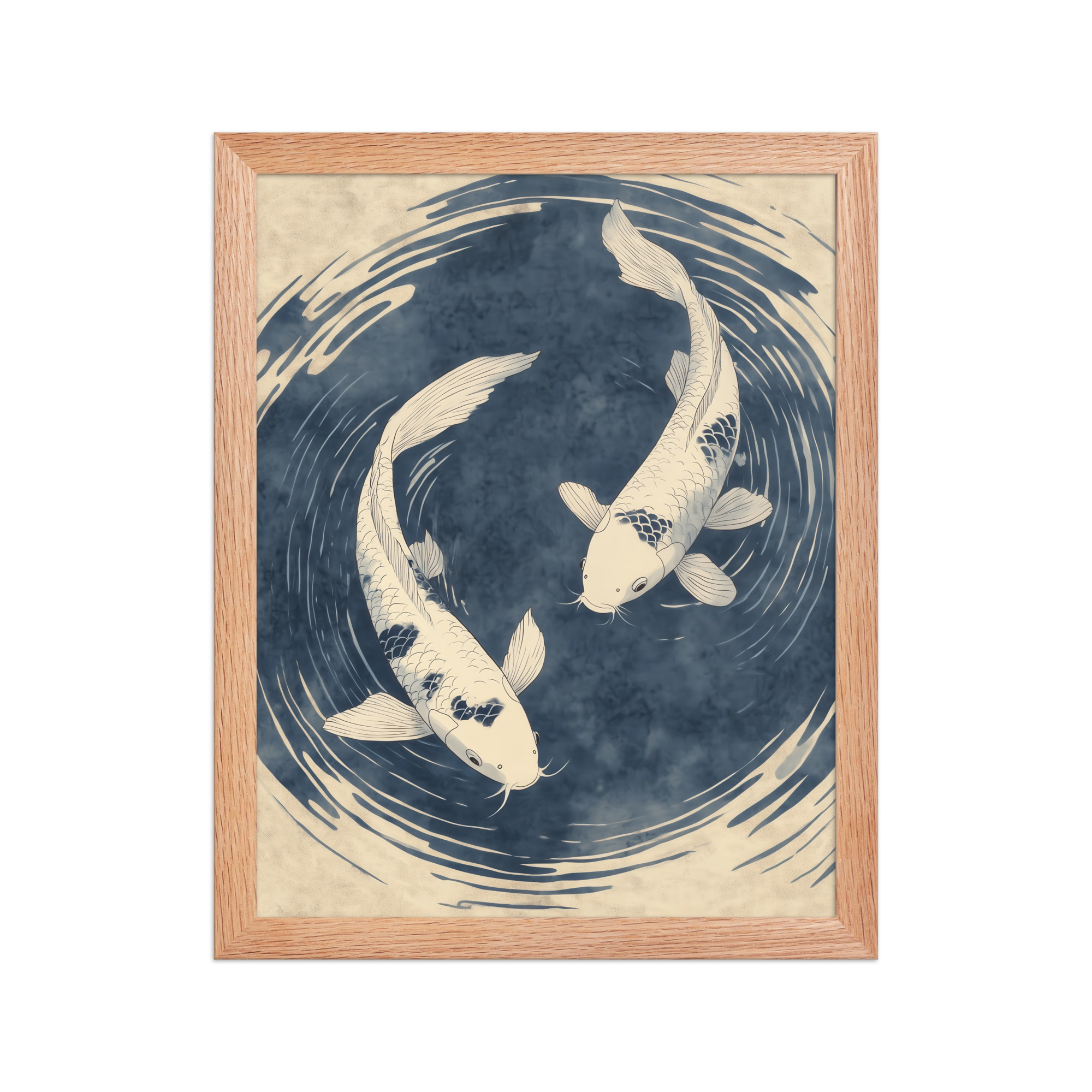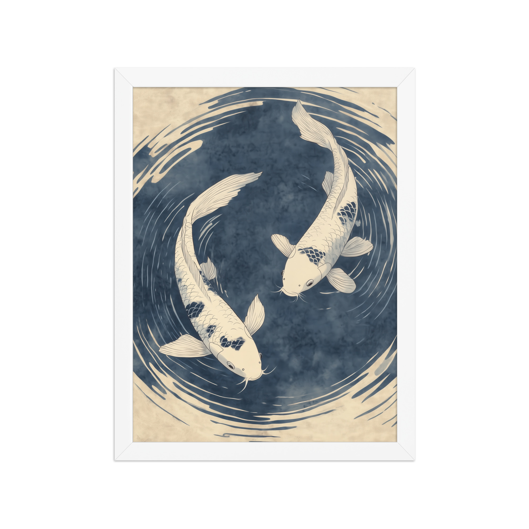 A paired koi duet drifts in a quiet circle, echoing yin–yang balance and renewal. Indigo washes over warm parchment tones for a refined, Japanese-inspired statement that fits effortlessly with Japandi interiors.