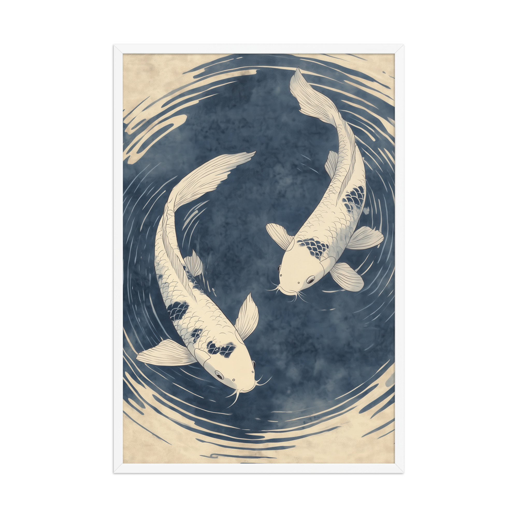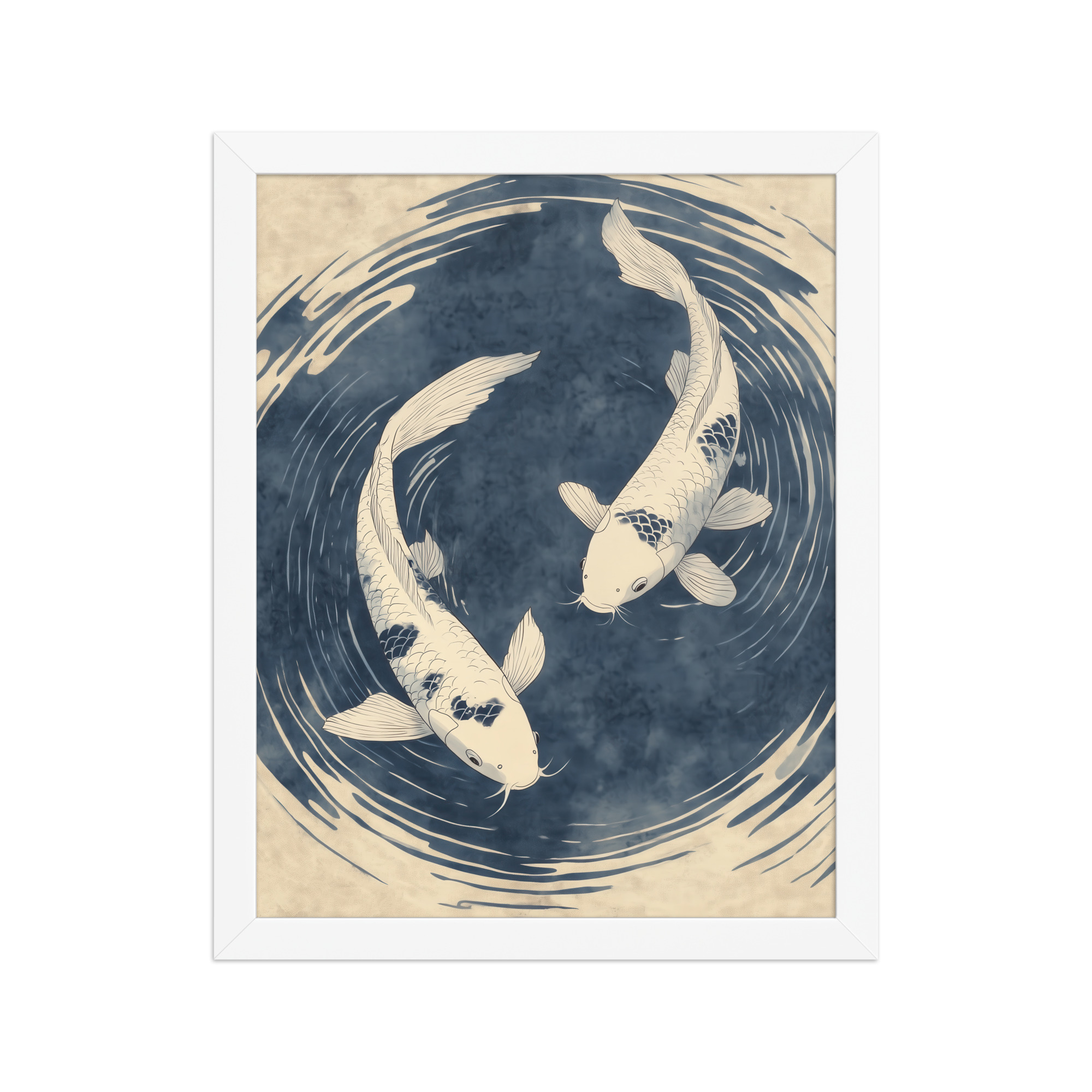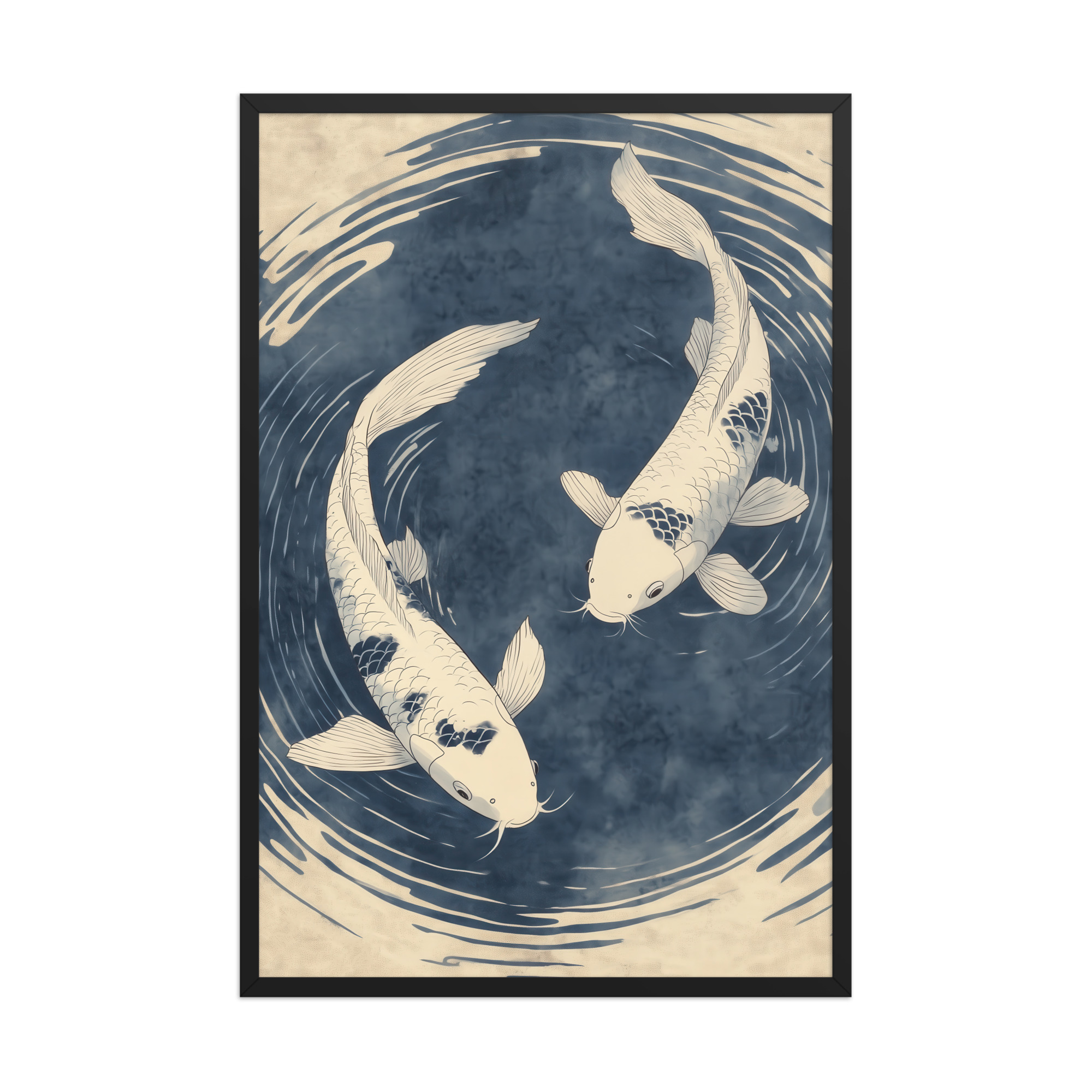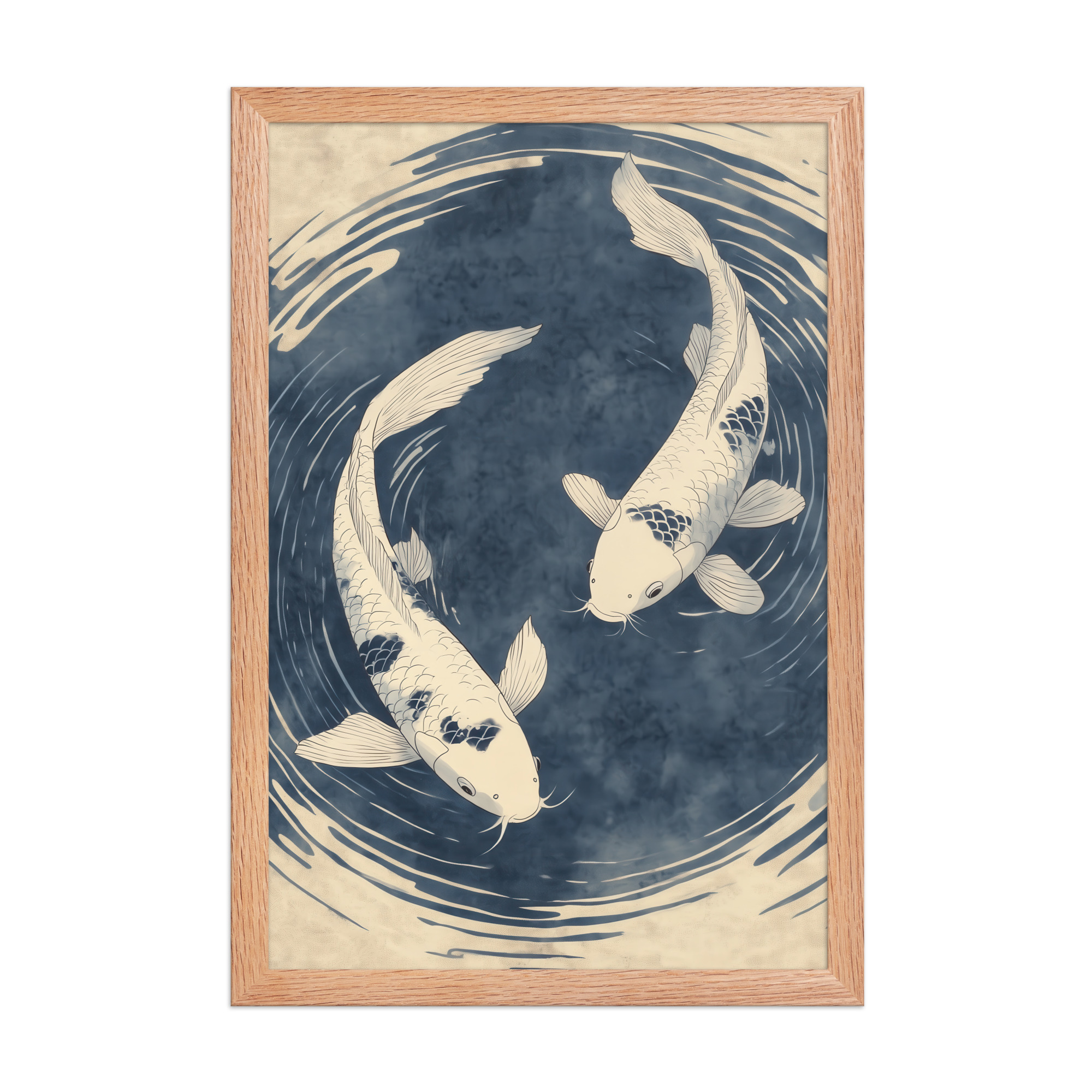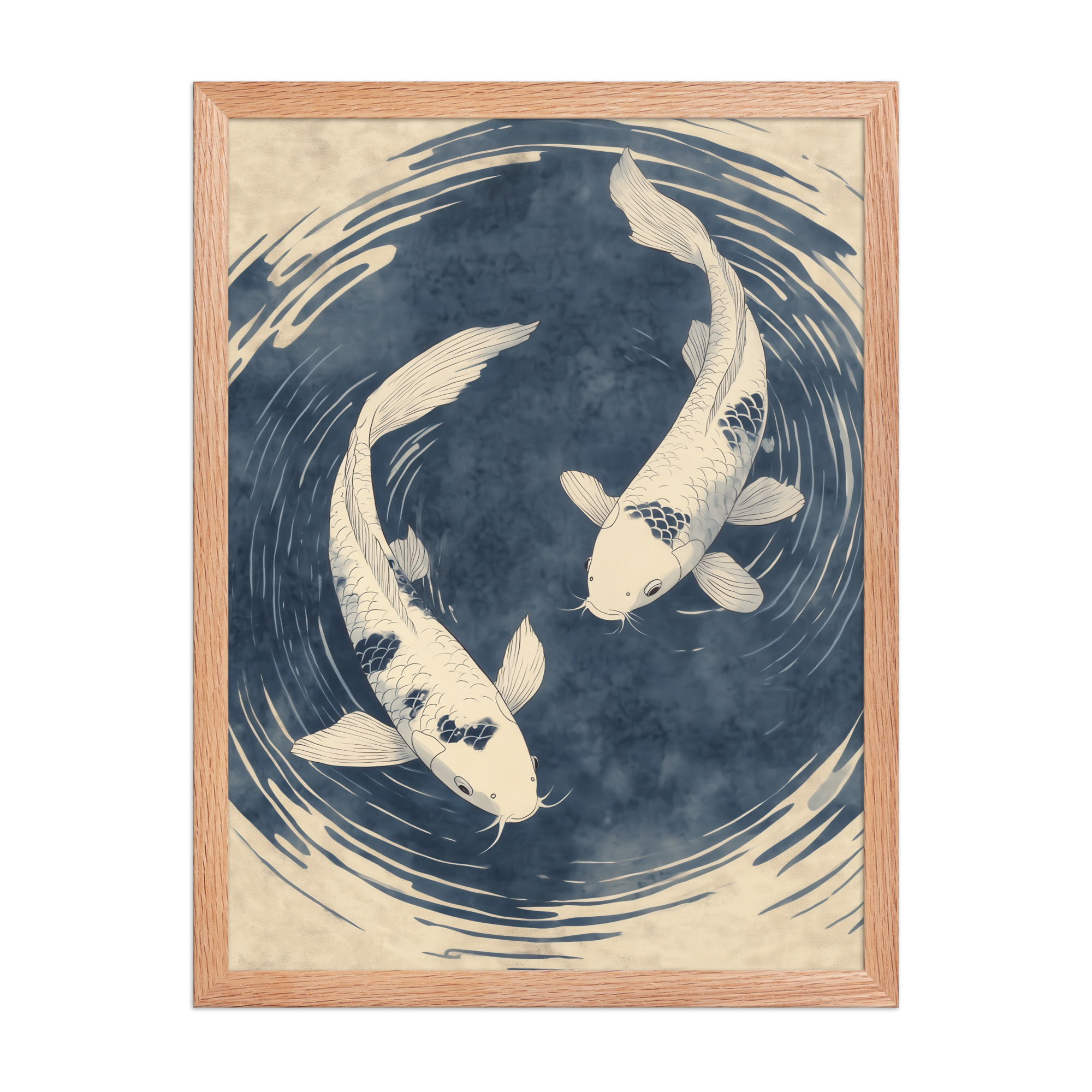 A paired koi duet drifts in a quiet circle, echoing yin–yang balance and renewal. Indigo washes over warm parchment tones for a refined, Japanese-inspired statement that fits effortlessly with Japandi interiors.