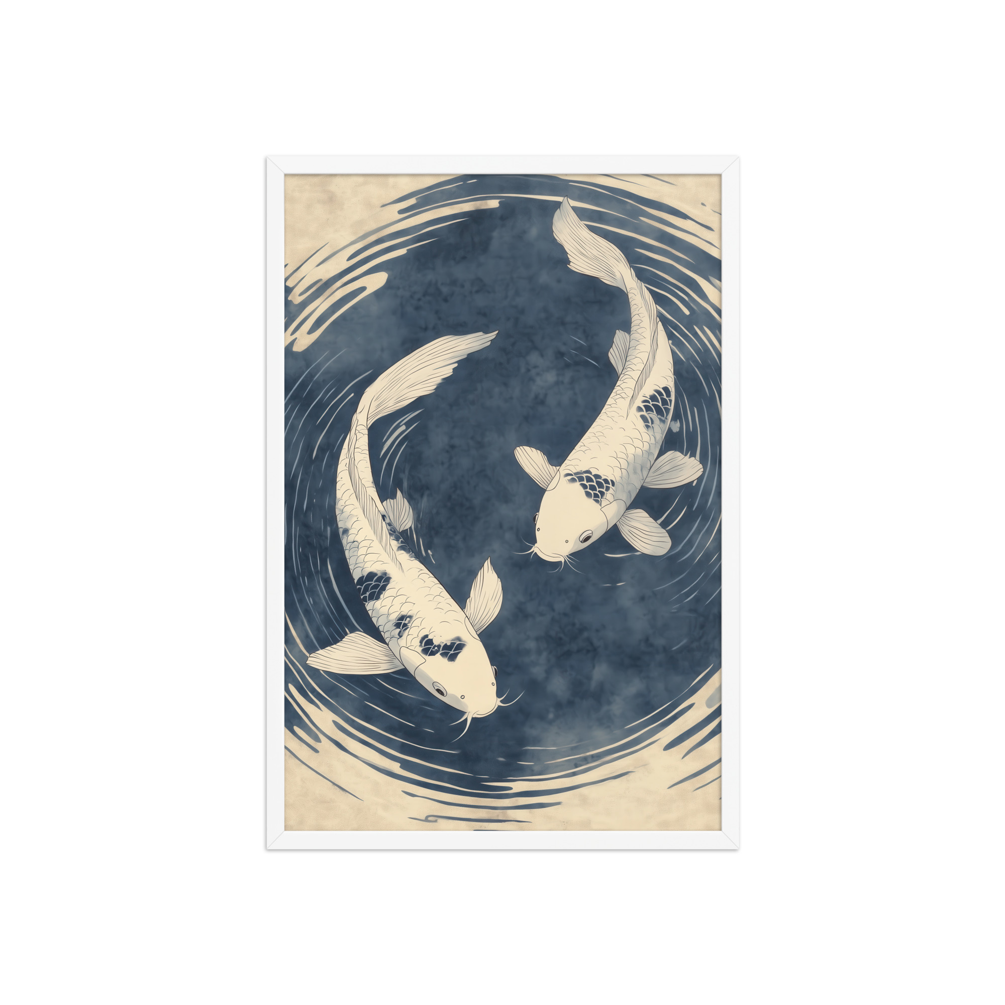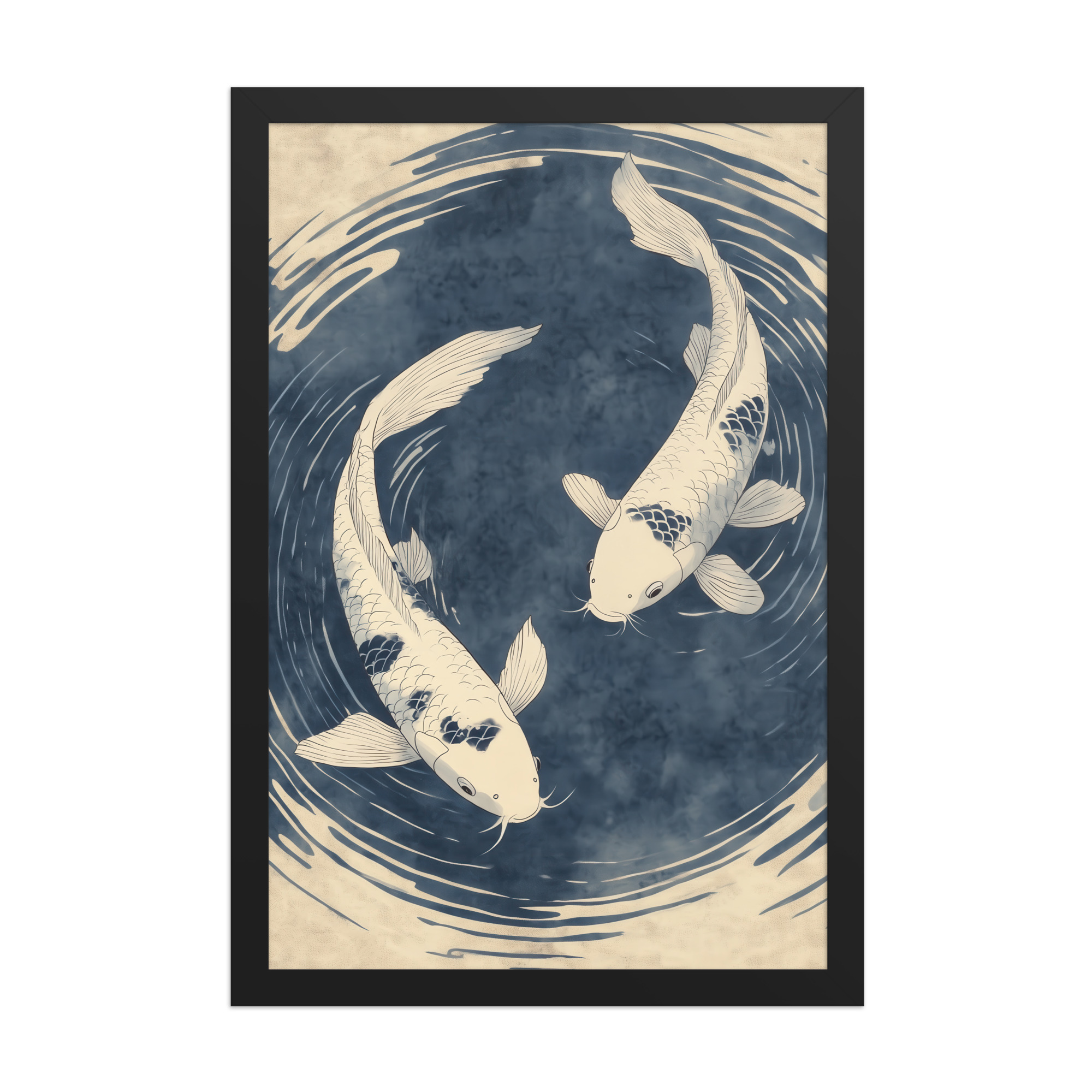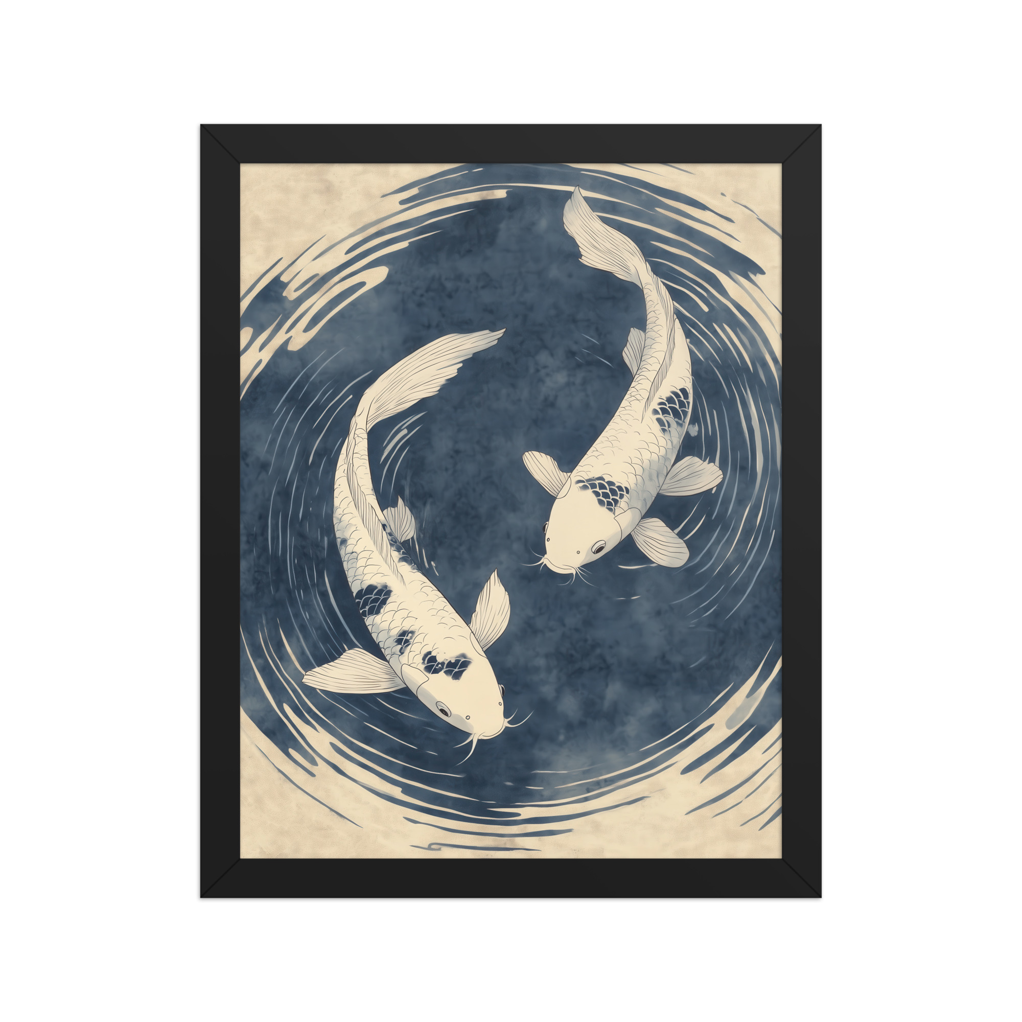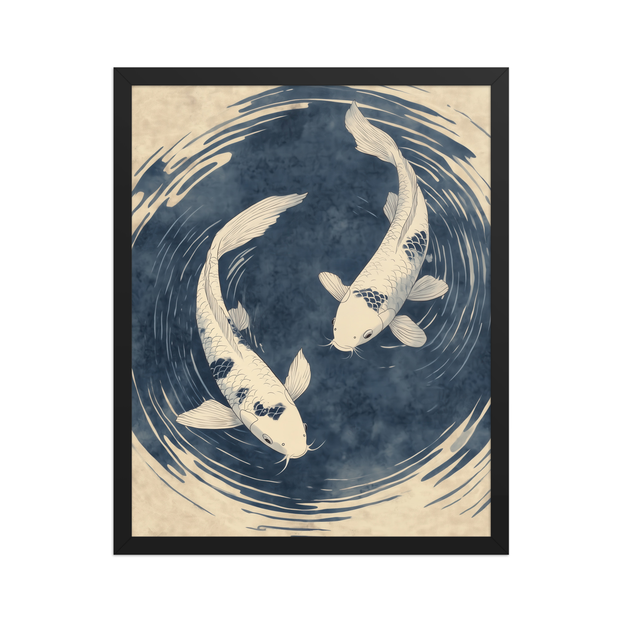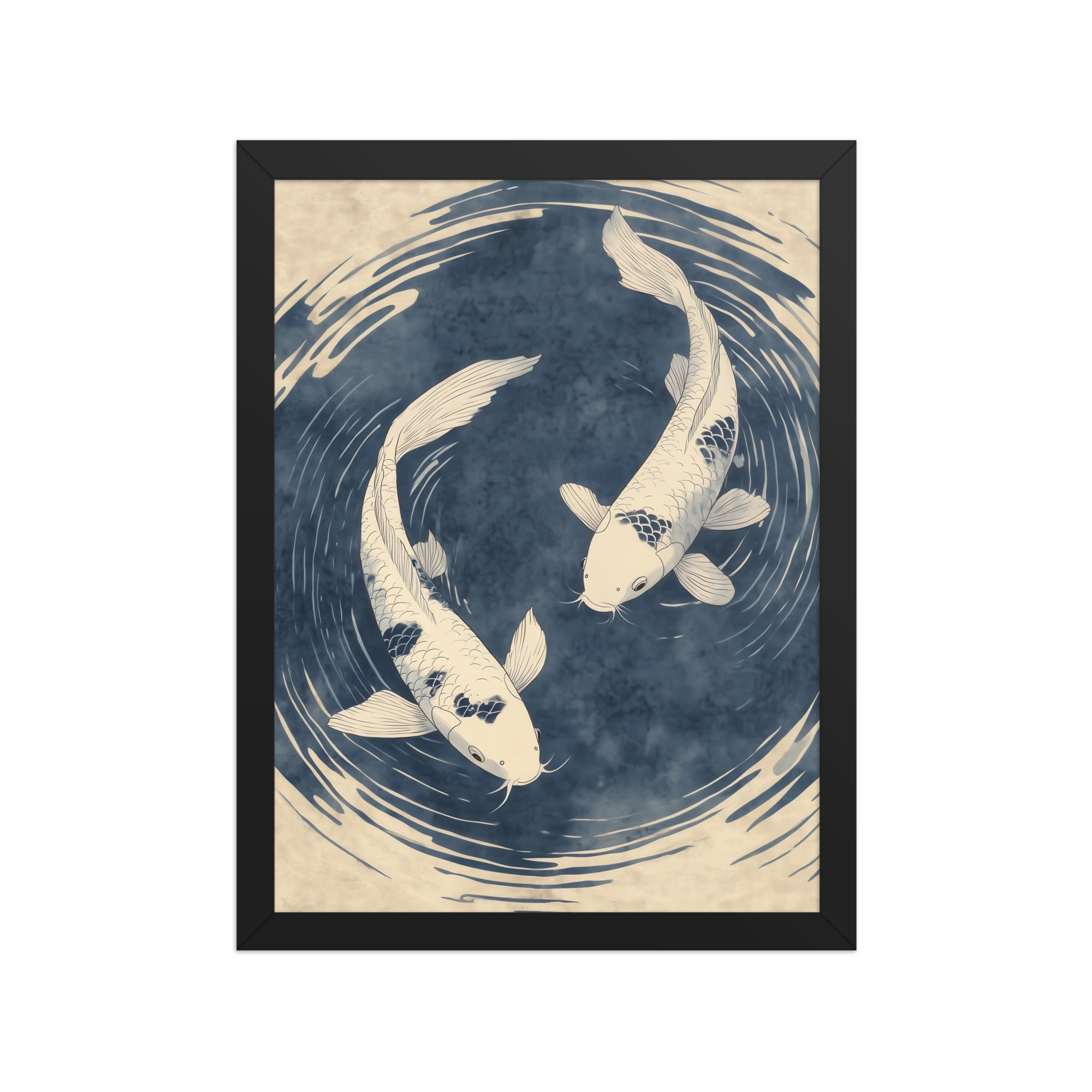 A paired koi duet drifts in a quiet circle, echoing yin–yang balance and renewal. Indigo washes over warm parchment tones for a refined, Japanese-inspired statement that fits effortlessly with Japandi interiors.