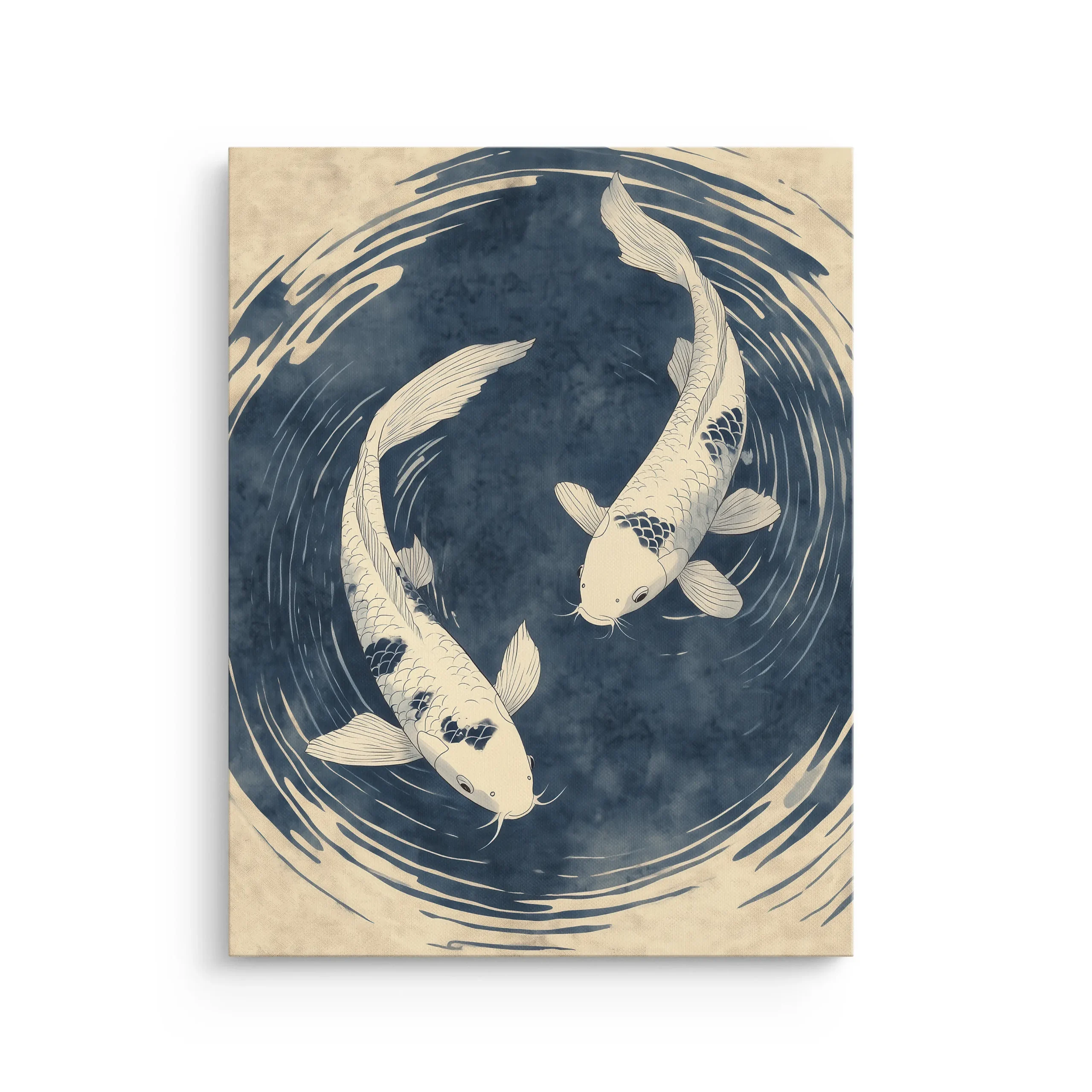 Two pale koi drift in a yin-yang rhythm through rich indigo water, framed by sweeping brushstroke ripples. The contrast of cream and navy creates a grounded, calming focal point that feels both Zen and modern.