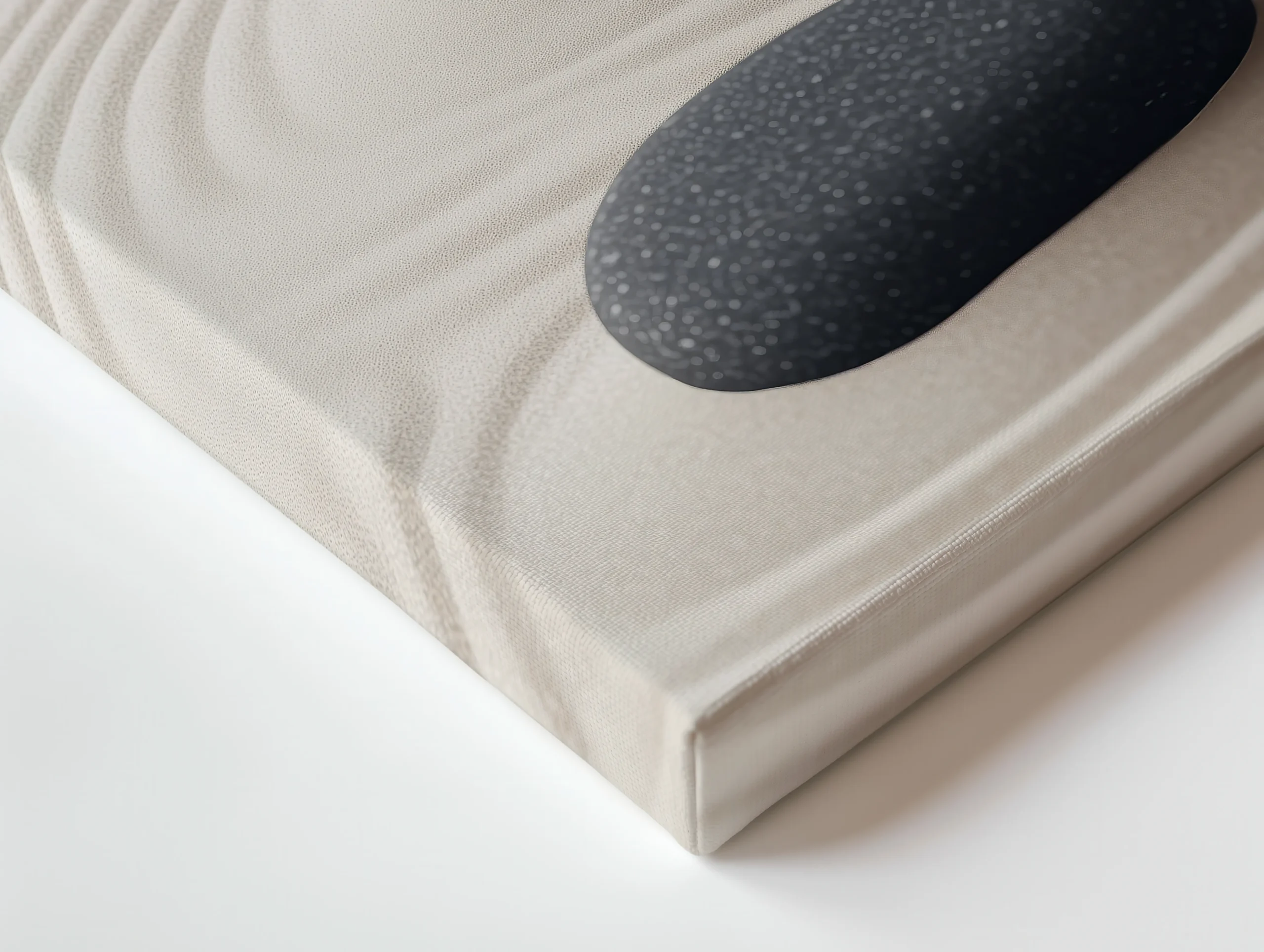 Four smooth stones float across softly raked sand, creating a quiet rhythm of balance and stillness. A minimal Zen-inspired composition designed to calm the room without adding visual noise.