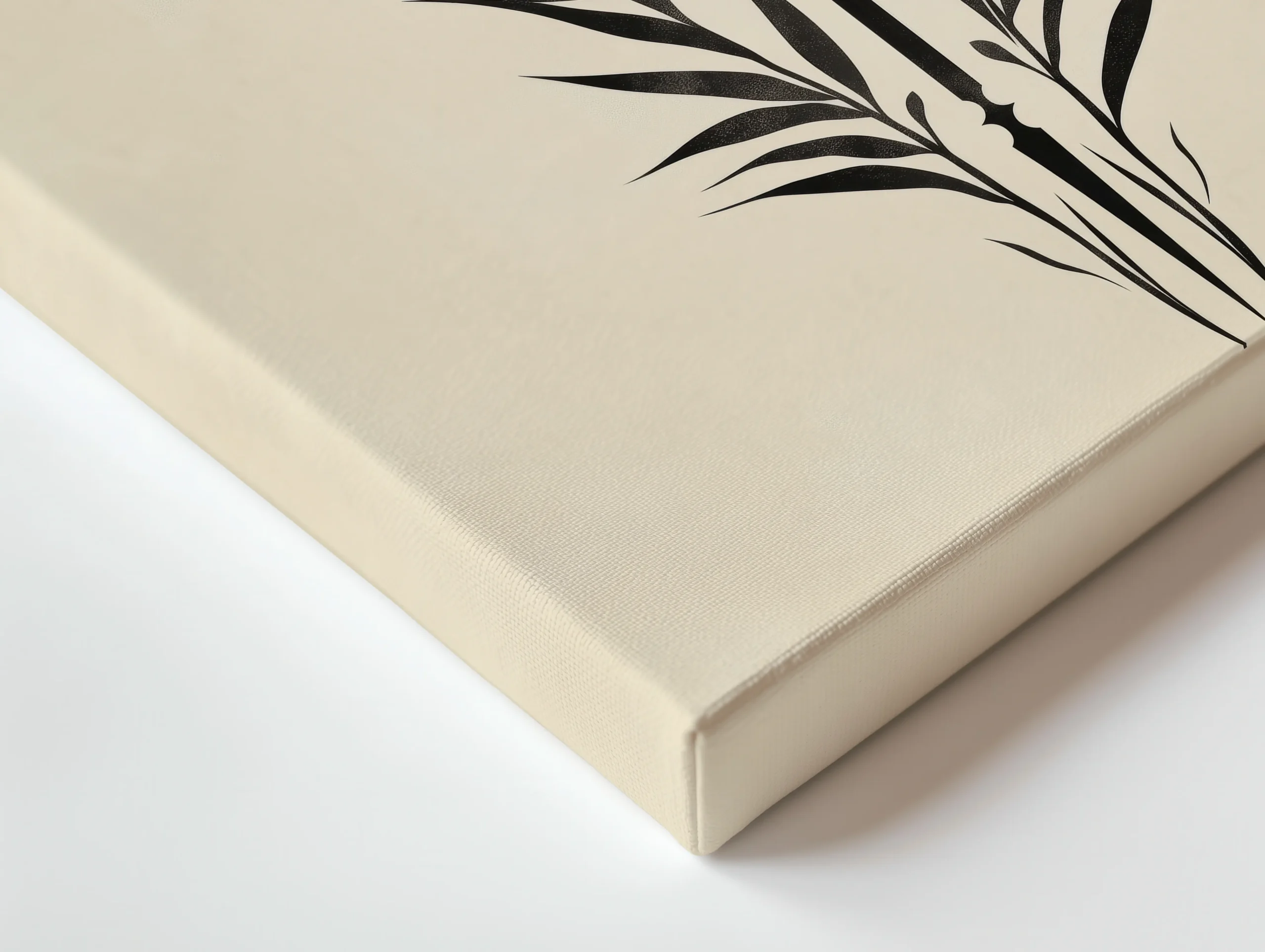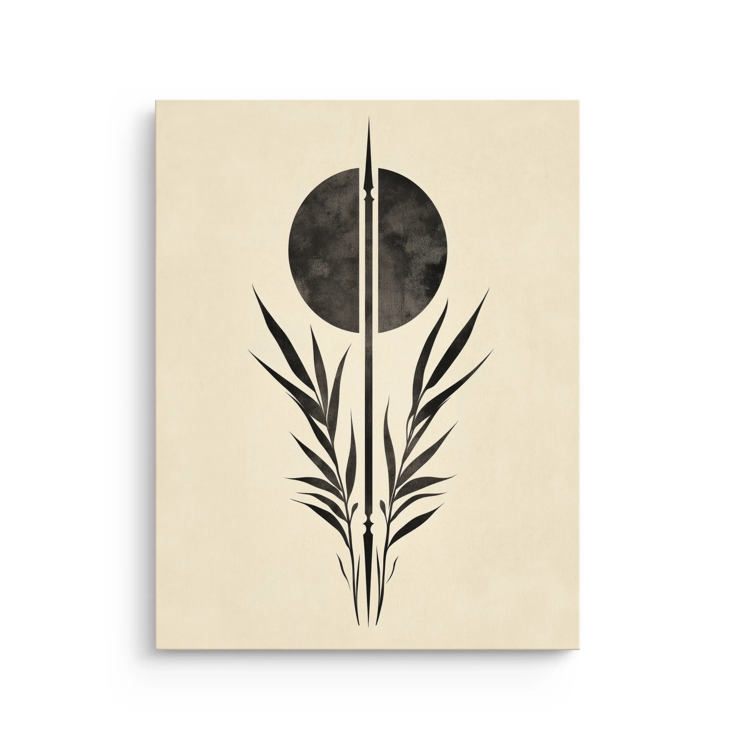 Minimal Zen botanical emblem with a bold black circle and graceful leaf silhouettes on warm ivory, printed on a premium thin canvas and ready to hang.