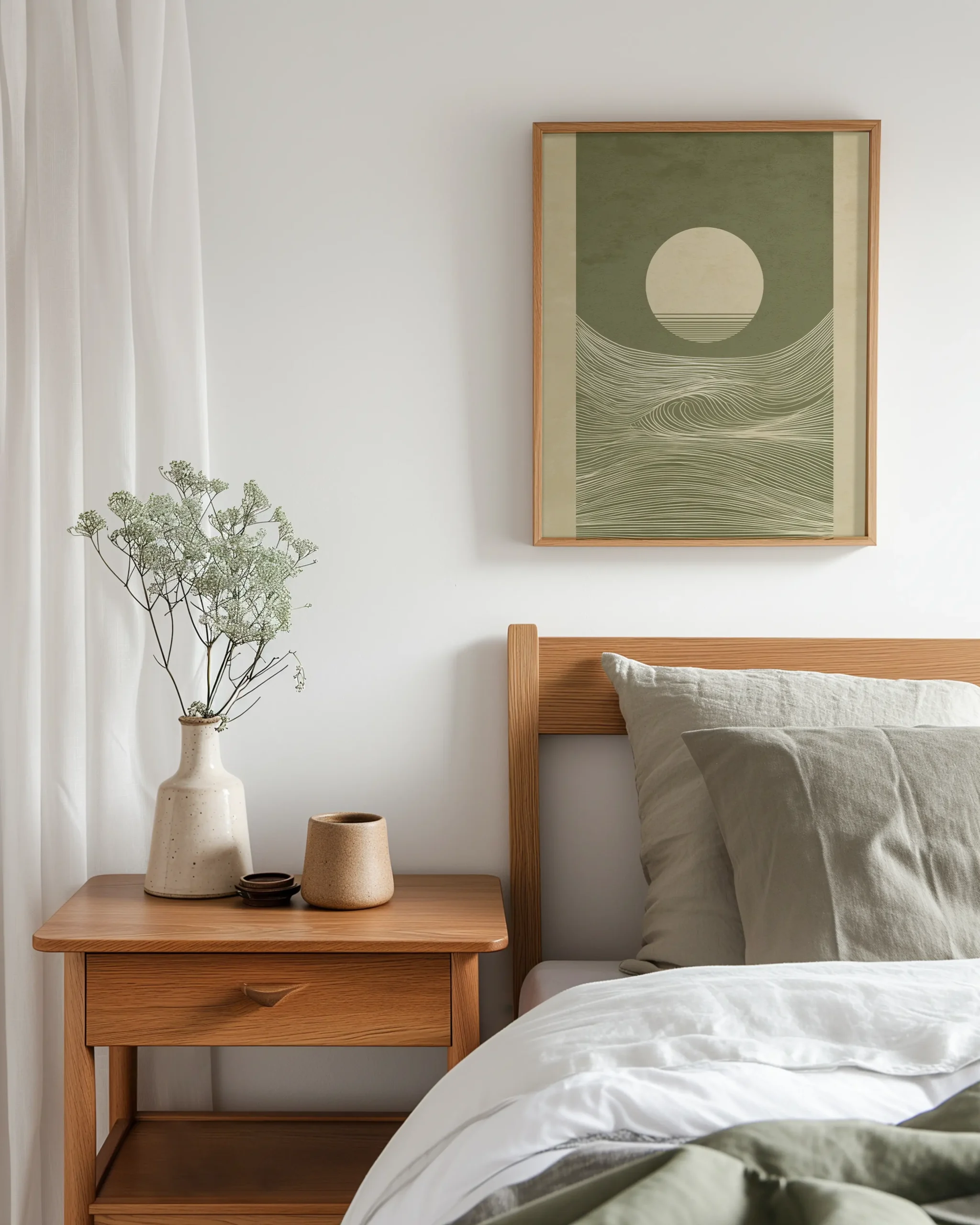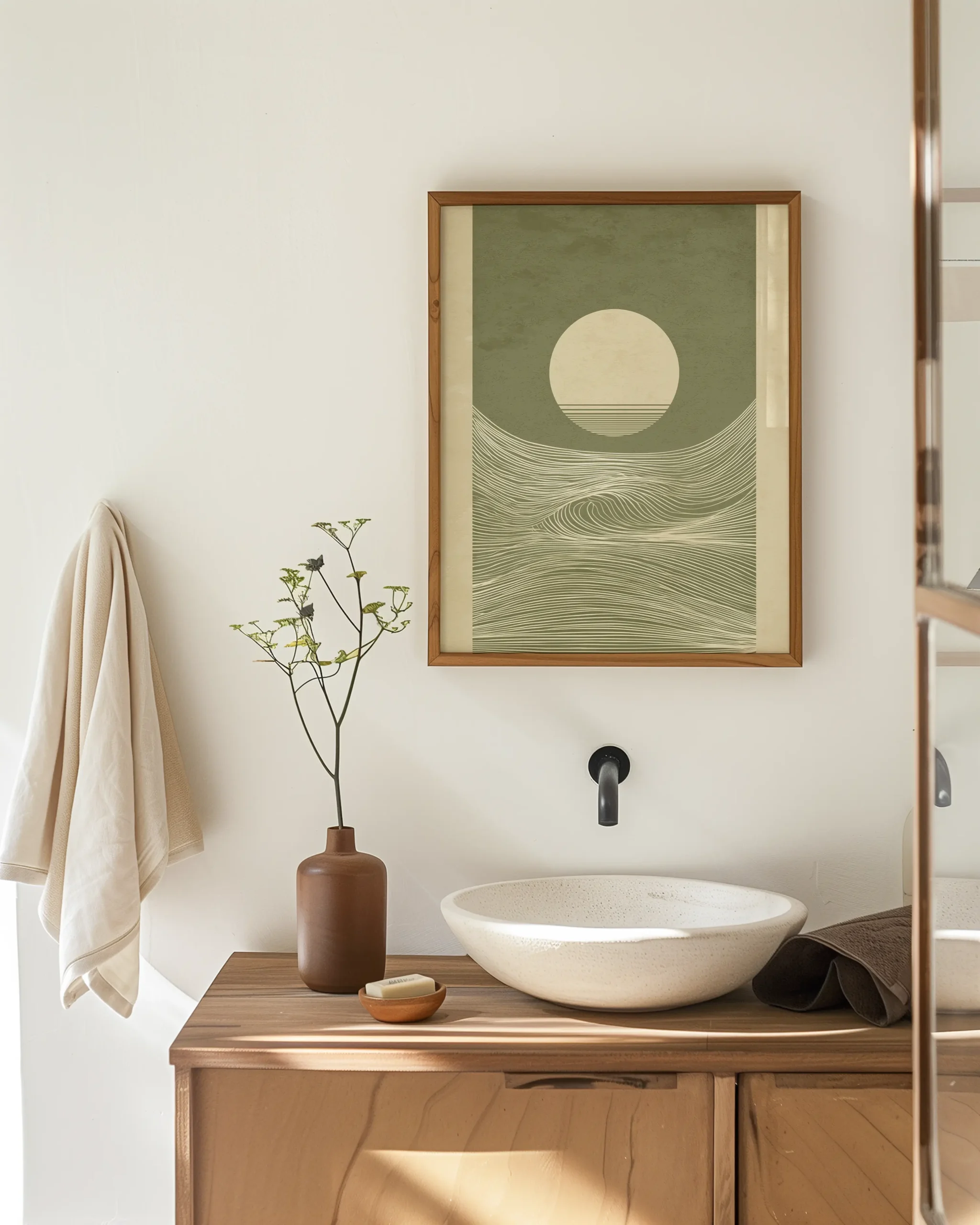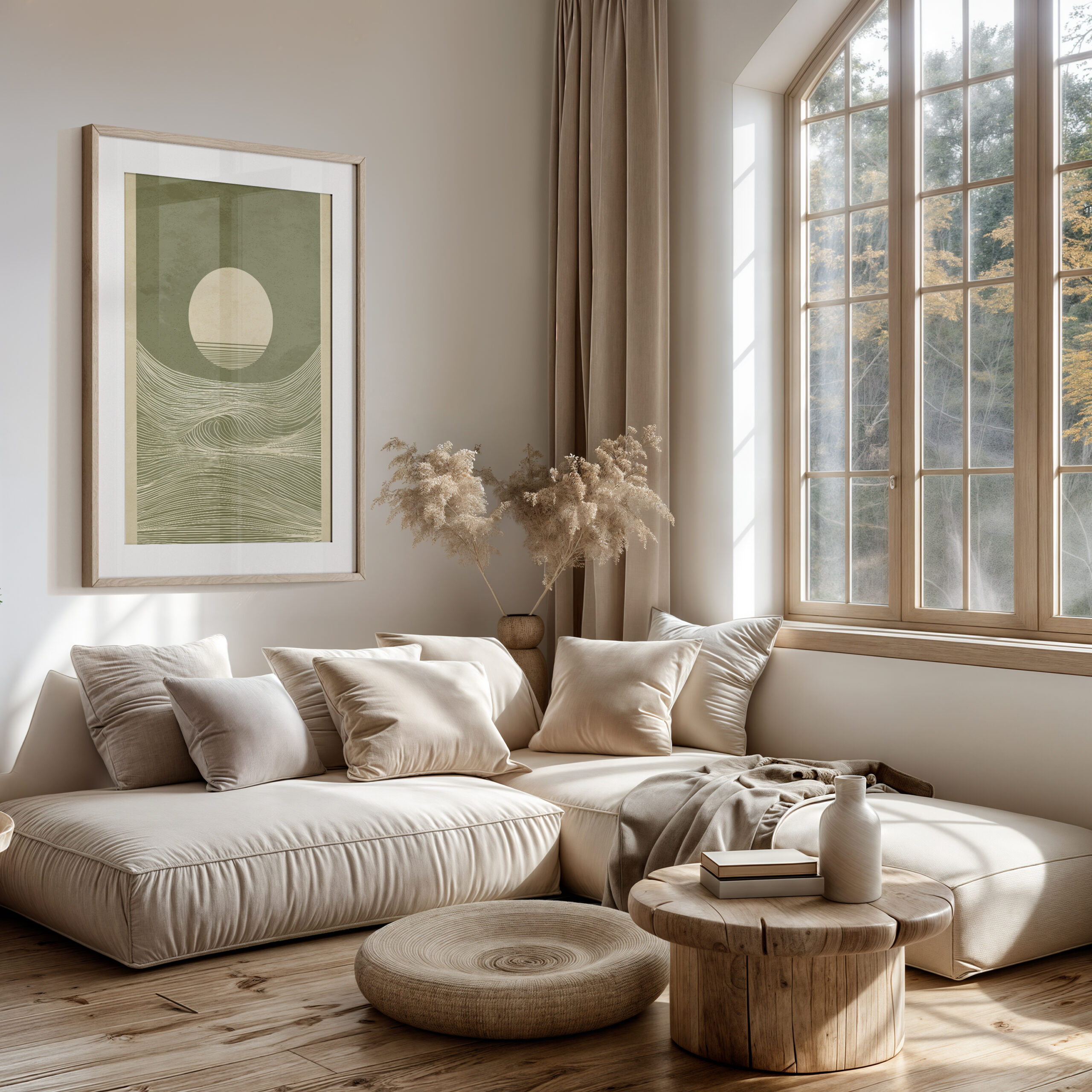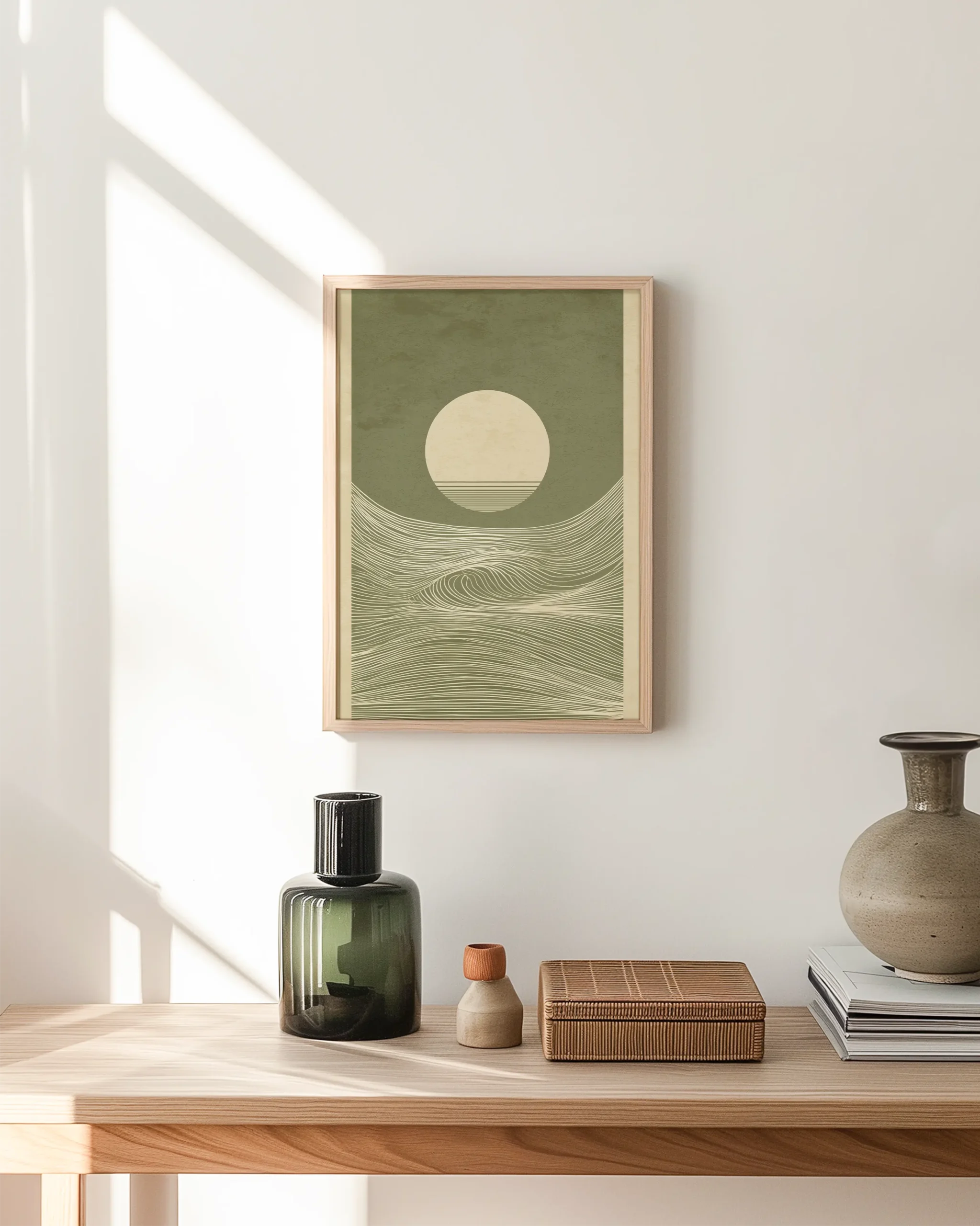 Zen Horizon Waves distills sunset calm into layered linework and soft, sage-green gradients. The gentle motion of the waves meets a tranquil sunset, creating a soothing focal point for minimalist, Japandi-inspired interiors.