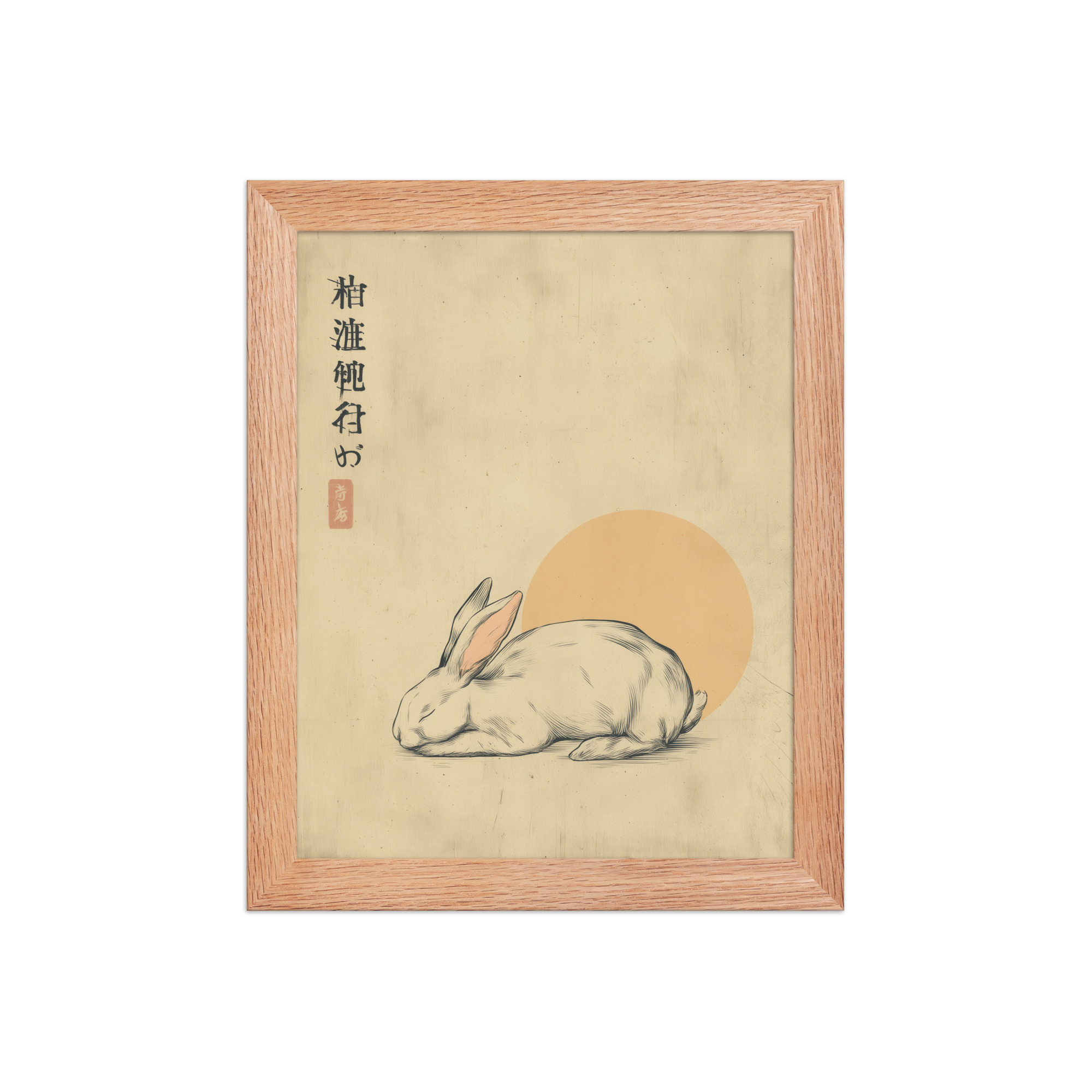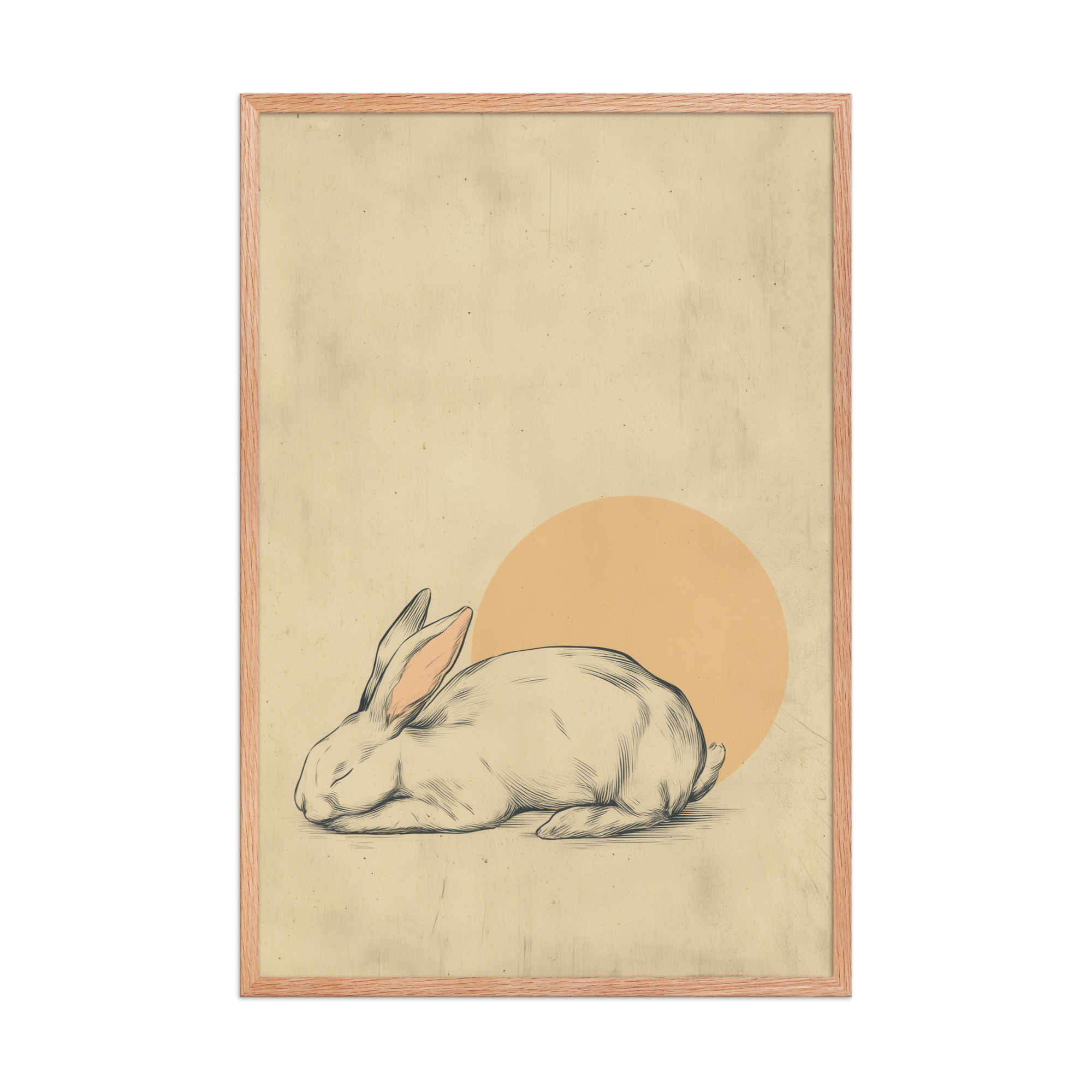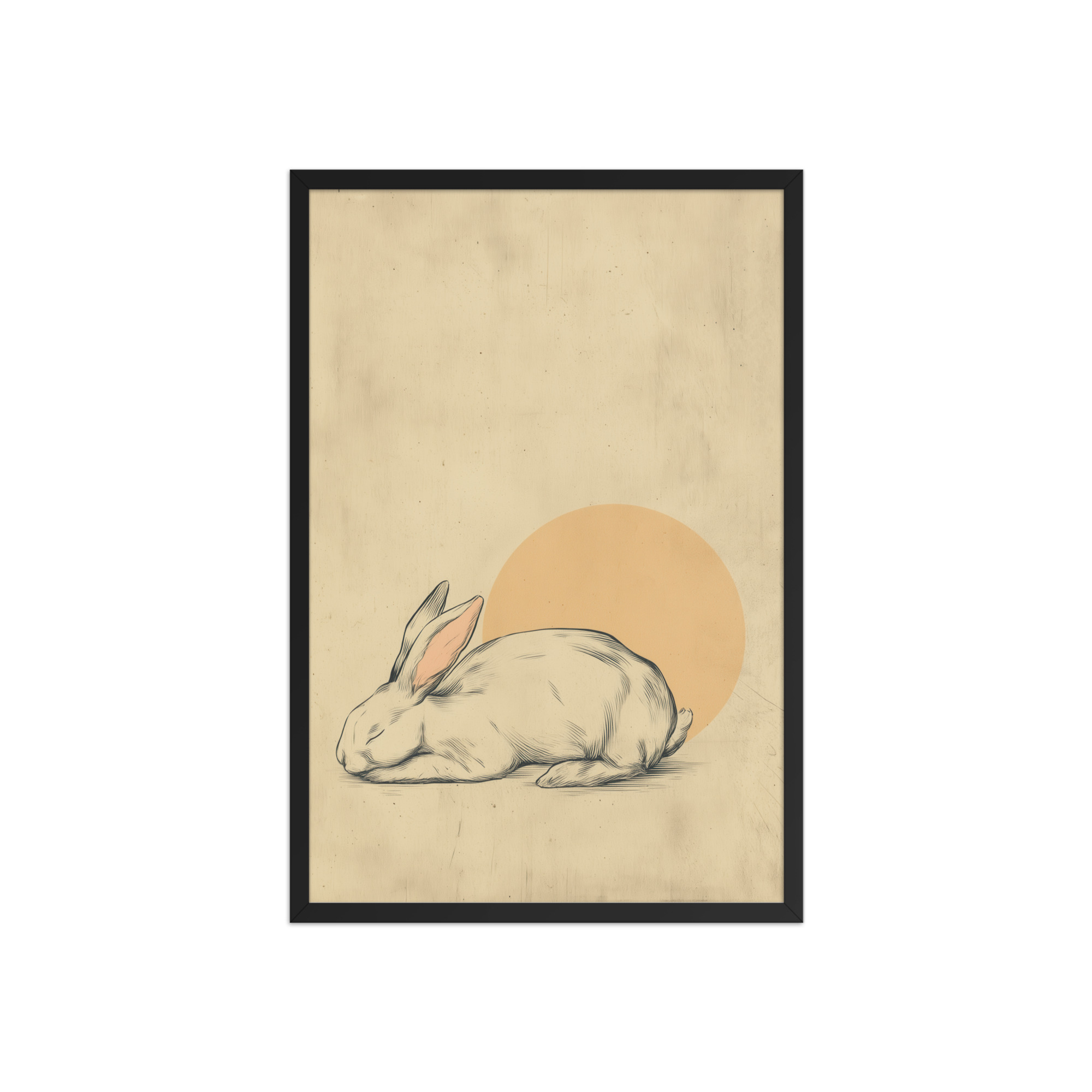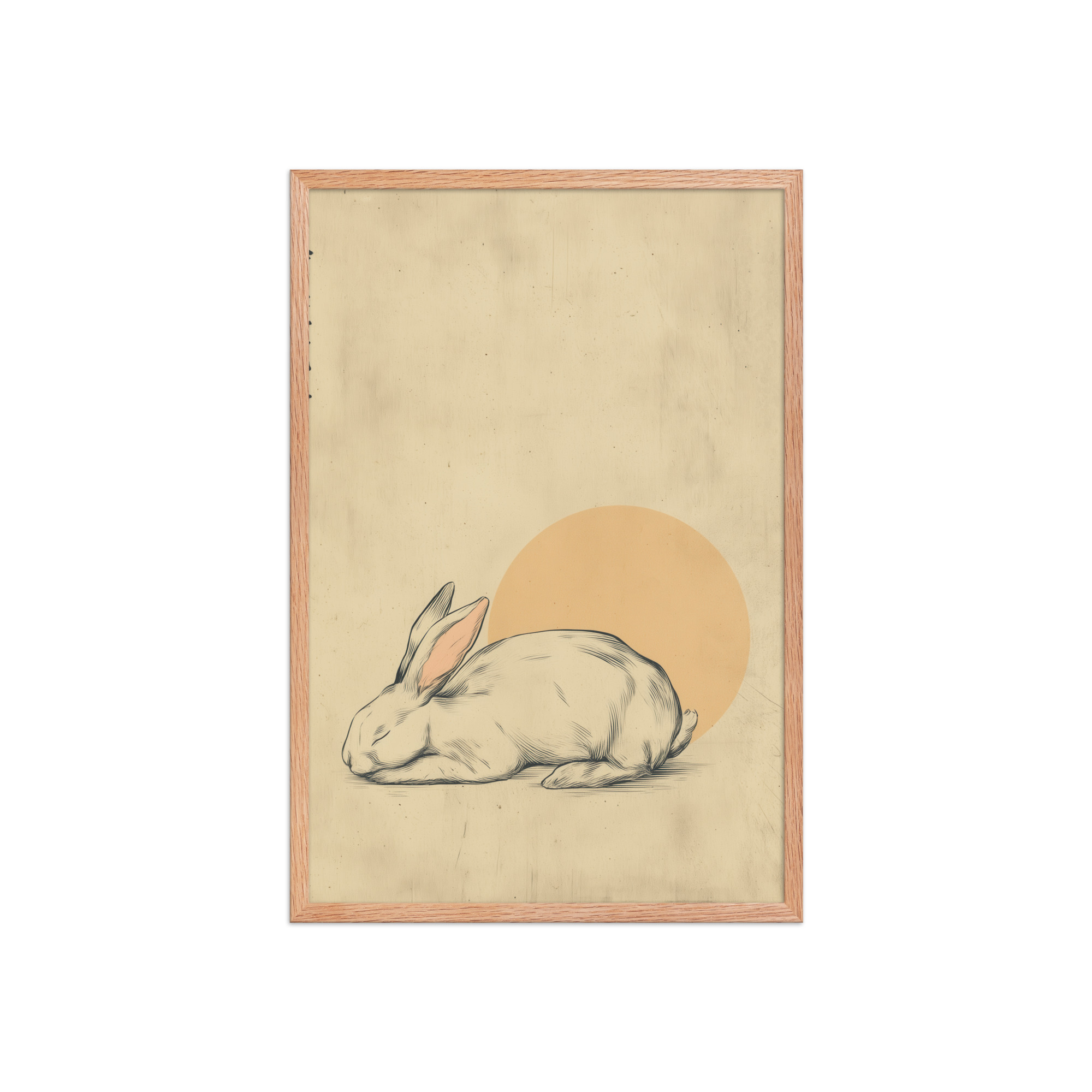 A serene line-drawn rabbit rests before a soft rising sun on warm parchment tones, printed on museum-quality enhanced matte paper. Framed and ready to hang with your preferred frame (Black, White, or Red Oak).