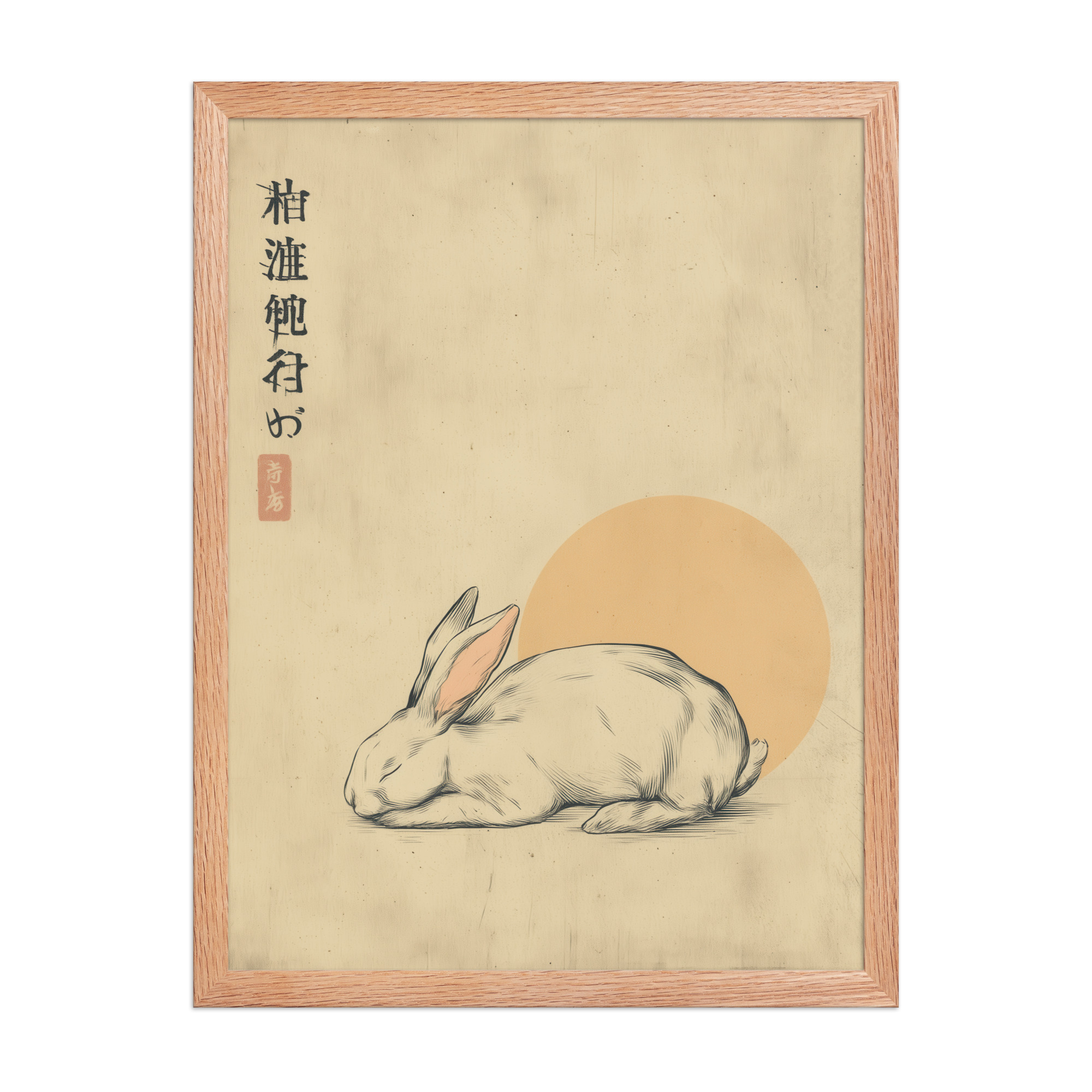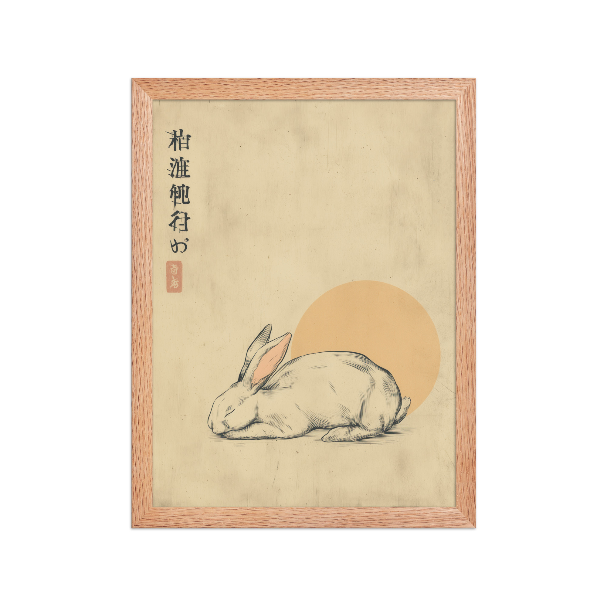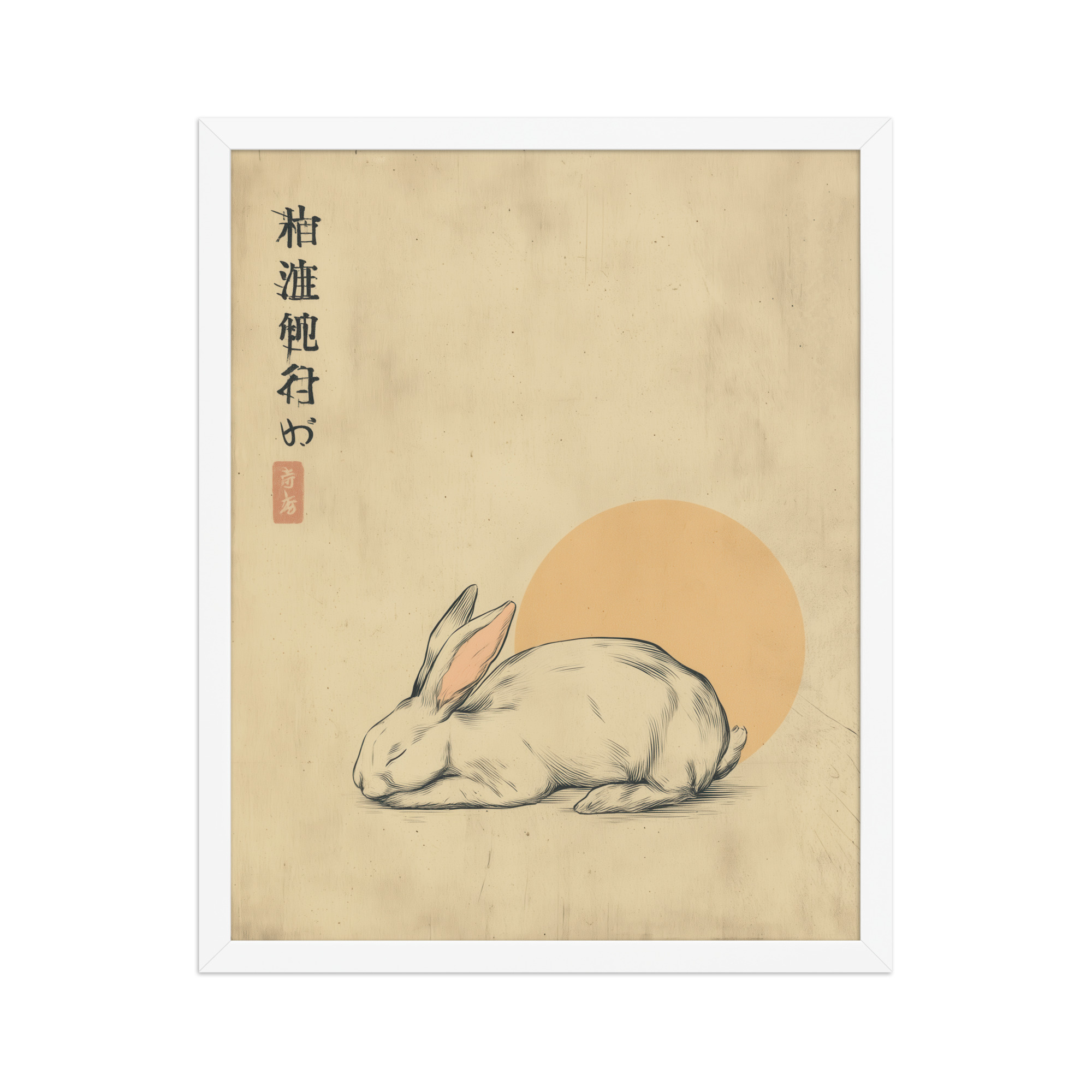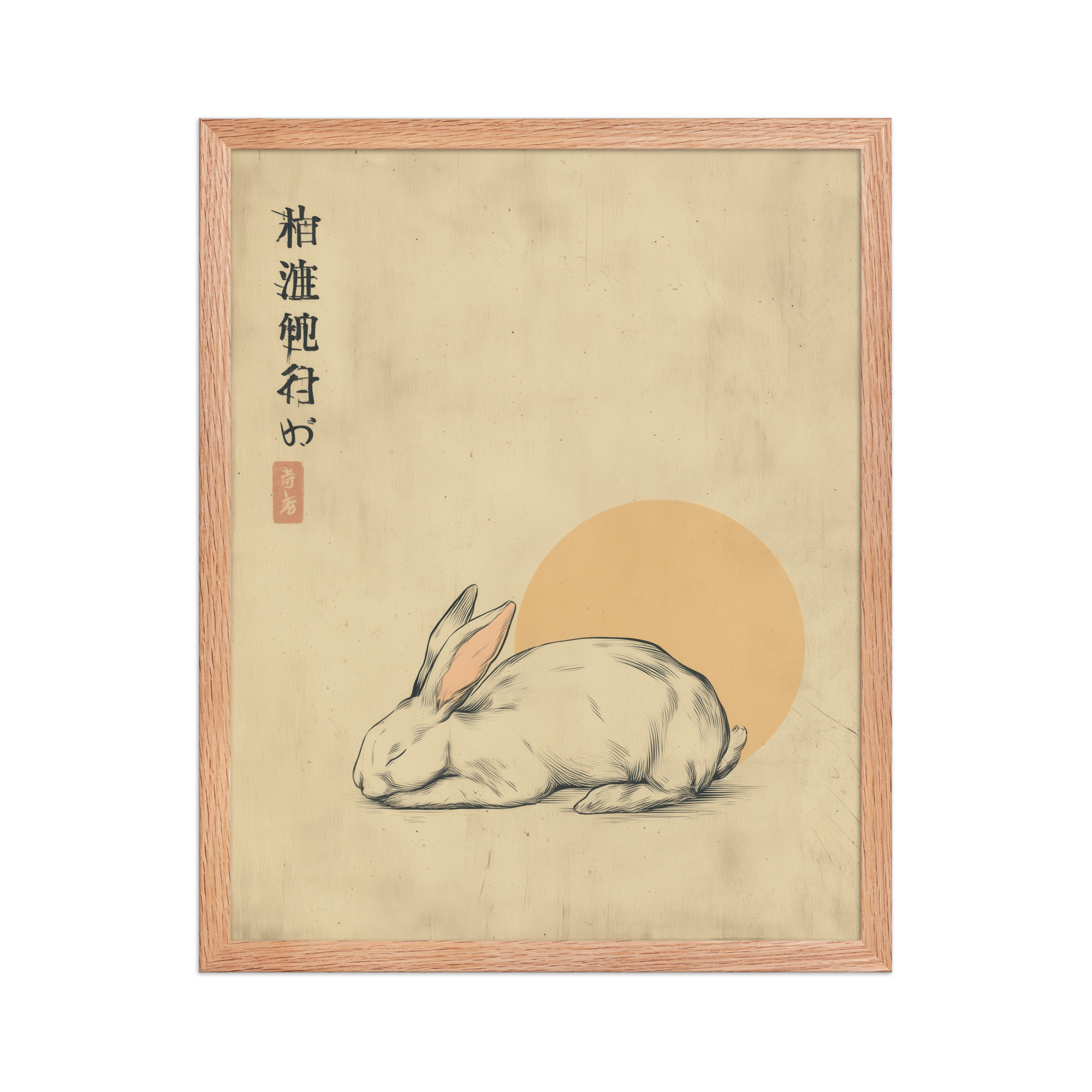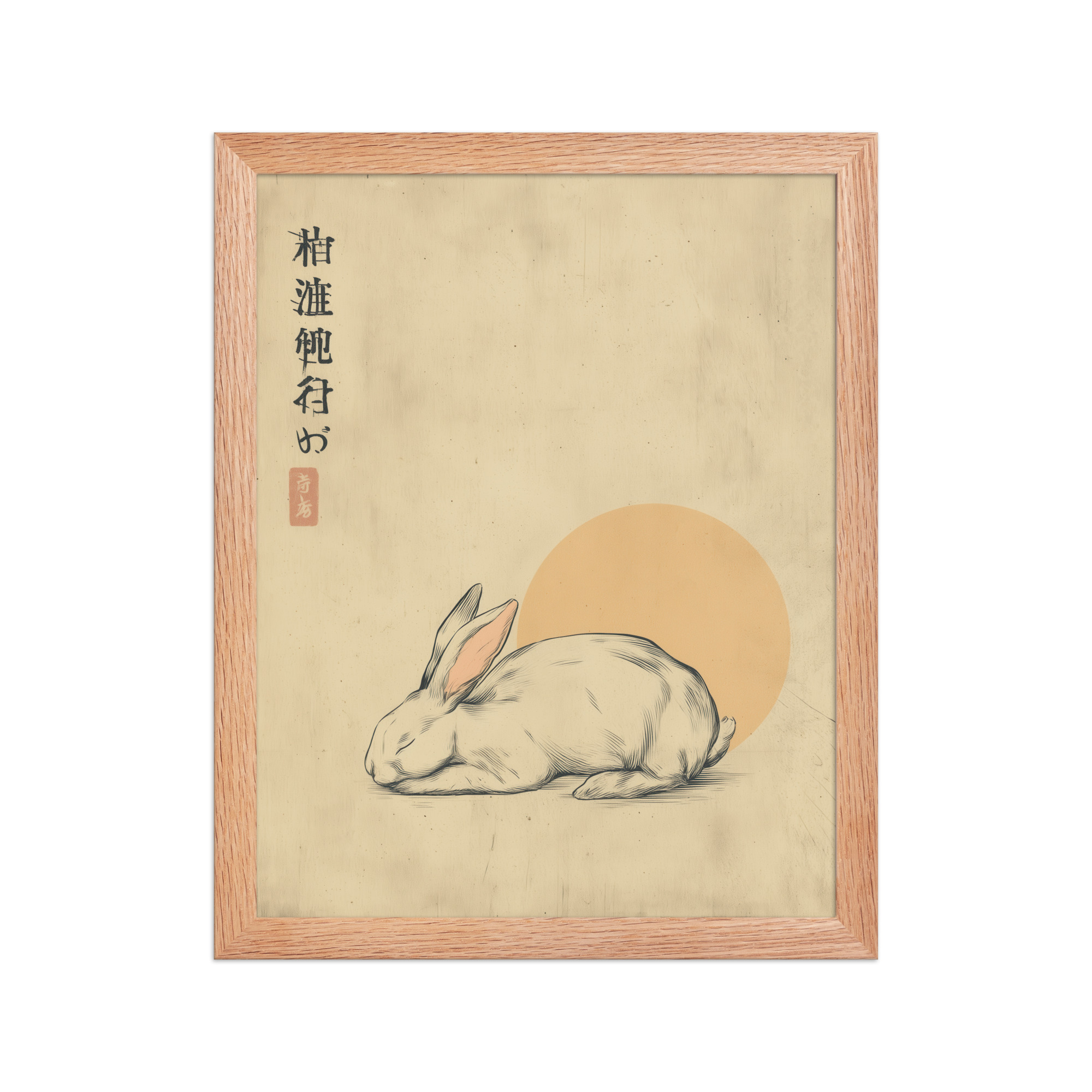 A serene line-drawn rabbit rests before a soft rising sun on warm parchment tones, printed on museum-quality enhanced matte paper. Framed and ready to hang with your preferred frame (Black, White, or Red Oak).