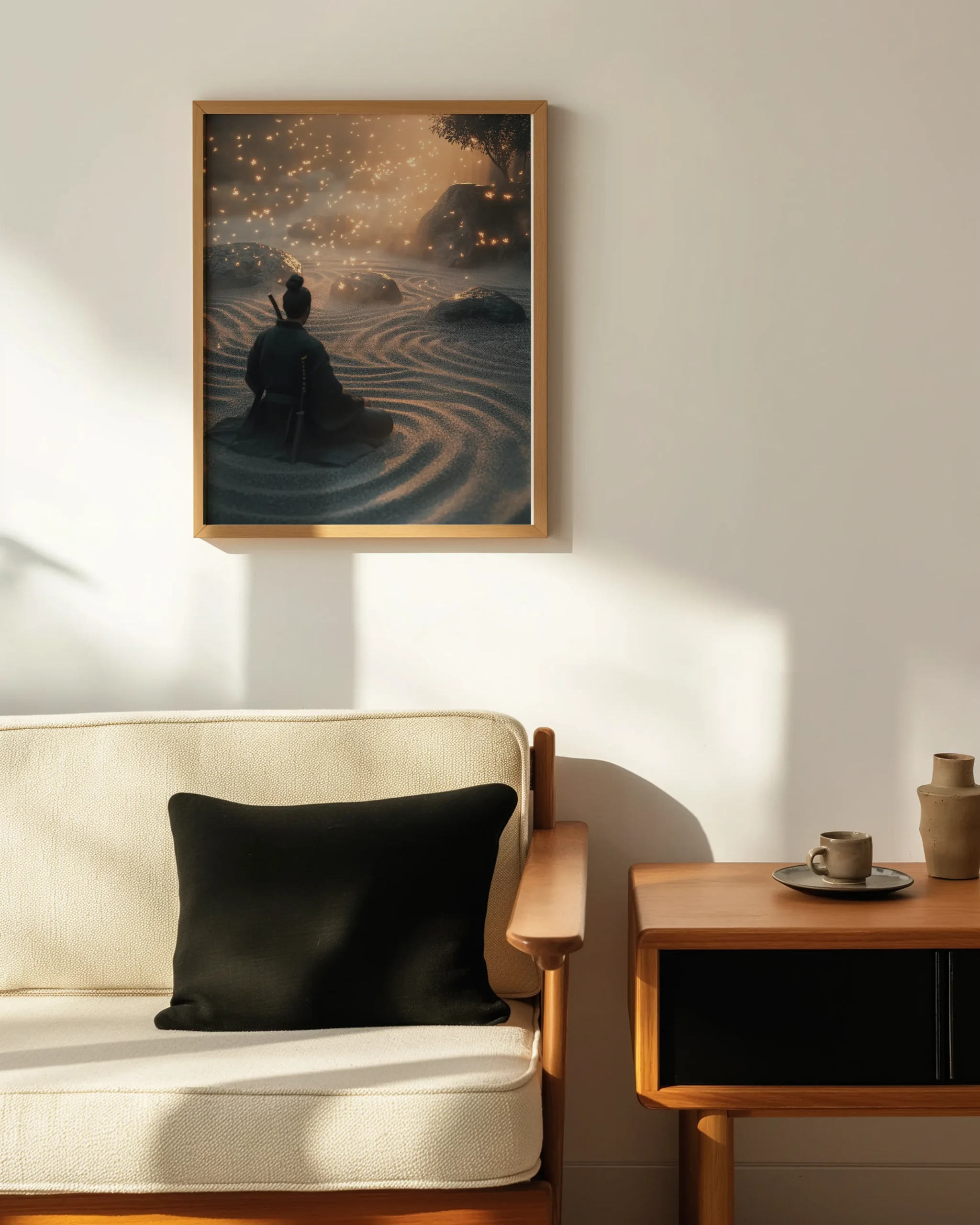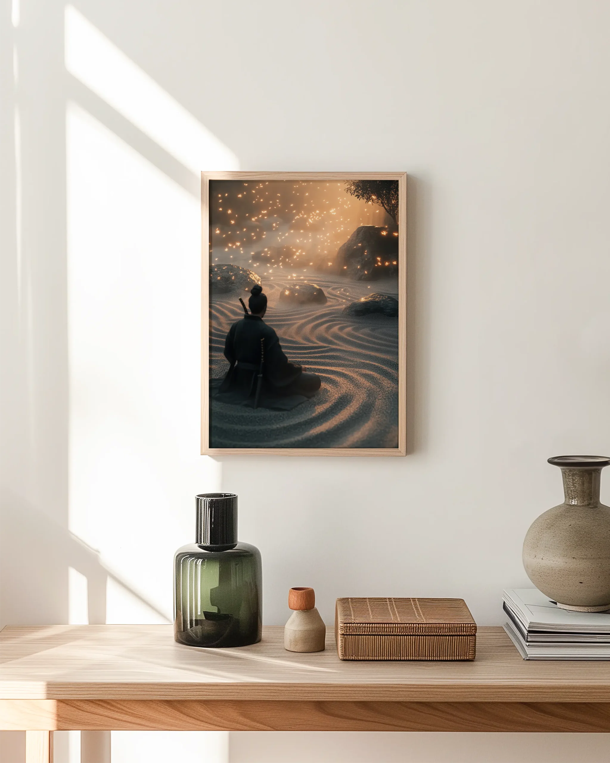 Atmospheric Japandi wall art of a meditative samurai seated in a raked zen garden illuminated by drifting fireflies—printed on museum-quality enhanced matte paper. Framed and ready to hang with your preferred frame (Black, White, or Red Oak).