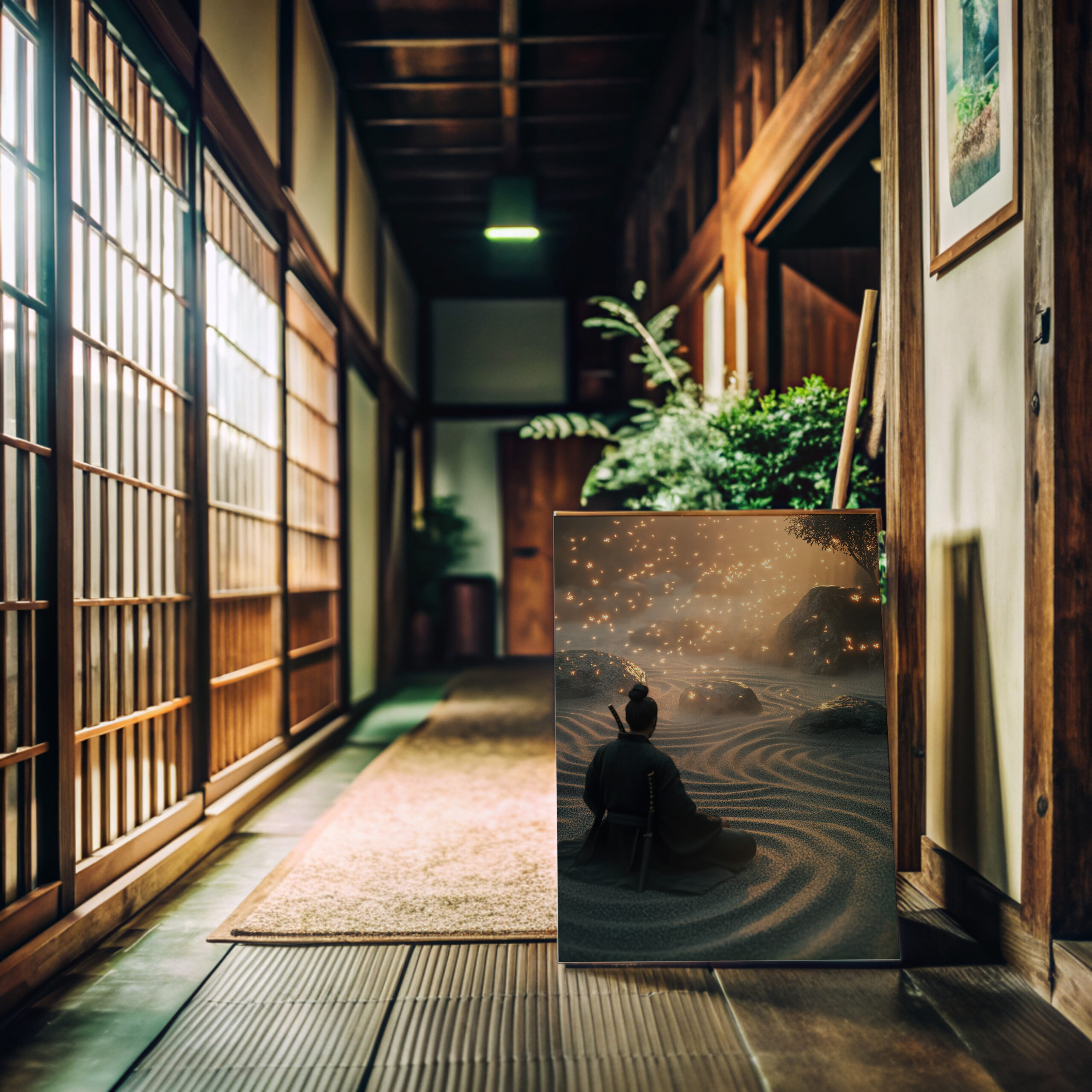 Zen Samurai – Fireflies in Zen Garden Japandi Samurai Wall Art – Framed Poster